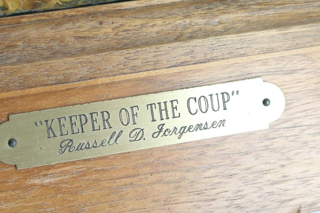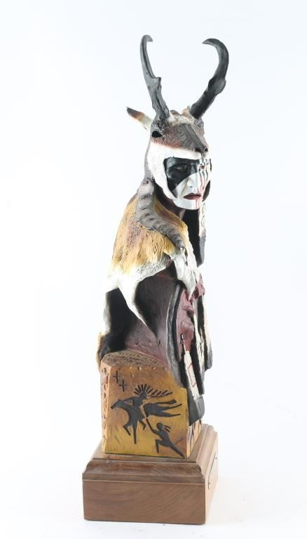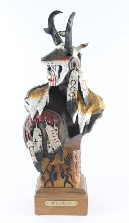 By Russel Jorgensen entitled "Keeper Of Coup" measuring 21.5x6" on wood base, showing damage to ear on headdress and other small losses.