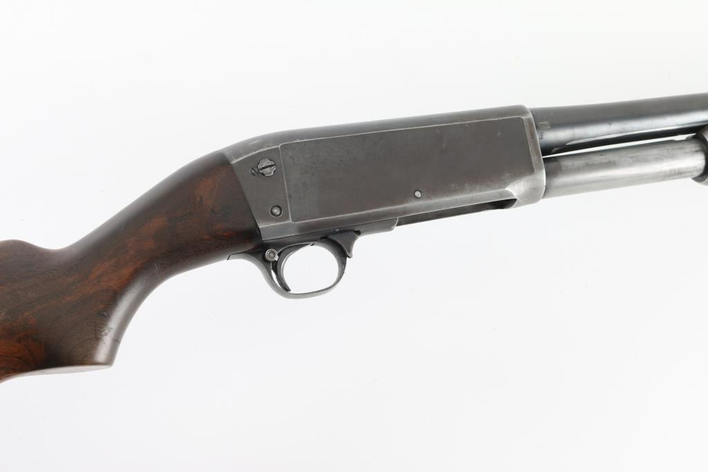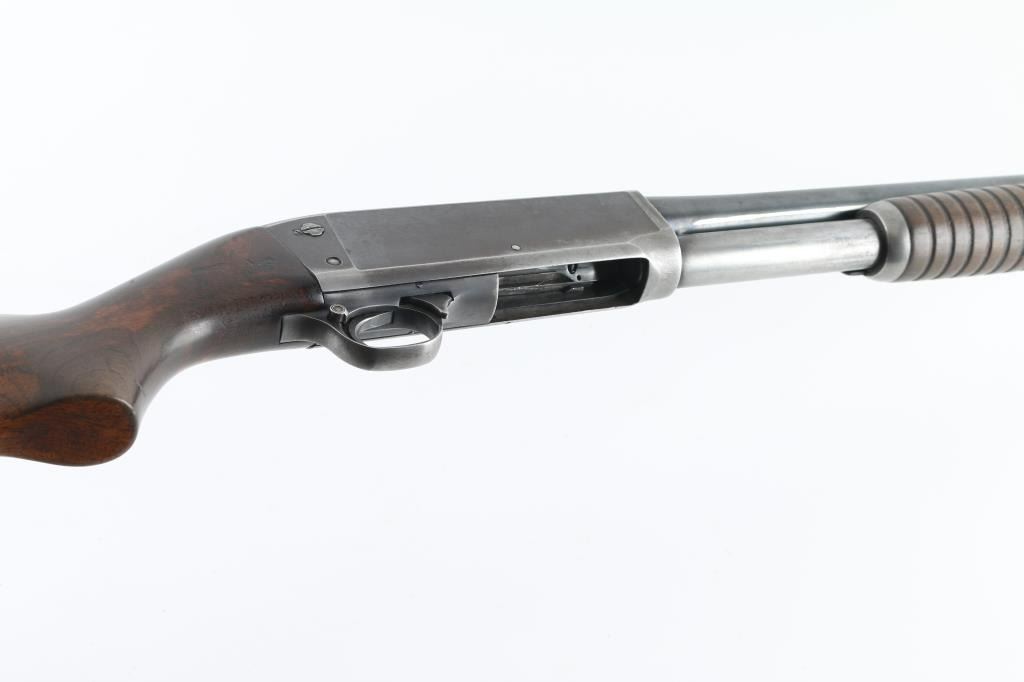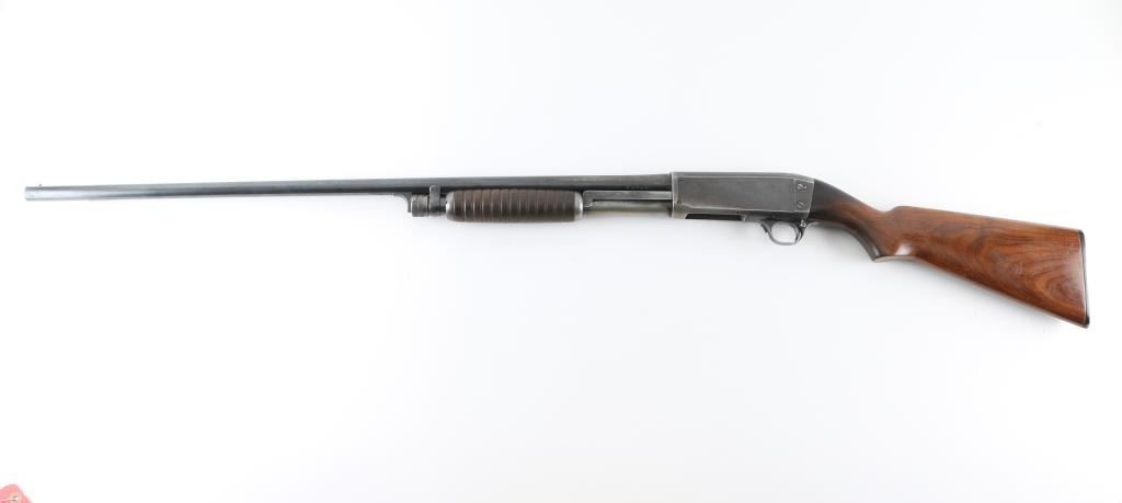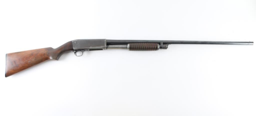 Pump action shotgun with barrel date code indicating manufacture circa 1929. Features blued finish, grooved wood pump handle, smooth wood semi-pistol grip shoulder stock, grooved hard rubber buttplate, pushbutton safety, solid receiver with bottom ejection, 30" plain barrel, Full choke, steel bead front sight. Bore is good condition, might improve with a good cleaning. Retains 40% finish, most retained dark color is on barrel, with discoloration and patina on receiver, wear areas from moving parts, edge losses. Wood is very good overall with scratches and some finish loss. Barrel numbered to frame. Markings are crisp. Screw slots show marring. Condition is NRA Good++ *** C&R Firearm ***