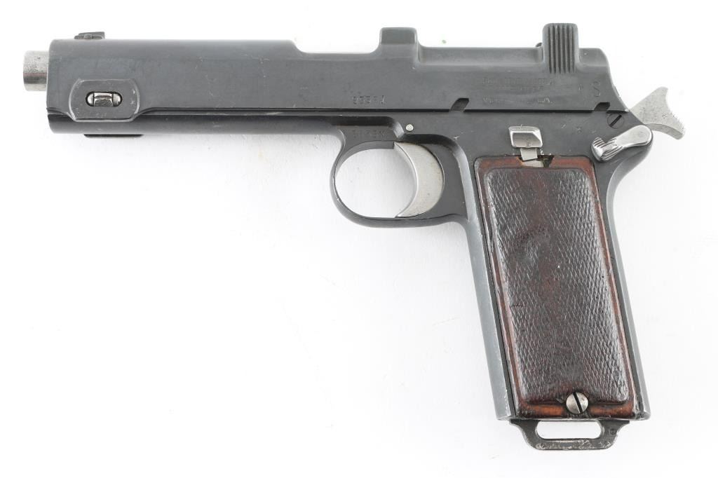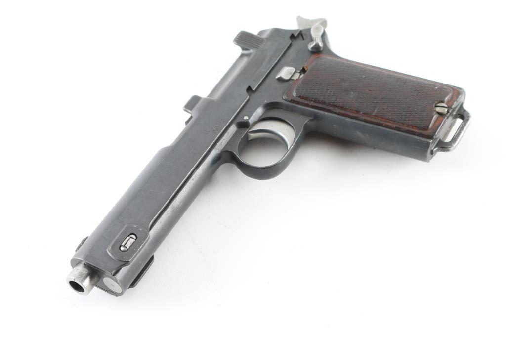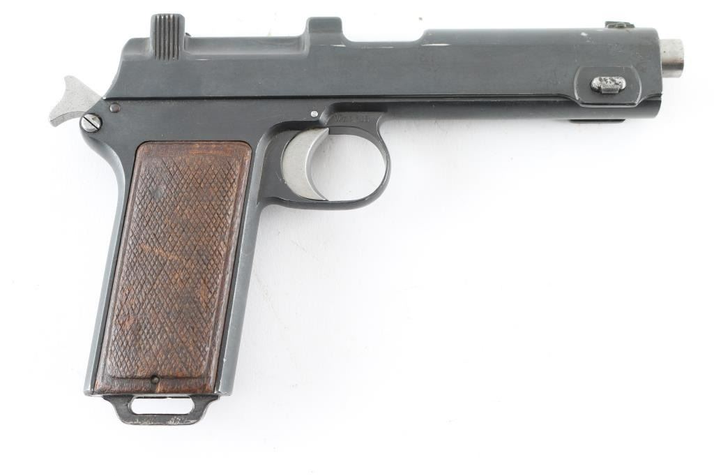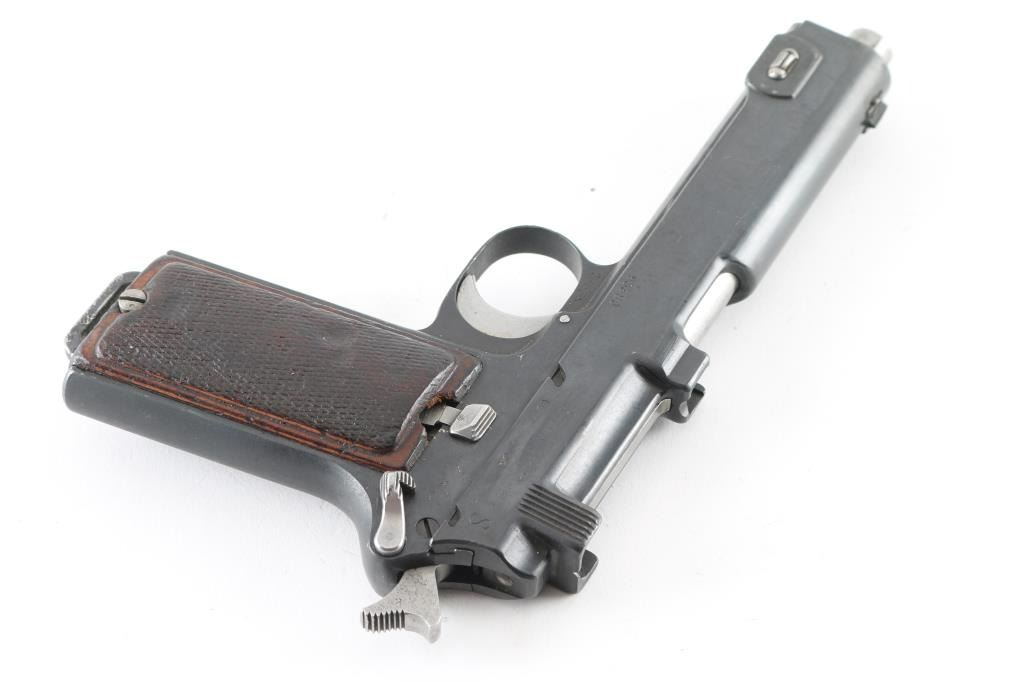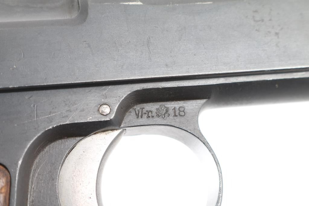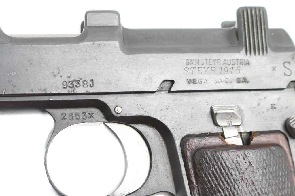 ***Mechanical Problem*** Austrian military single action semi-automatic service pistol manufactured circa 1915, imported by Vega, Sacramento CA. Features a blued finish, 5.1" barrel, dovetailed inverted 'v' front sight, 'v' notched rear sight, smooth trigger, serrated hammer spur, thumb safety/slide catch on the left side of the frame, internal 8 round magazine, integral stripper clip guide cuts in the slide, lanyard loop on the butt and two-piece checkered walnut grips. Marked "W-n (eagle) 18" above trigger on right side of frame. Slide numbered "9338J". Bore is good to very good condition, showing lightly frosted appearance throughout. Retains 85% matte re-blue, with some slight erosion of markings, edge losses, several small areas of light pitting. Trigger, hammer, barrel, safety & several other small parts are brushed finish bare metal, in very good condition. Grips are solid, fair to good, showing smoothed gouges, loss to checkering points. Depressing trigger does not release hammer. Hammer must be manually withdrawn slightly to allow moving safety lever to "safe", hammer will drop when safety taken "off". ***Unsafe Condition requires repair*** Condition is NRA Poor (Repair Required) ***C&R Firearm***