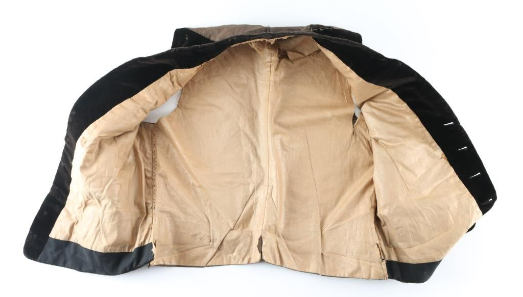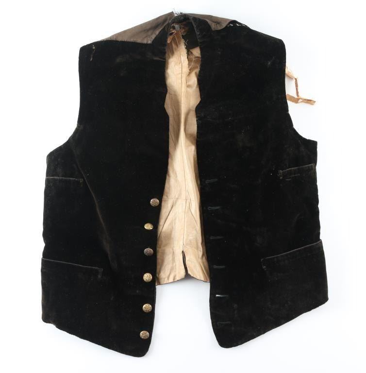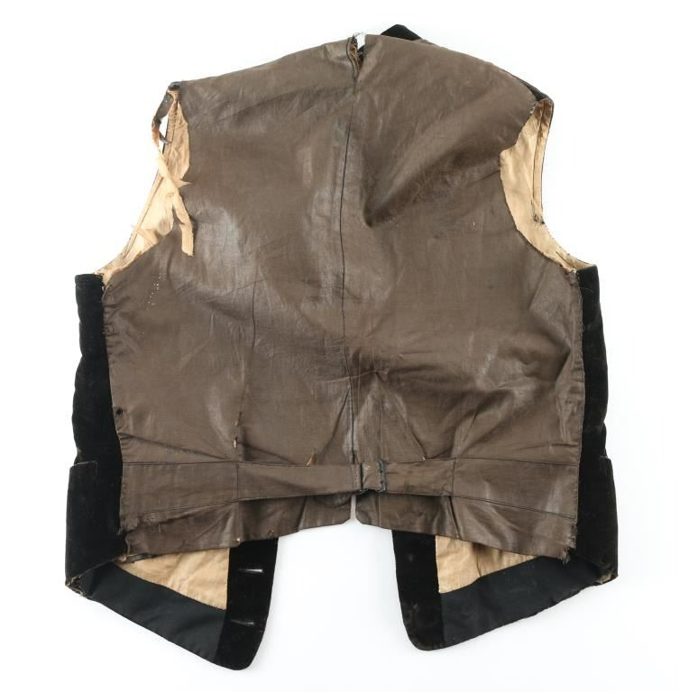 Very high quality 4 pocket vest, with 6 small eagle buckles of officers style. Imprinted on the back of the silk lining. The velvet front is good. The silk interior is torn and shows some repairs torn and shows some repairs civil war to indian war era.