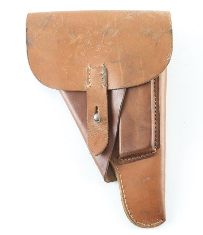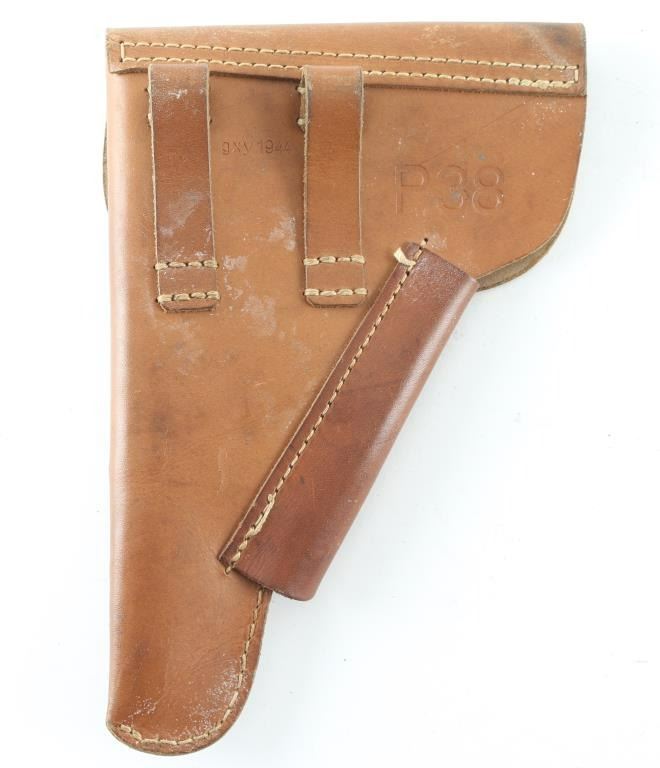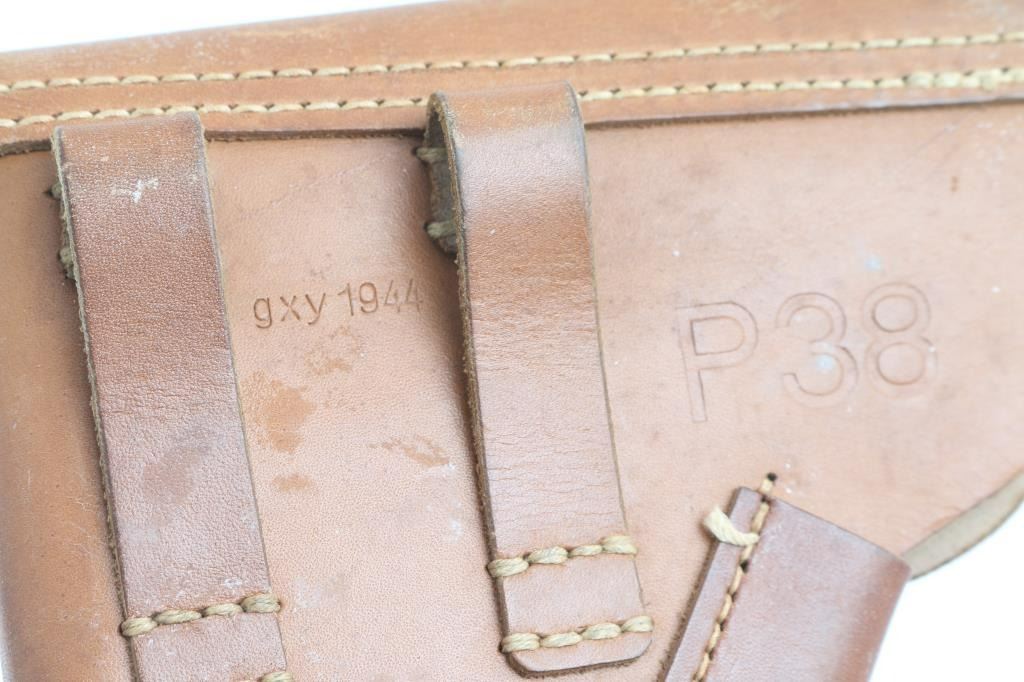 Third Reich era German Military/Police holster for the P-38 Pistol. Soft shell. Russet brown leather construction. Large "P.38" stamped on back, along makers code gxy, dated 1944, no waffenamt. Intact, very good condition.