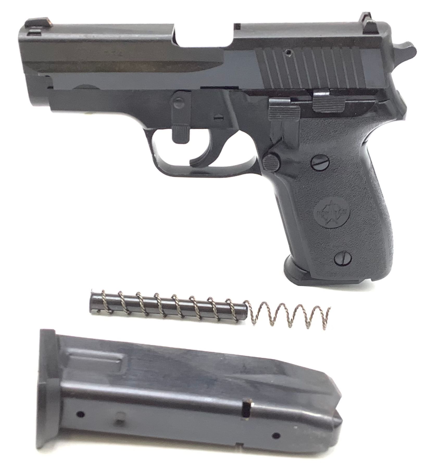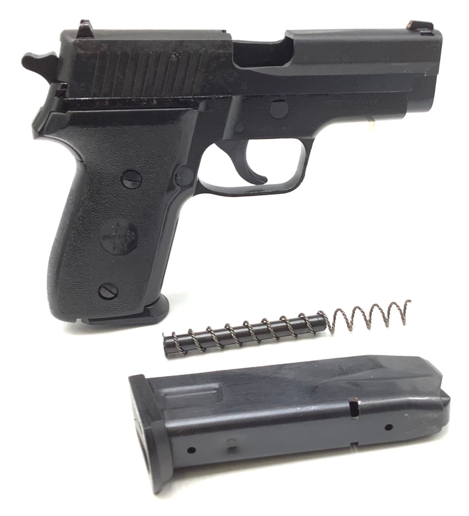 A used Norinco NP34 P228 clone semi-automatic pistol parts gun. No barrel, missing parts. Comes with a spare magazine for a total of 2 magazines. This is a parts gun.