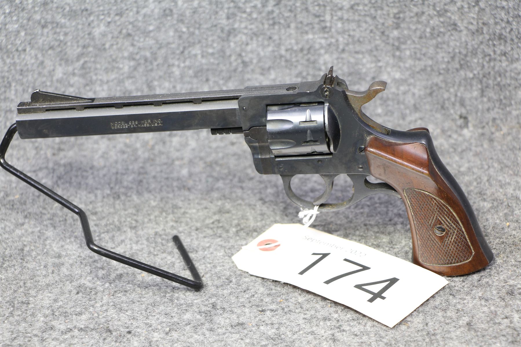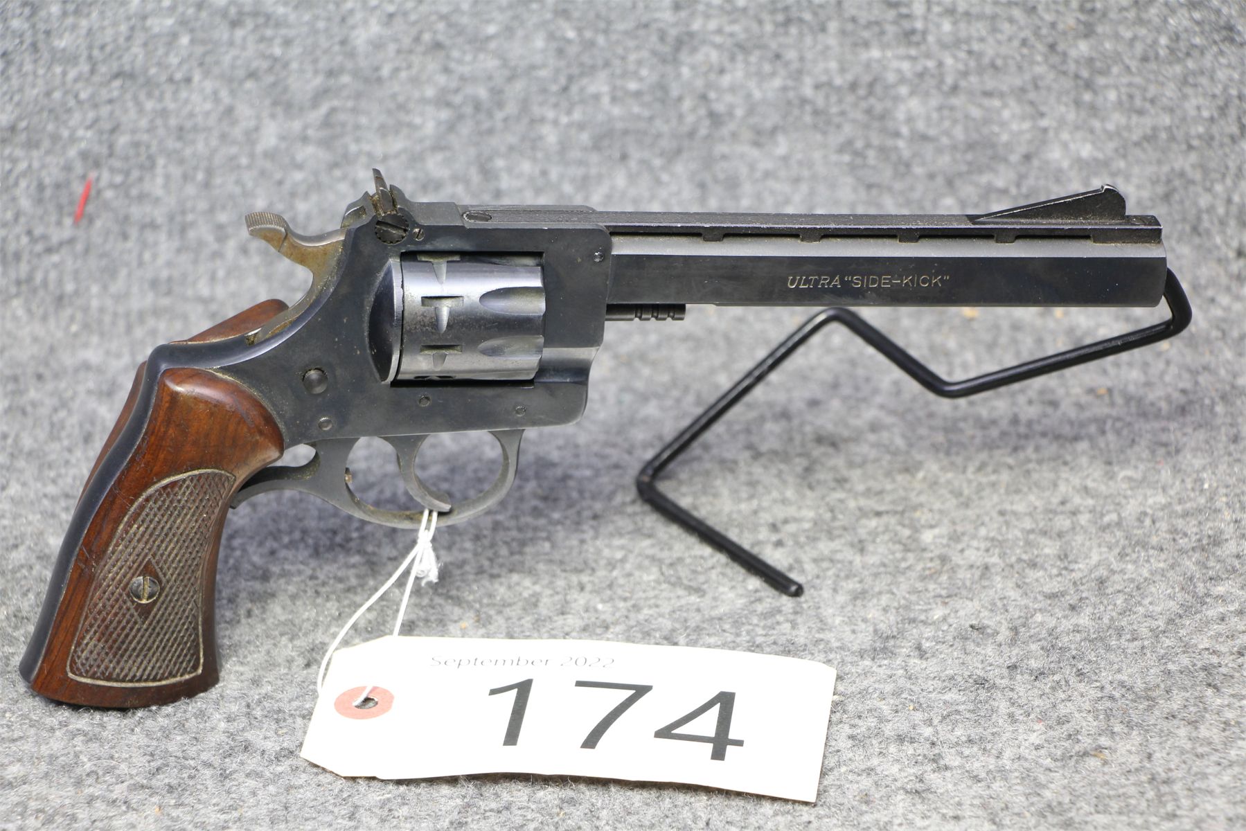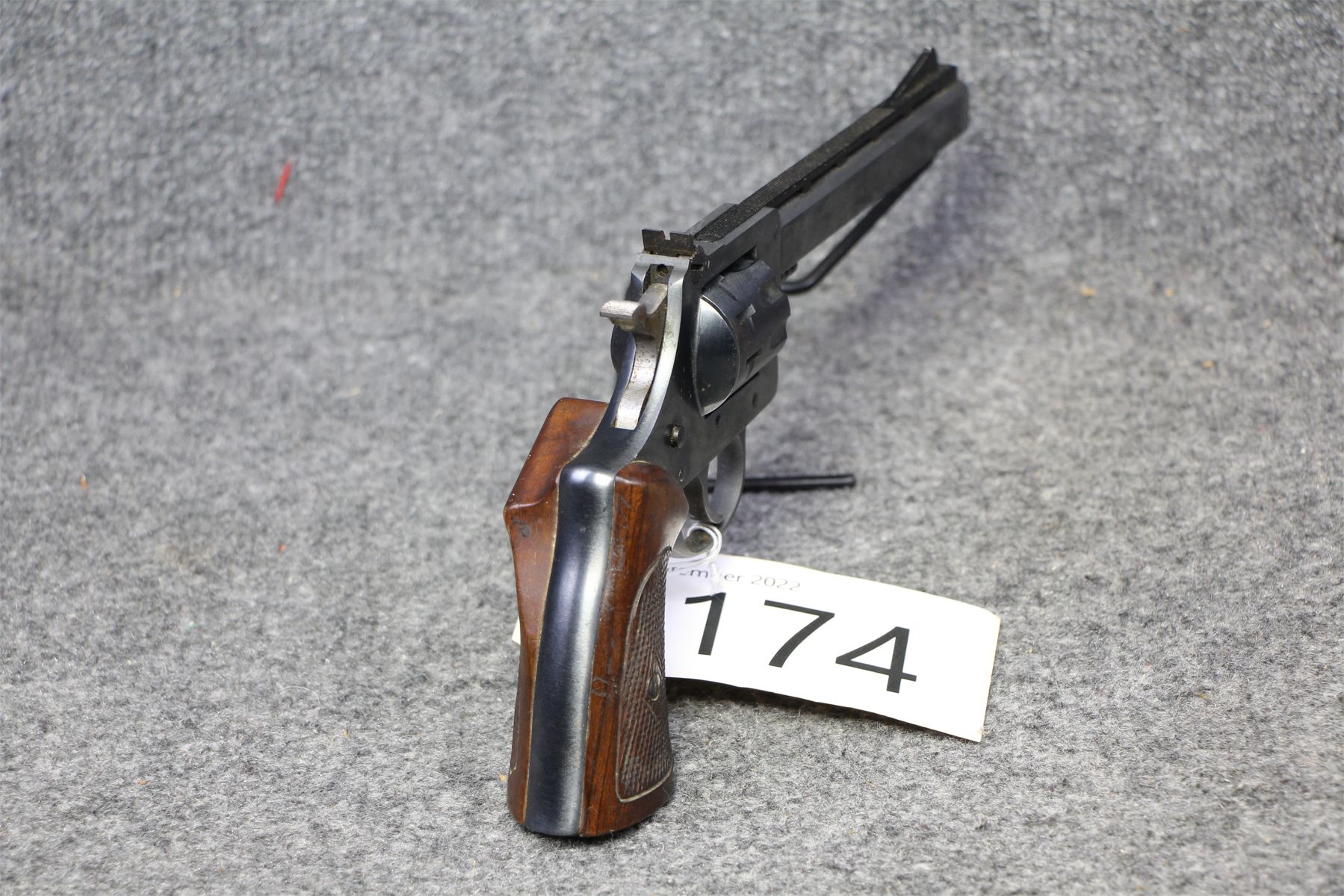 Target sights. Vent rib. Target grips. Lots of small handling marks. Tarnish on the hammer.