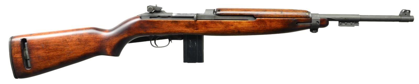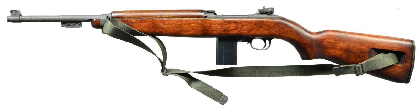 Cal. 30 Carbine. S# 5289843. Bbl. 18". Import mark on left side of bbl. Bbl. is marked behind front sight "INLAND MFG. DIV. GENERAL MOTORS" & "6-44". Stamped adjustable rear sight marked "I.R. & CO." Blade front sight w/ protective ears. Sight base marked "N". Bbl. band w/ bayonet lug marked w/ encircled "A". 6 O'clock slide marked "SG". Round bolt marked "IO" & "2". Milled trigger housing marked "W". Rotary safety. Mag. catch marked "M". Straight cut hammer marked "H I". Unmarked hardwood potbelly stock w/ oval slot. Walnut 2 rivet handguard marked "H I". Green nylon sling. MAGS: 1-15 rd. marked "A I". CONDITION: stock & handguard have arsenal rework type finish w/ light wear & scattered handling marks. Stock inletting shows slight loss of wood. Metal retains lg. degree of arsenal rework Parkerization w/ light wear & handling marks. Very good shiny bore. (22-2851/RW) CURIO. $800-1,200.