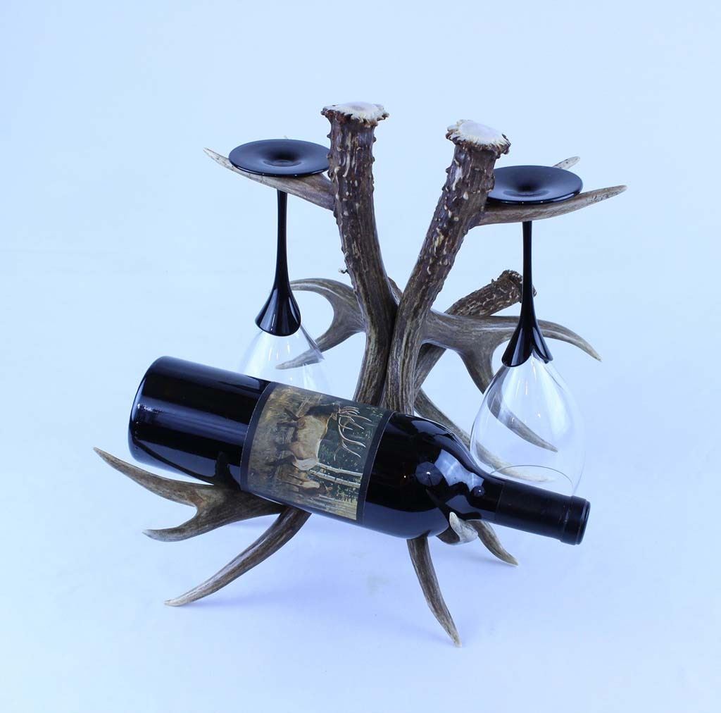 Description: (100% Fully Donated) This wine rack is made with 3 mule deer antlers along with a couple of well placed antler forks to hold the glasses. Holds 1 bottle of wine and 2 glasses. Very nice and unique centerpiece! Great gift.