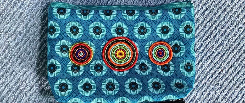 Description: (100% Fully Donated) Hand beaded South African zippered makeup bag. Padded with waterproof lining. Circles in turquoise and black with colorful beading