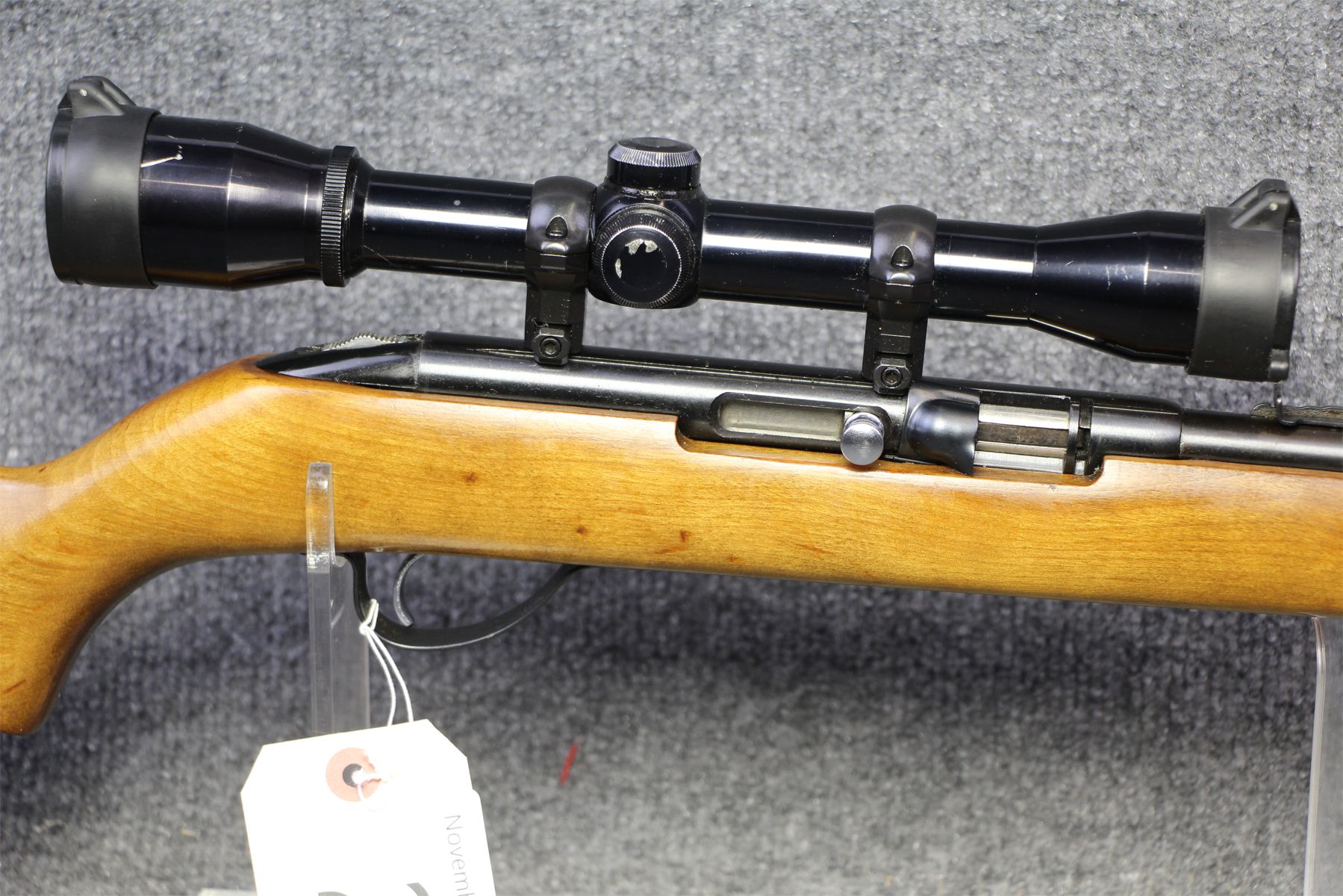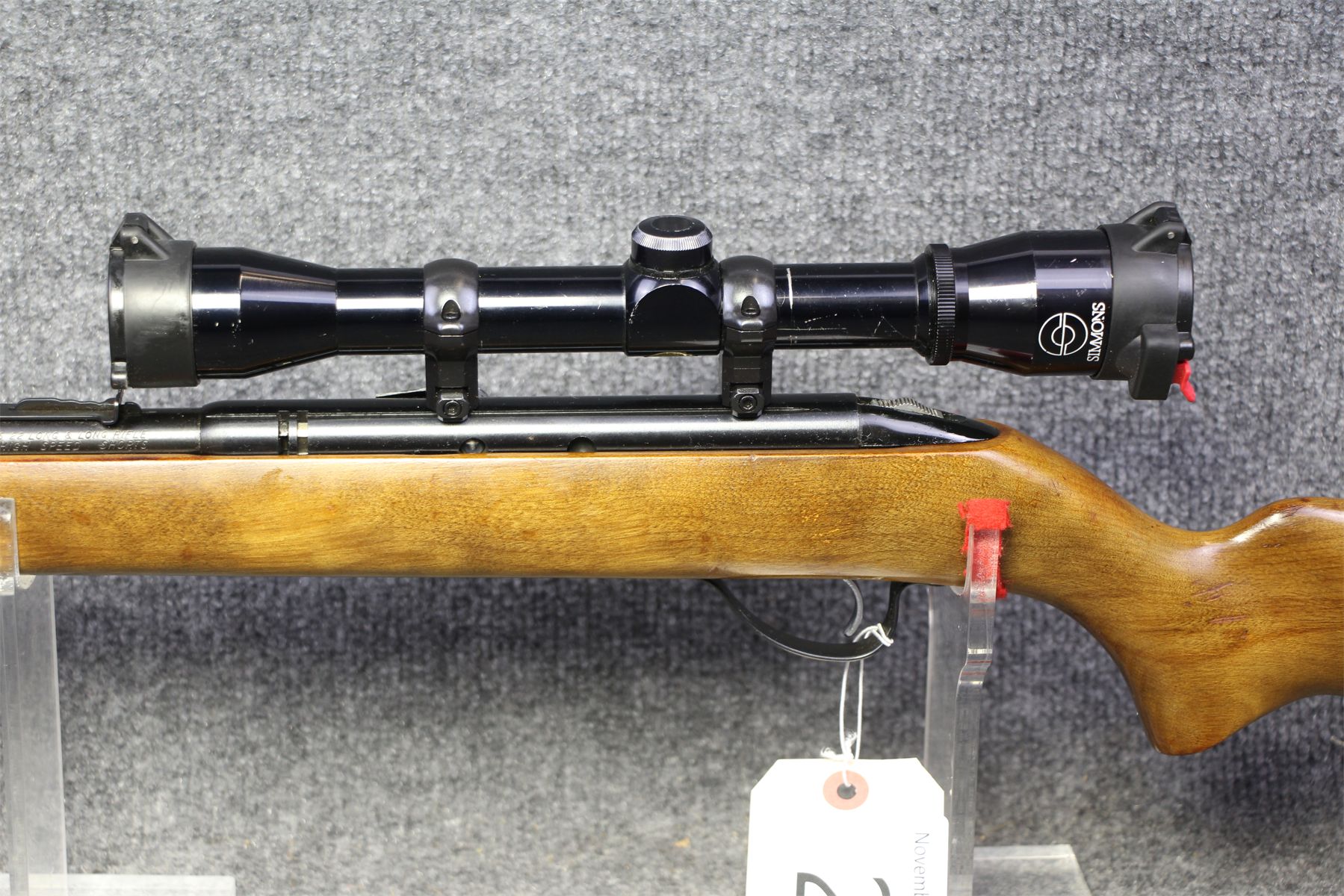 Tiny scratches. No rust. Wood in excellent condition. Comes with Simmons 4x scope.