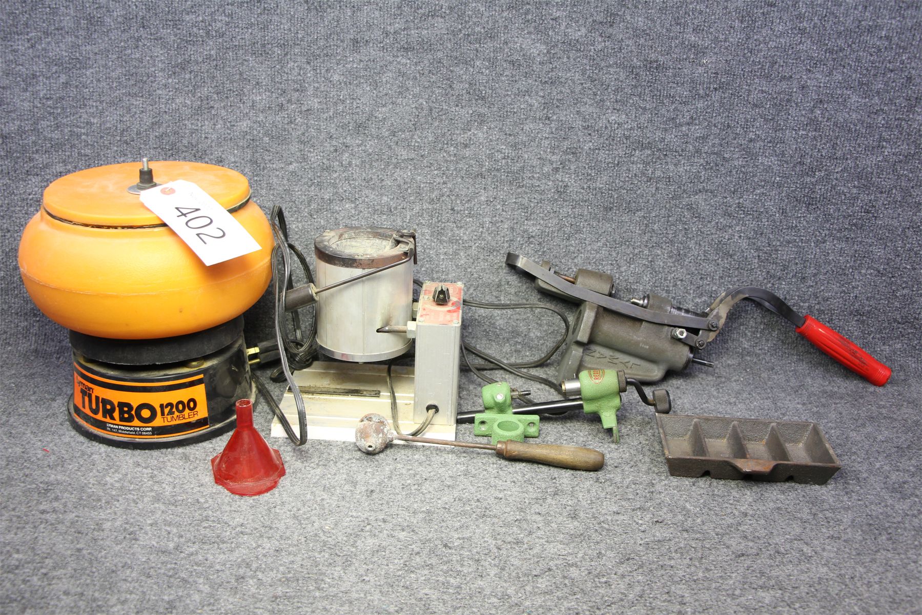 120 volt lead melting pot. Lyman Turbo 1200 case cleaner. Lyman lube sizer. Redding case trimmer. Parts missing.