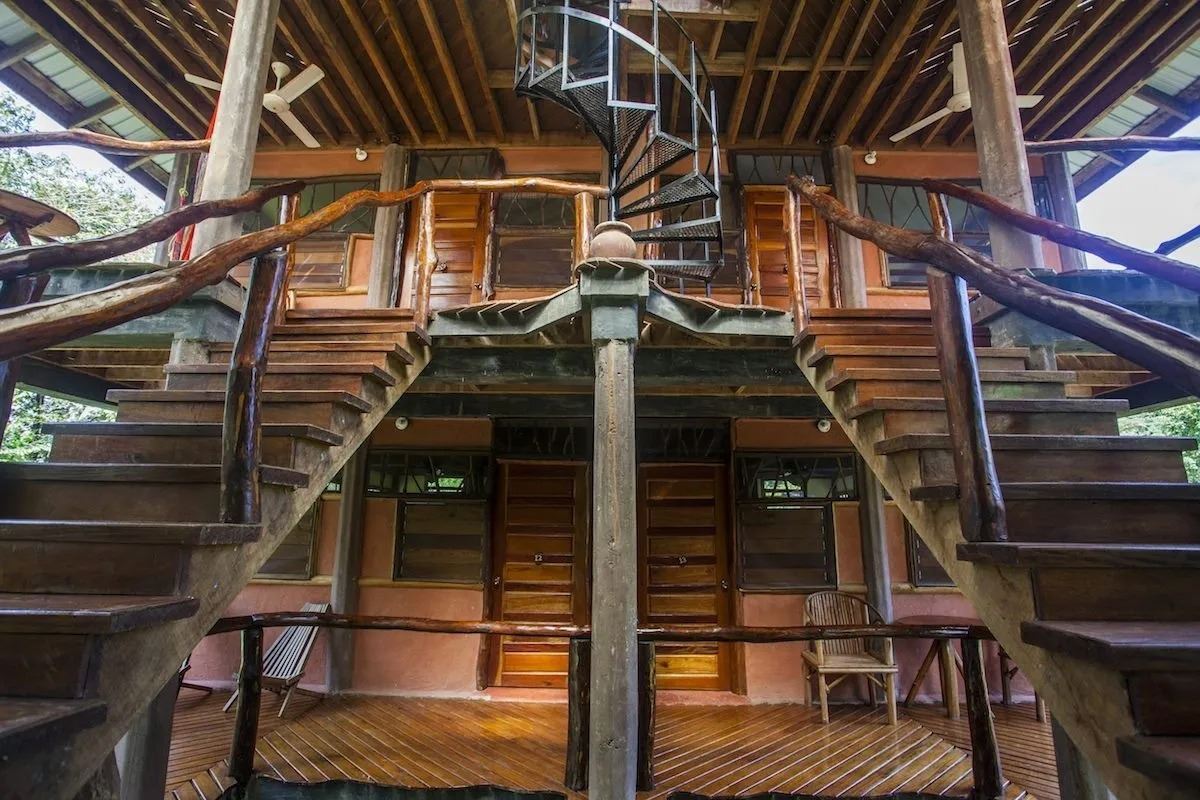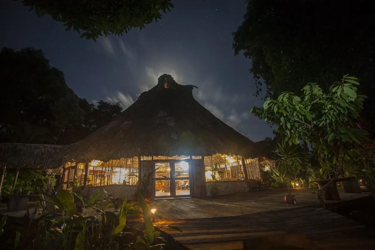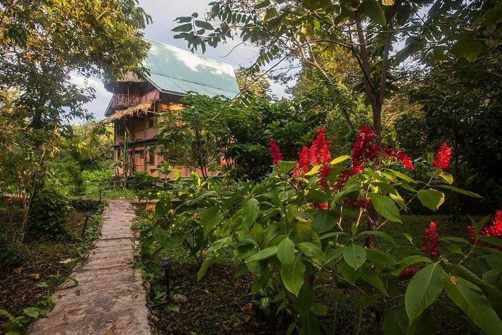 The lodge is totally off grid, using mainly solar power. They raise fresh crops, harvest local wild fruits, and even tend our own flocks of chicken and goats. Your cabanas are nested 16 feet above the ground and perched along the slow-moving Moho River.