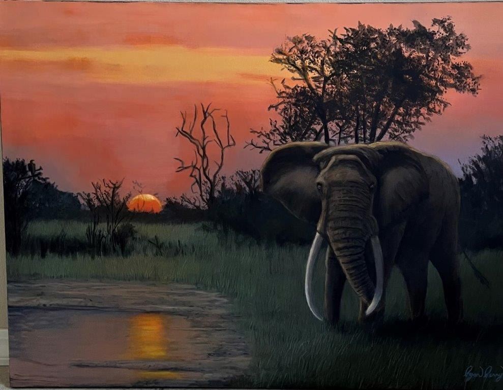 an original oil painting of a bull elephant titled “African Sunset” (30 x 40 unframed).