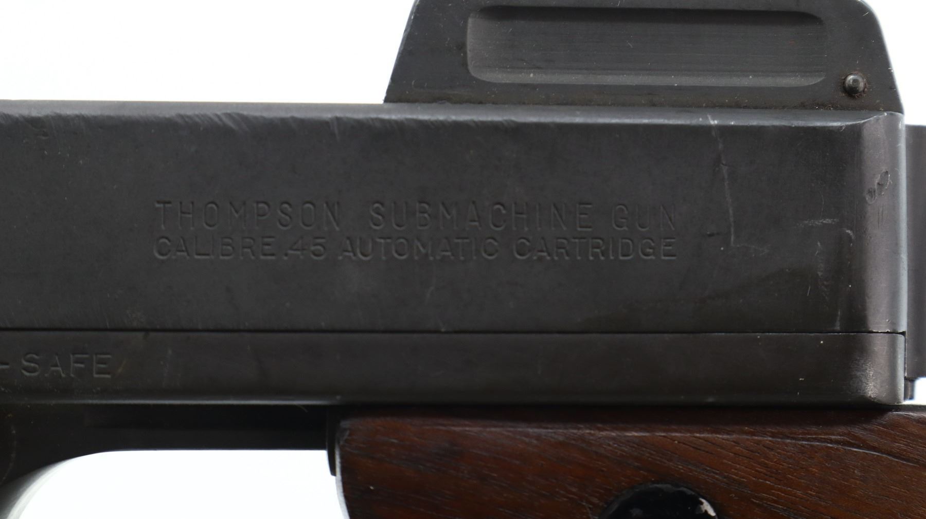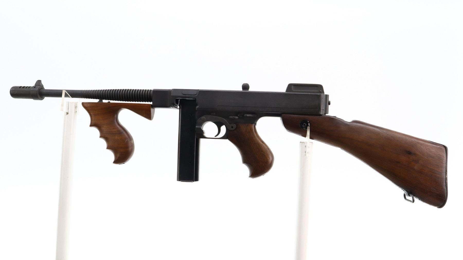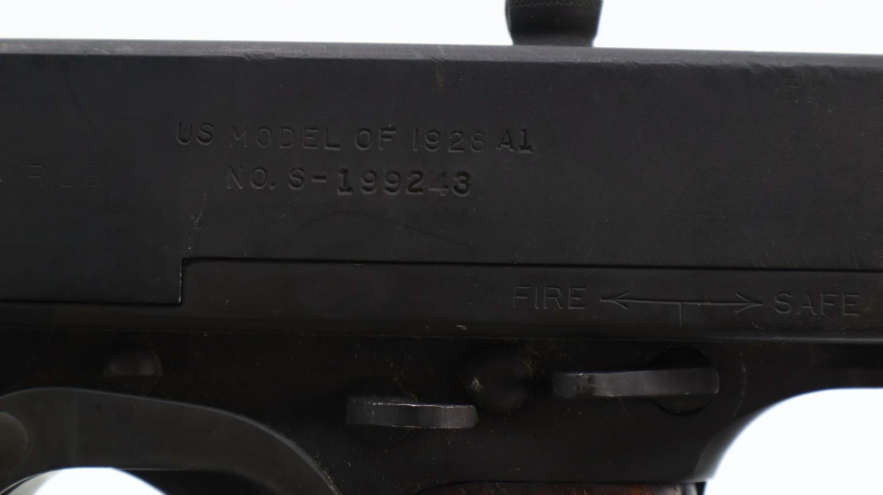 7+/10, AUTO ORDNANCE, MODEL: 1928 A1 THOMPSON, CALIBER:45 ACP, COMES WITH MAGAZINE, CLASS: CANADIAN PROHIBITED 12-3 CONVERTED AUTO, THIS ITEM MAY BE CALLED IN FOR A TECHNICAL INSPECTION WHICH WILL DELAY THE TRANSFER. IF YOU DON'T HAVE THIS CLASS OF LICENSE AND WOULD LIKE THIS ITEM DEACTIVATED, IT CAN BE DONE FOR AN ADDITIONAL $250.00 FEE. BORE IS GOOD, SLIGHT WEAR. MANUFACTURED BY SAVAGE, LOWER MISMATCHED. BLADE FRONT SIGHT, ADJUSTABLE REAR PEEP SIGHT WITH EARS, FINNED BARREL, PARKERIZED FINISH. THREE PIECE SMOOTH WOOD STOCKS, FINGER GROOVED VERTICAL GRIP FOREND, PISTOL GRIP, DETACHABLE WOOD BUTT STOCK, SMOOTH STEEL BUTT PLATE WITH TRAP, REAR SLING SWIVEL ONLY. METAL FINISH SHOWS SOME SCRATCHES, HANDLING MARKS AND WEAR. STOCKS SHOW SOME MARKS, SCRATCHES AND WEAR. , ACTION: 12-3 CONVERTED AUTO, BARREL LENGTH: 270MM, SERIAL # S199243, CONDITION: 7+/10, CLASS: CANADIAN PROHIBITED 12-3 CONVERTED AUTO