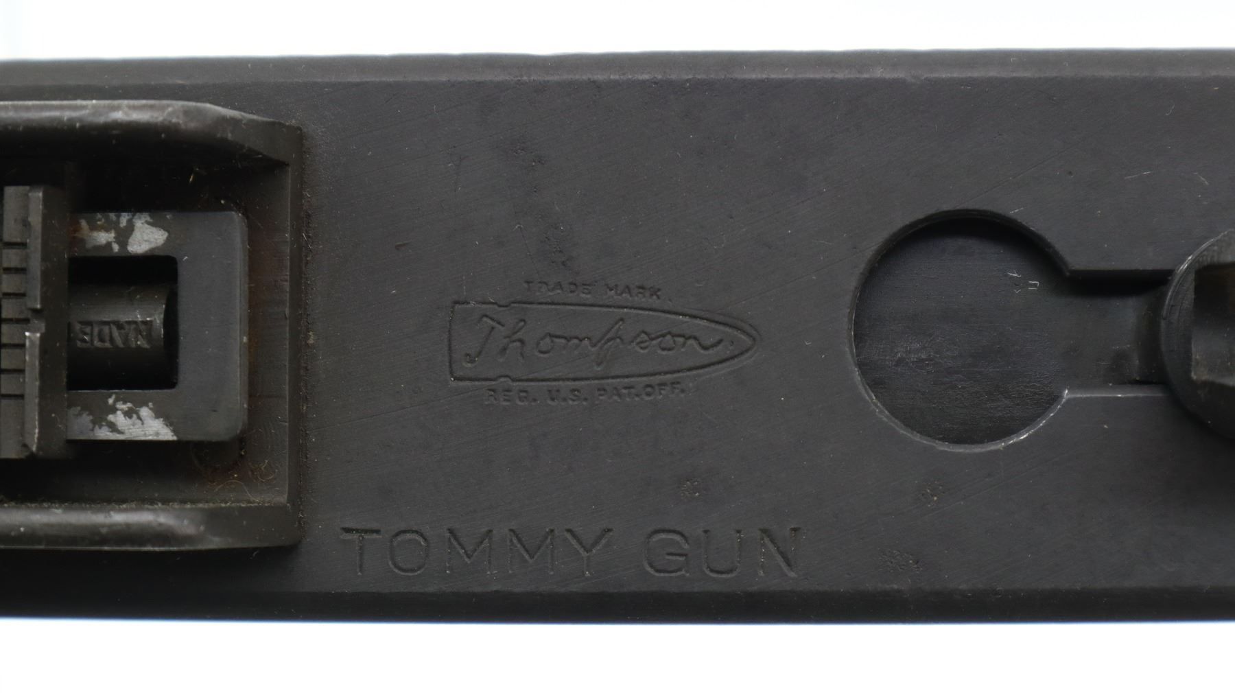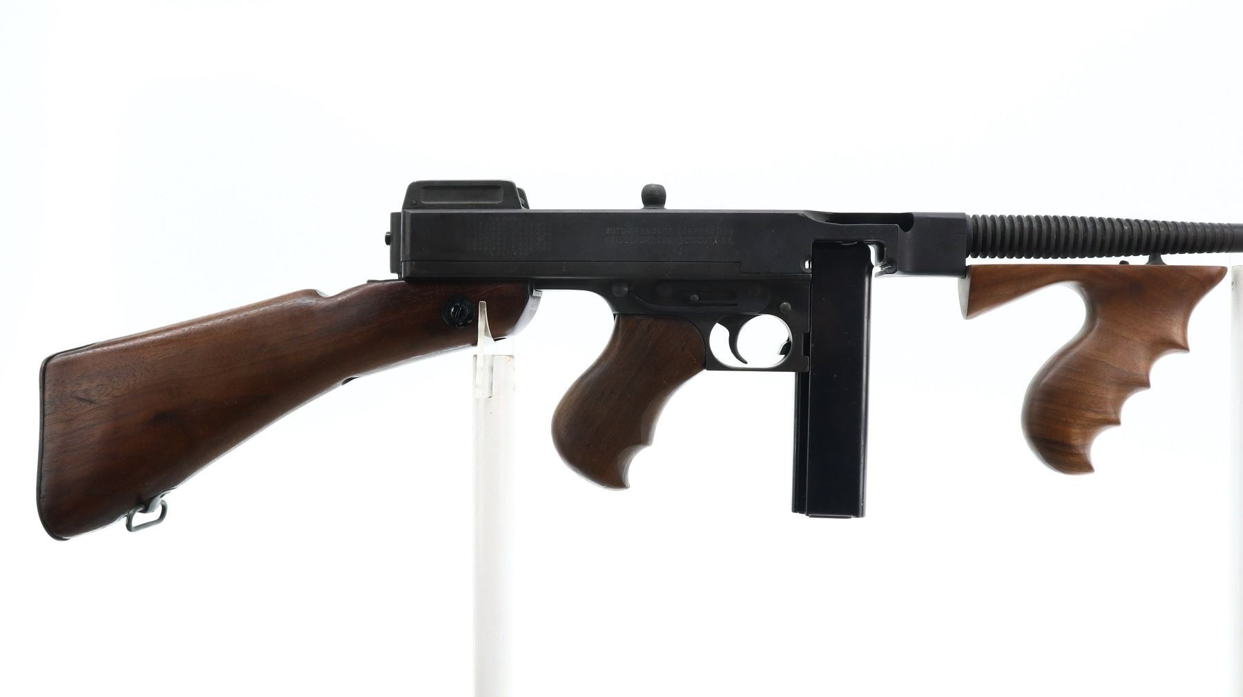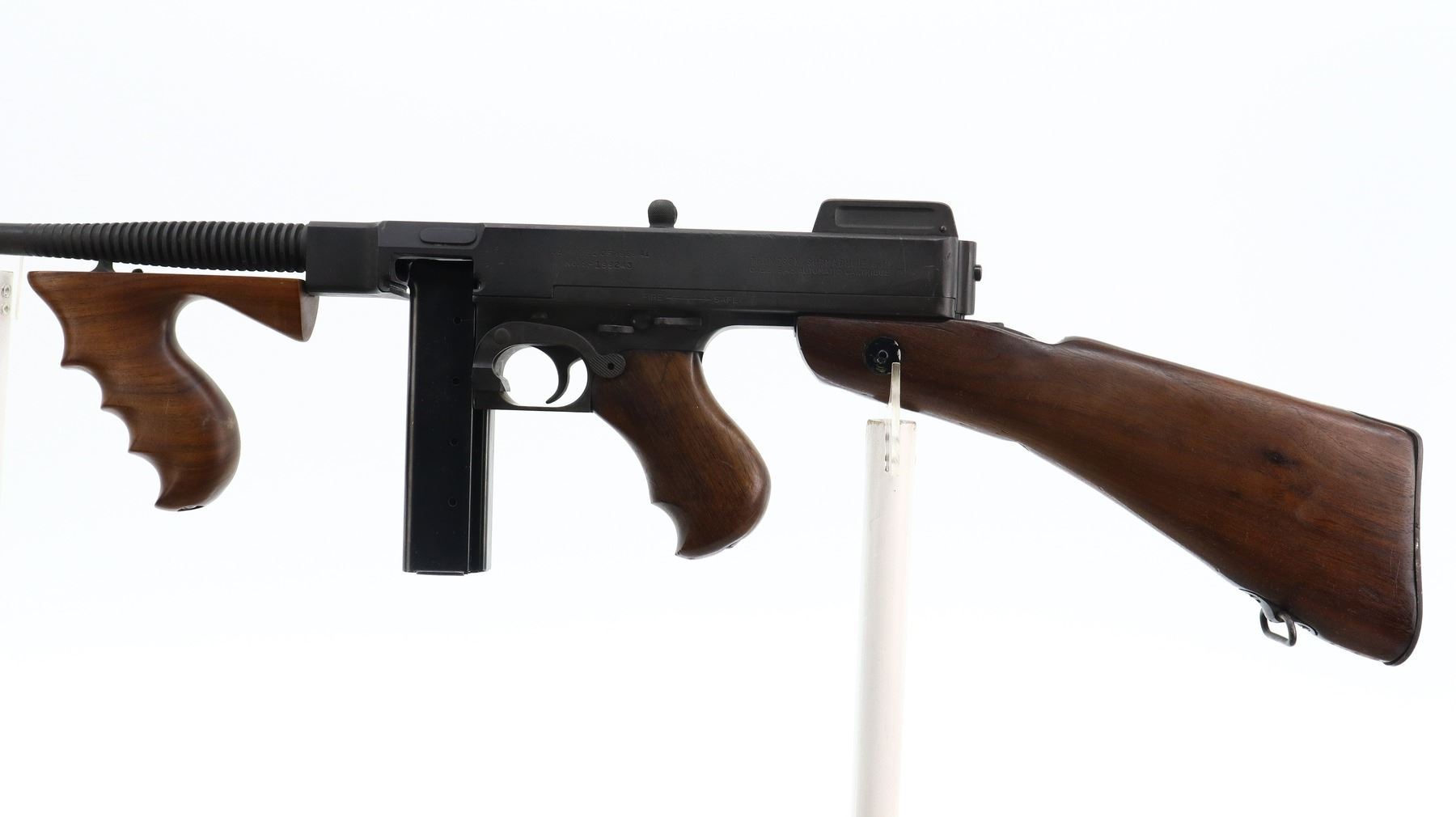 7+/10, AUTO ORDNANCE, MODEL: 1928 A1 THOMPSON, CALIBER:45 ACP, COMES WITH MAGAZINE, CLASS: CANADIAN PROHIBITED 12-3 CONVERTED AUTO, THIS ITEM MAY BE CALLED IN FOR A TECHNICAL INSPECTION WHICH WILL DELAY THE TRANSFER. IF YOU DON'T HAVE THIS CLASS OF LICENSE AND WOULD LIKE THIS ITEM DEACTIVATED, IT CAN BE DONE FOR AN ADDITIONAL $250.00 FEE. BORE IS GOOD, SLIGHT WEAR. MANUFACTURED BY SAVAGE, LOWER MISMATCHED. BLADE FRONT SIGHT, ADJUSTABLE REAR PEEP SIGHT WITH EARS, FINNED BARREL, PARKERIZED FINISH. THREE PIECE SMOOTH WOOD STOCKS, FINGER GROOVED VERTICAL GRIP FOREND, PISTOL GRIP, DETACHABLE WOOD BUTT STOCK, SMOOTH STEEL BUTT PLATE WITH TRAP, REAR SLING SWIVEL ONLY. METAL FINISH SHOWS SOME SCRATCHES, HANDLING MARKS AND WEAR. STOCKS SHOW SOME MARKS, SCRATCHES AND WEAR. , ACTION: 12-3 CONVERTED AUTO, BARREL LENGTH: 270MM, SERIAL # S199243, CONDITION: 7+/10, CLASS: CANADIAN PROHIBITED 12-3 CONVERTED AUTO