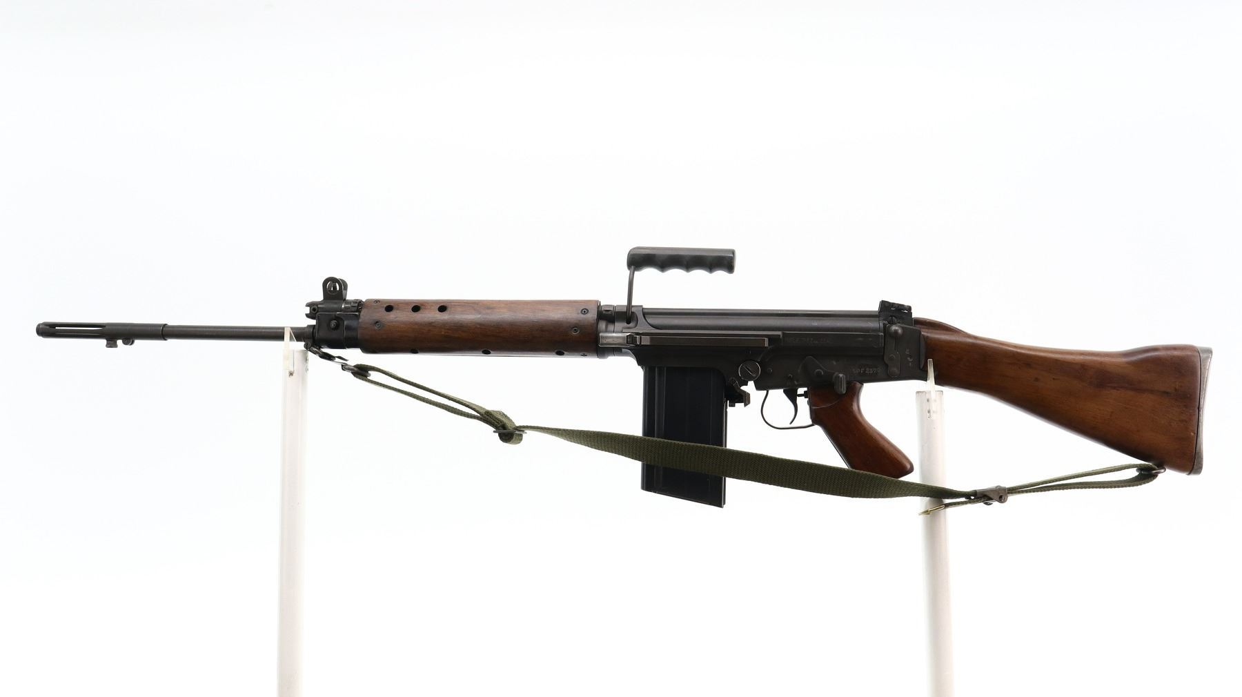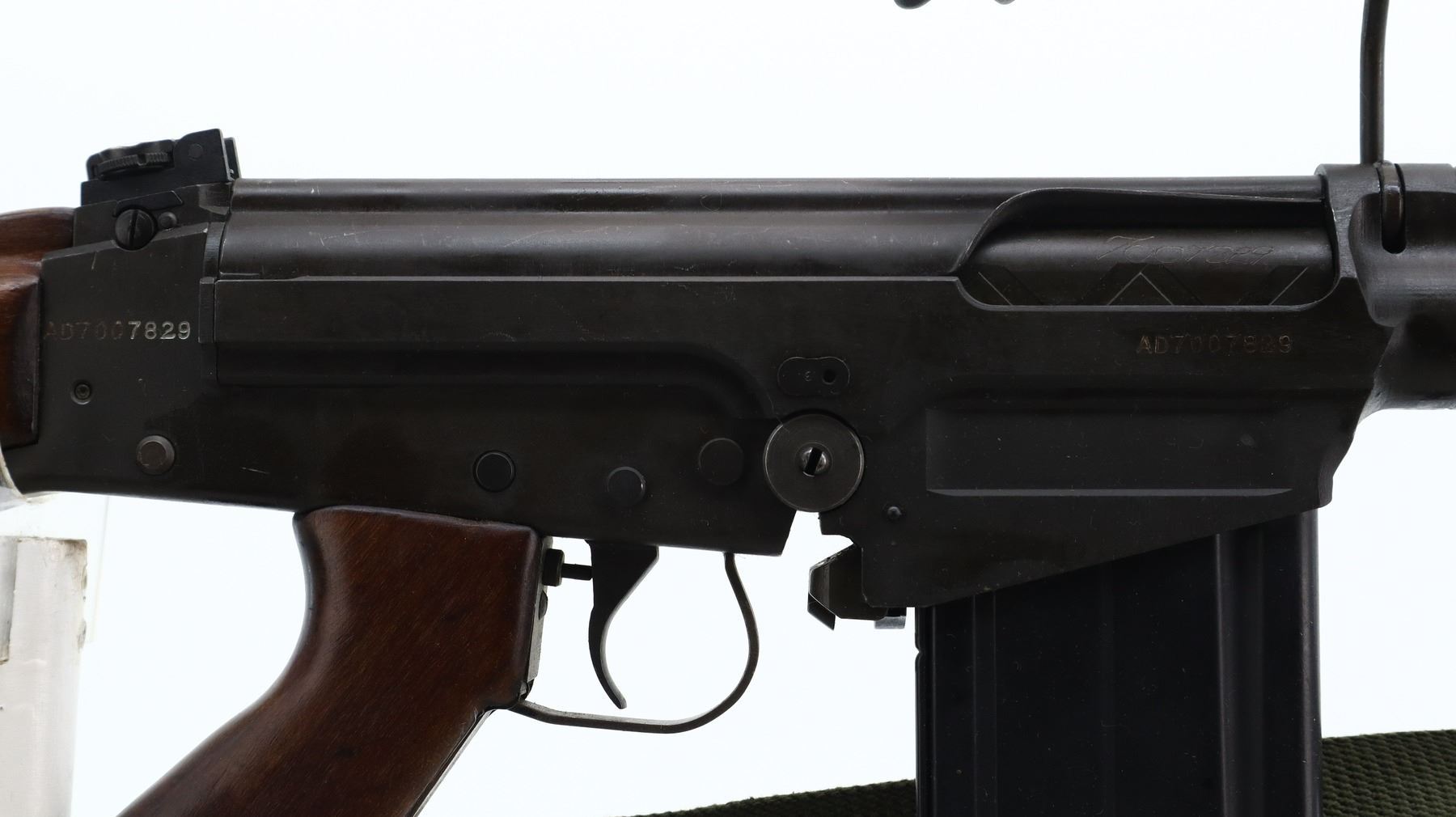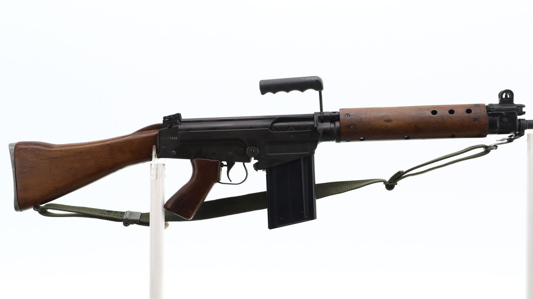 7/10, AUSTRALIAN FN FAL, MODEL: L1A1, CALIBER:7.62 N, COMES WITH MAGAZINE, CLASS: CANADIAN 12-5 PROHIBITED, IF YOU DON'T HAVE THIS CLASS OF LICENSE AND WOULD LIKE THIS ITEM DEACTIVATED, IT CAN BE DONE FOR AN ADDITIONAL $250.00 FEE. BORE IS GOOD. VISIBLE SERIAL NUMBERS MATCH. BLADE FRONT SIGHT WITH EARS, ADJUSTABLE FOLDING REAR PEEP SIGHT (CANADIAN C1A1), FULL LENGTH TOP COVER, GROOVED BLACK POLYMER CARRYING HANDLE, FOLDING COCKING HANDLE ON LEFT SIDE. FOUR PIECE FULL MILITARY WOOD STOCKS, VENTILATED HANDGUARDS, PISTOL GRIP, BUTT STOCK, SMOOTH ALLOY BUTT PLATE WITH TRAP AND COMBO TOOL, SWIVELS WITH GREEN CANVAS MILITARY SLING, ATTACHED FLASH HIDER WITH BAYONET LUG. METAL FINISH SHOWS SOME SCRATCHES, HANDLING MARKS AND WEAR. STOCKS SHOW SOME MARKS, SCRATCHES AND WEAR. , ACTION: 12-5 SEMI AUTO, BARREL LENGTH: 533MM, SERIAL # AD7007829, CONDITION: 7/10, CLASS: CANADIAN PROHIBITED 12-5 SEMI AUTO