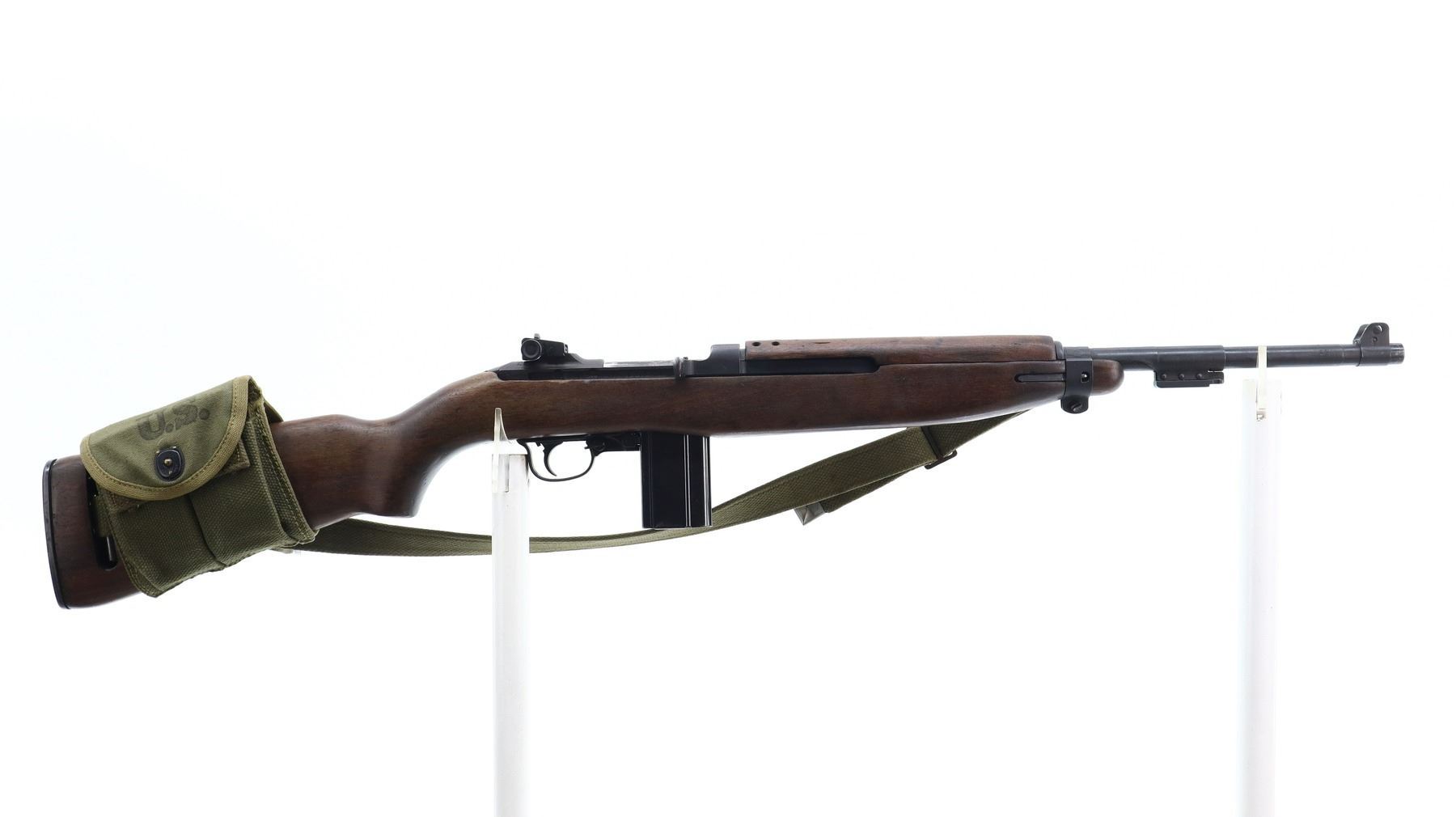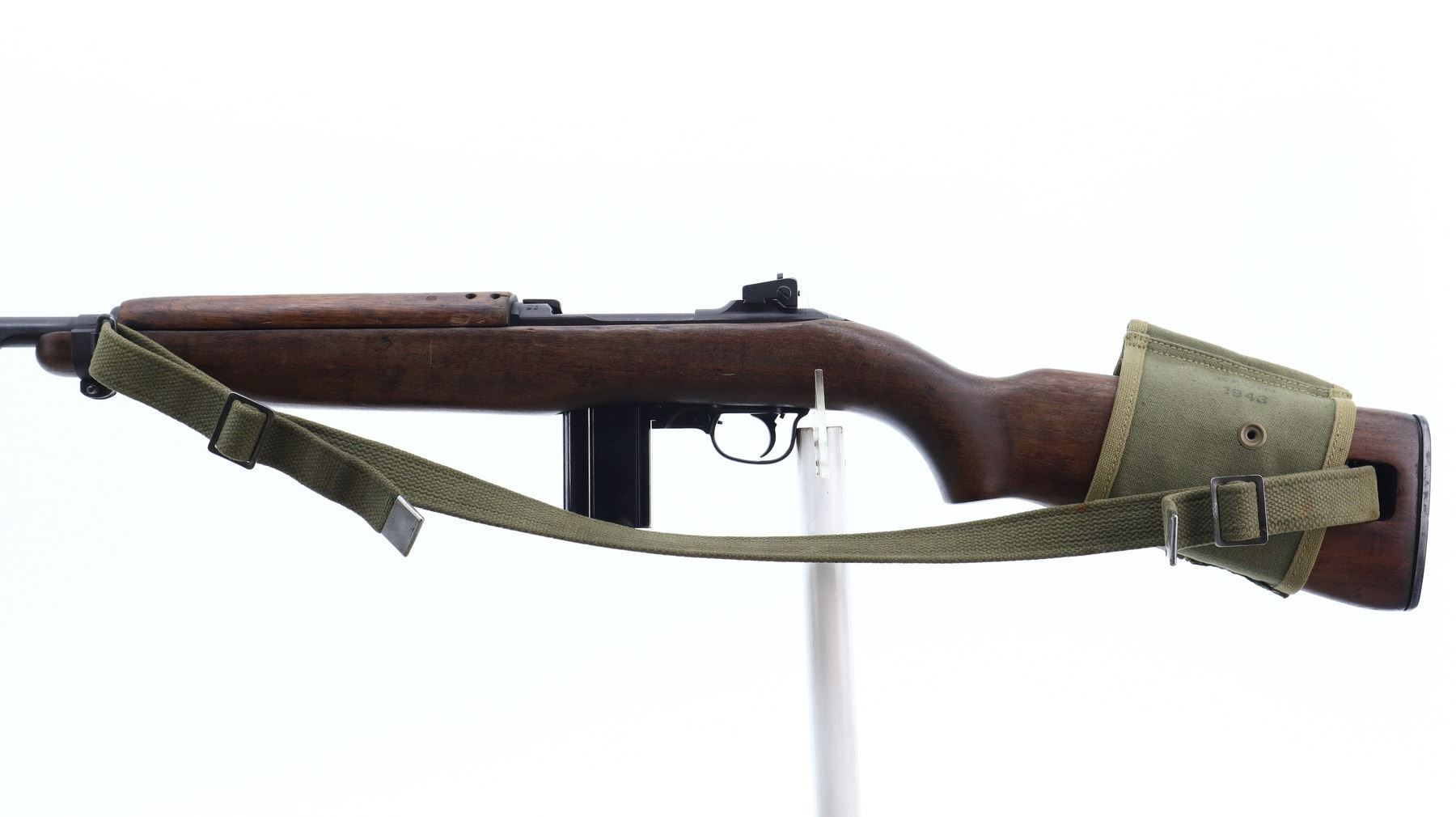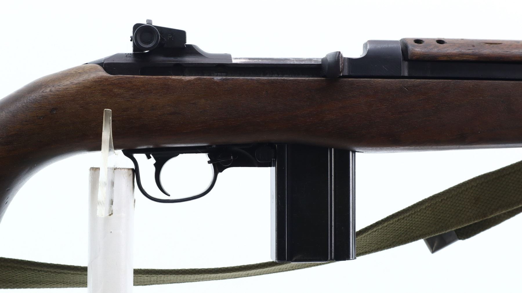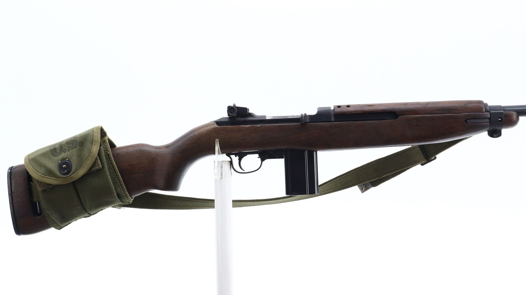 7/10, US RIFLE, MODEL: M1 CARBINE, CALIBER:30 MI, COMES WITH MAGAZINE, BORE IS VERY GOOD, SHINNY. MANUFACTURED BY INLAND BARREL DATED 5-43. BLADE FRONT SIGHT WITH EARS, ADJUSTABLE REAR PEEP SIGHT, ROUND BOLT, ROTARY SAFETY. TWO PIECE SMOOTH FULL MILITARY WOOD STOCKS, PISTOL GRIP, CHECKERED STEEL BUTT PLATE, STOCK HAS 1943 DATED DOUBLE MAG POUCH, OILER AND CANVAS SLING AND BARREL BAND WITH BAYONET LUG. METAL FINISH SHOWS SOME SCRATCHES, HANDLING MARKS AND WEAR. STOCKS SHOW SOME MARKS, SCRATCHES AND WEAR., ACTION: SEMI AUTOMATIC RIFLE, BARREL LENGTH: 455MM, SERIAL # 310164, CONDITION: 7/10, CLASS: CANADIAN RESTRICTED CLASS