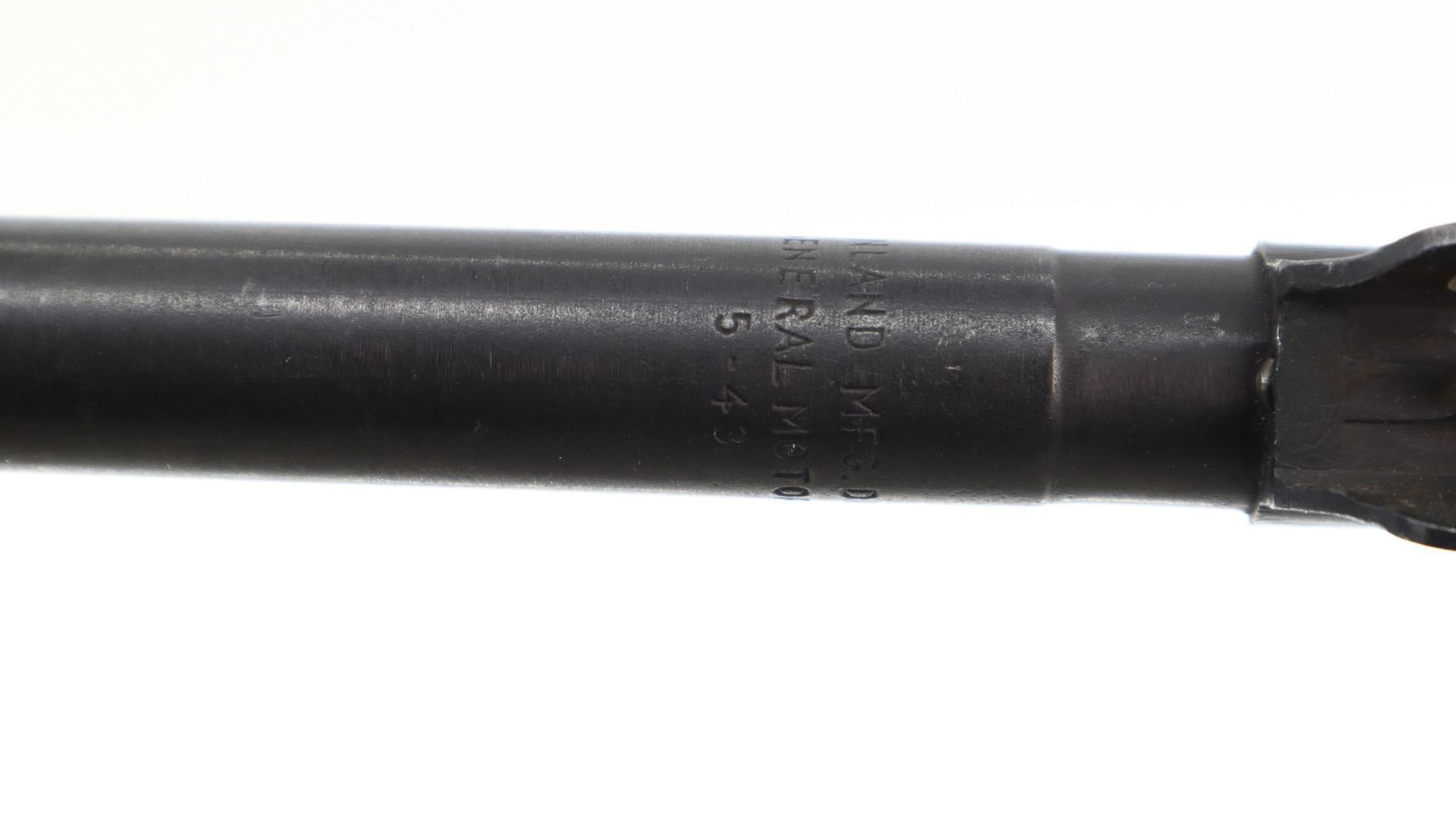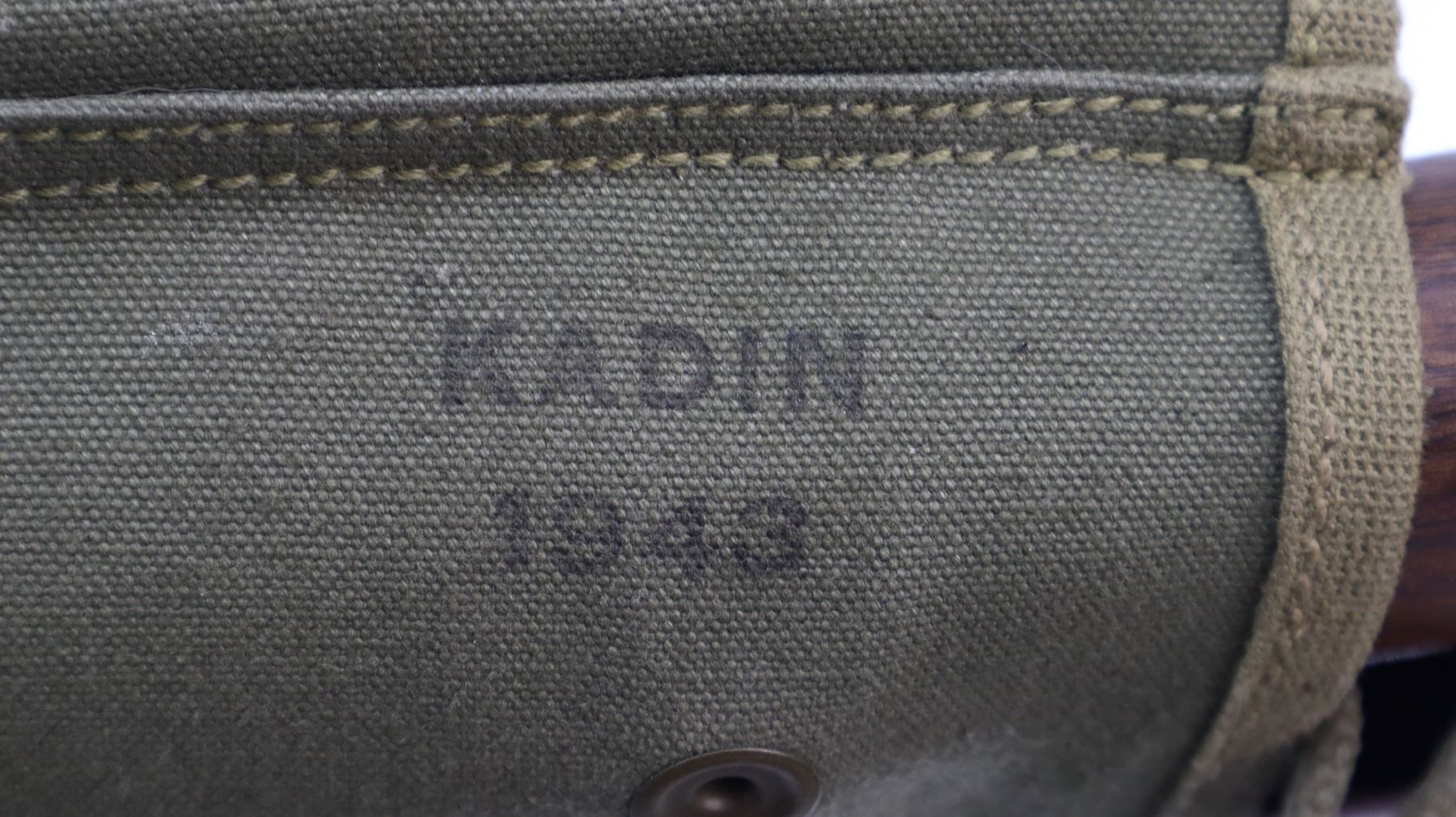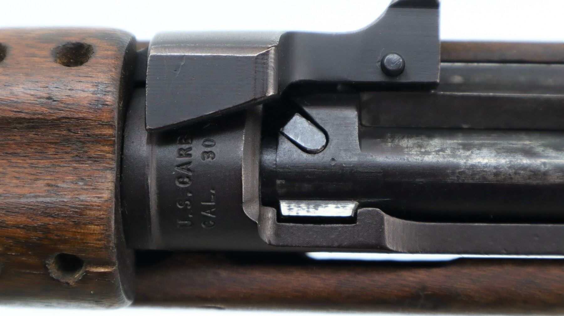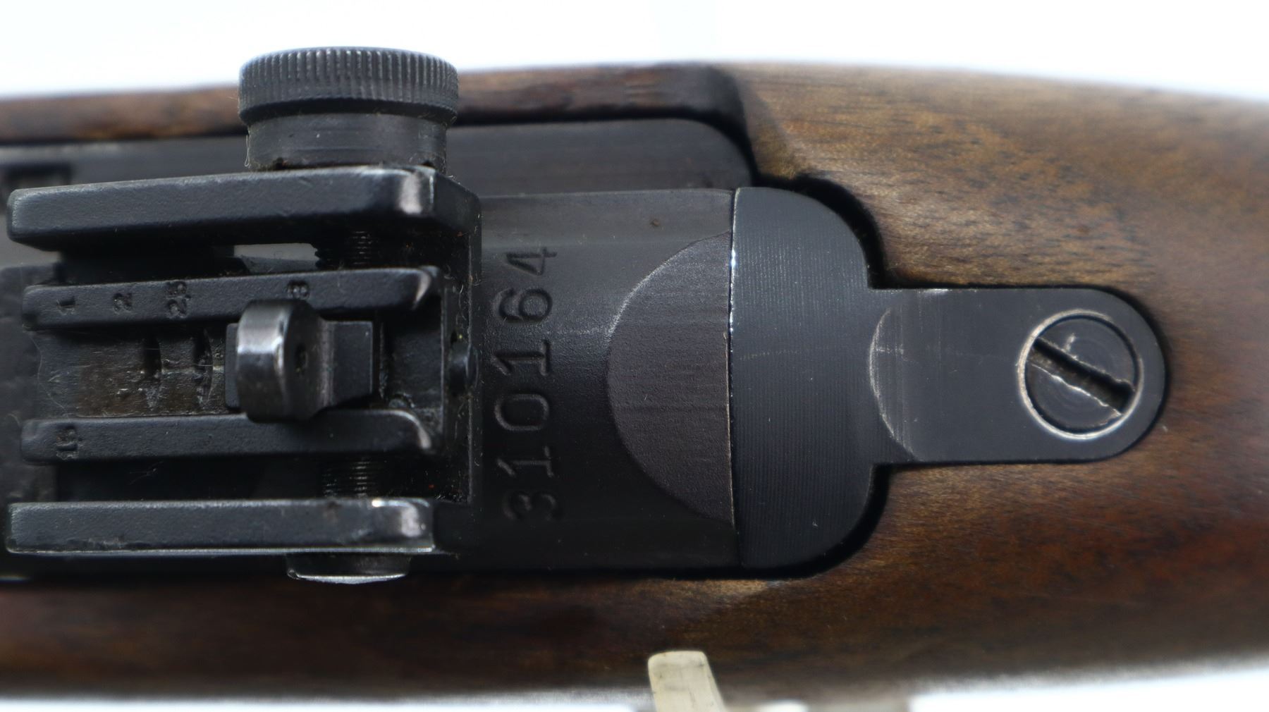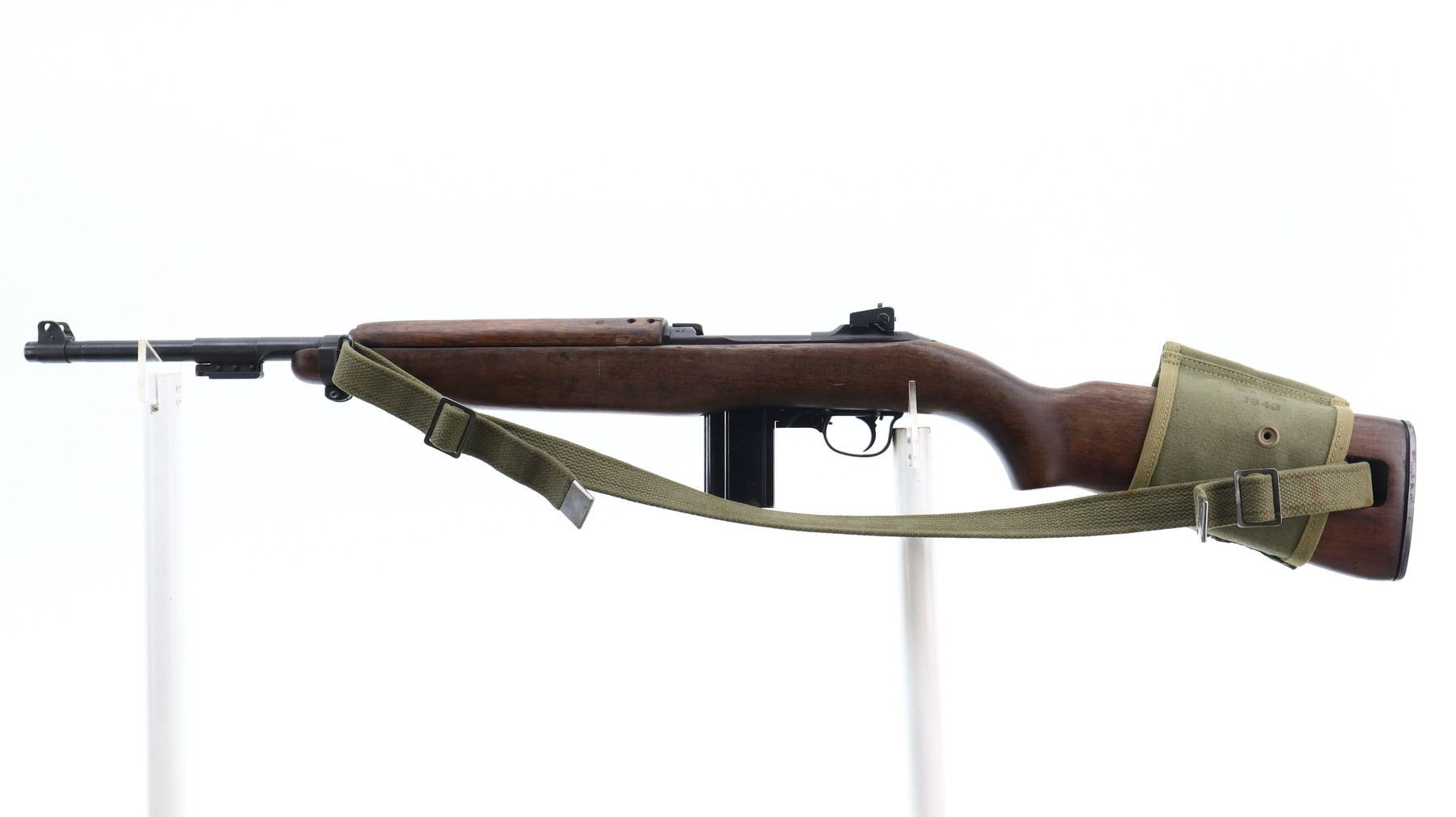7/10, US RIFLE, MODEL: M1 CARBINE, CALIBER:30 MI, COMES WITH MAGAZINE, BORE IS VERY GOOD, SHINNY. MANUFACTURED BY INLAND BARREL DATED 5-43. BLADE FRONT SIGHT WITH EARS, ADJUSTABLE REAR PEEP SIGHT, ROUND BOLT, ROTARY SAFETY. TWO PIECE SMOOTH FULL MILITARY WOOD STOCKS, PISTOL GRIP, CHECKERED STEEL BUTT PLATE, STOCK HAS 1943 DATED DOUBLE MAG POUCH, OILER AND CANVAS SLING AND BARREL BAND WITH BAYONET LUG. METAL FINISH SHOWS SOME SCRATCHES, HANDLING MARKS AND WEAR. STOCKS SHOW SOME MARKS, SCRATCHES AND WEAR., ACTION: SEMI AUTOMATIC RIFLE, BARREL LENGTH: 455MM, SERIAL # 310164, CONDITION: 7/10, CLASS: CANADIAN RESTRICTED CLASS