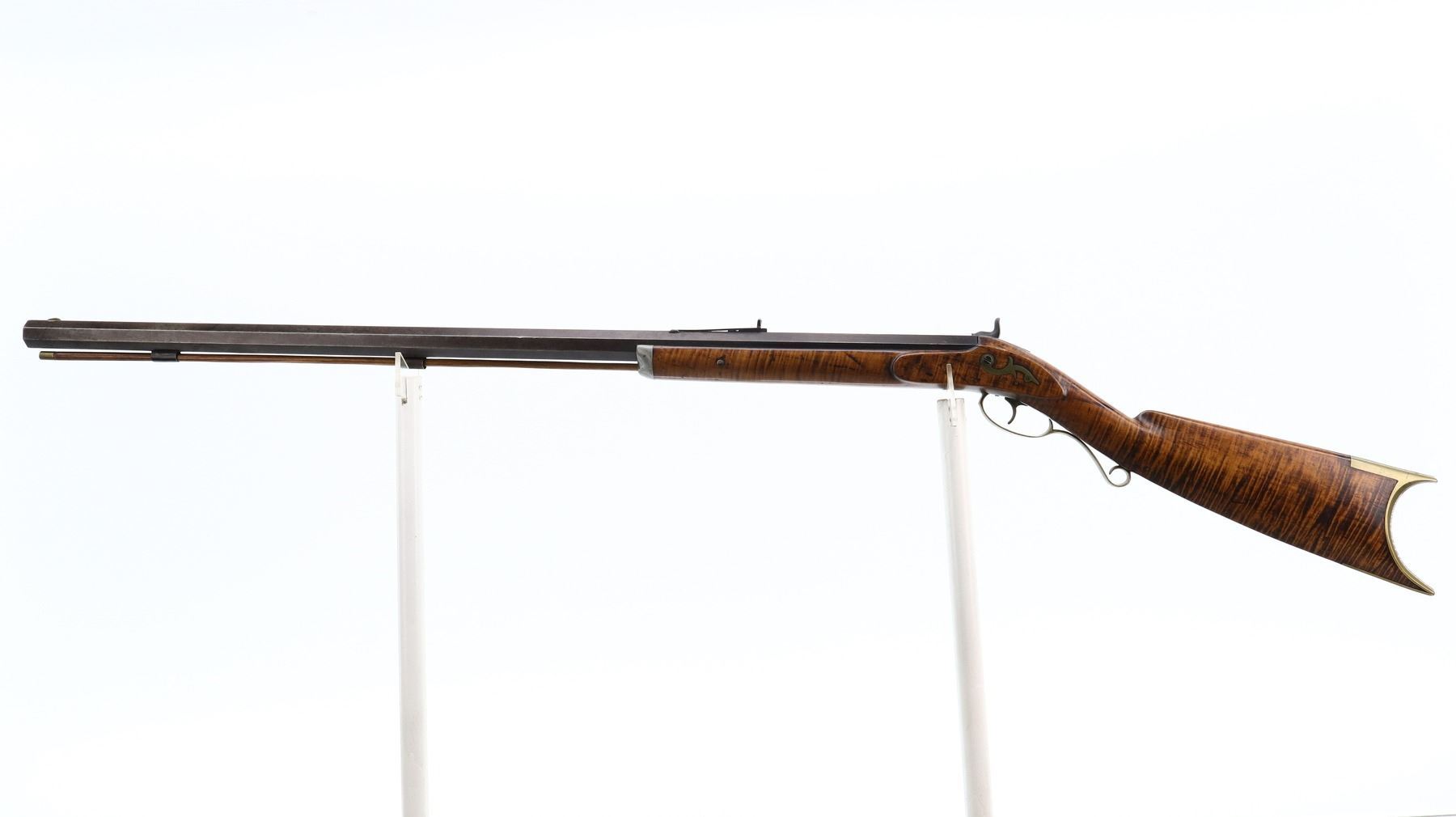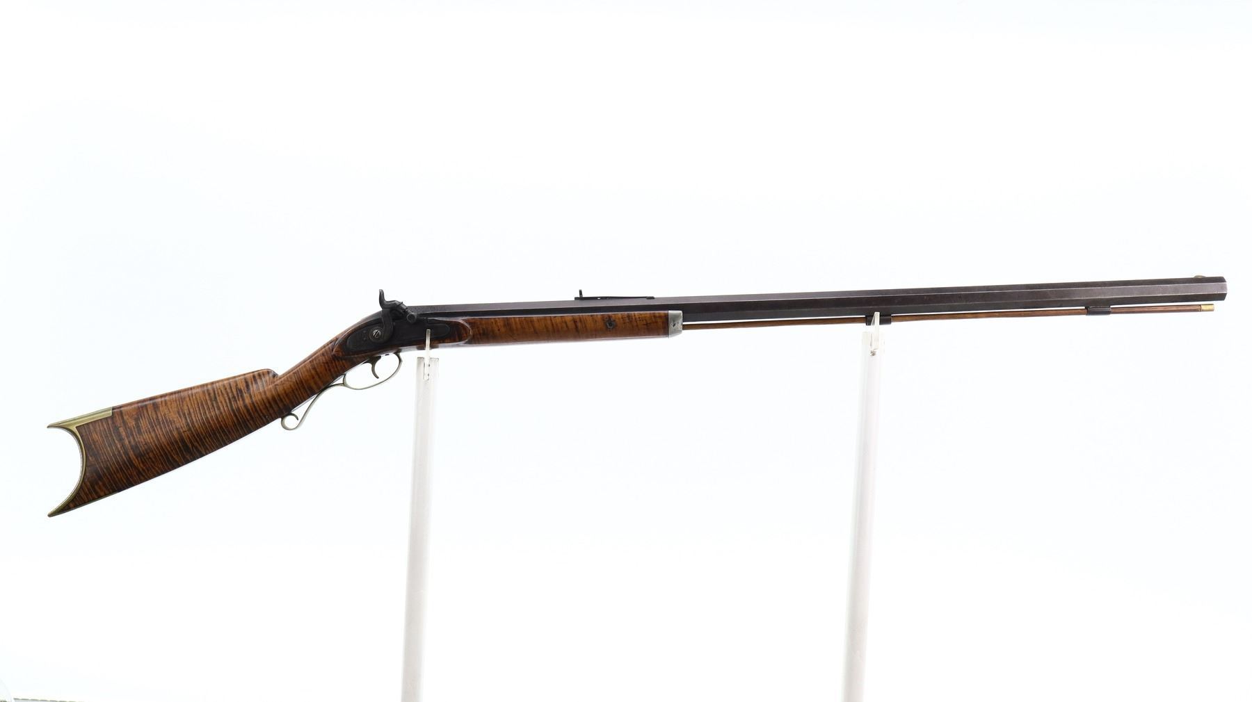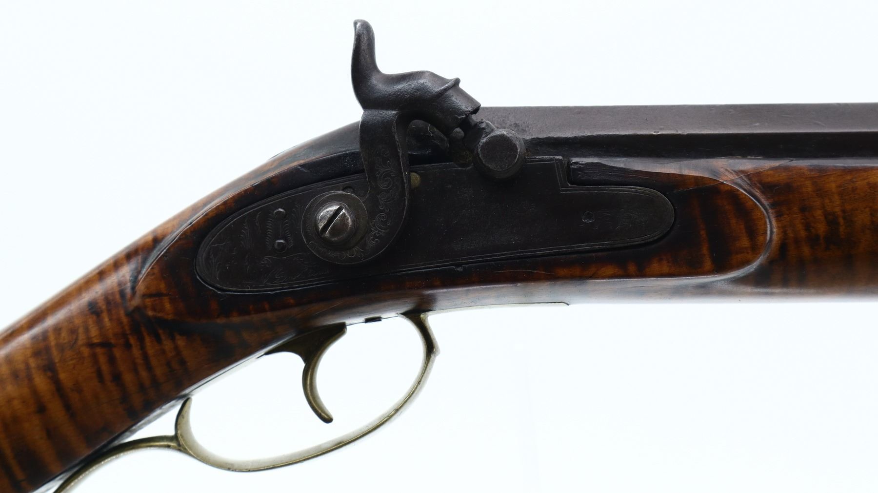 5+/10, T. NICHOL CHATHAM CW, MODEL: 85 , CALIBER:41 CAL APPROX., BORE IS POOR, PITTED, DARK. MANUFACTURED 1860-1870, BY A CANADIAN GUNSMITH LOCATING IN CHATHAM CANADA WEST. BLADE FRONT SIGHT, ADJUSTABLE U NOTCHED SEMI BUCKHORN REAR SIGHT, HEAVY OCTAGON BARREL, ENGRAVED LOCK AND HAMMER MARKED "WARRANTED". ONE PIECE HALF WOOD STOCK, STRAIGHT GRIP, SMOOTH CURVED BRASS BUTT PLATE, BRASS TRIGGER GUARD WITH FINGER REST, SILVER FOREND CAP, REPLACED WOOD RAMROD WITH BRASS TIP. METAL FINISH TURNING BROWN WITH LIGHT RUST SPECKLES, SCRATCHES, HANDLING MARKS AND WEAR. STOCK HAS A FEW SMALL CRACKS, MARKS, SCRATCHES AND WEAR. , ACTION: PERCUSSION RIFLE, BARREL LENGTH: 35.5", SERIAL # NA, CONDITION: 5+/10, CLASS: CANADIAN ANTIQUE CLASS, NO LICENSE REQUIRED