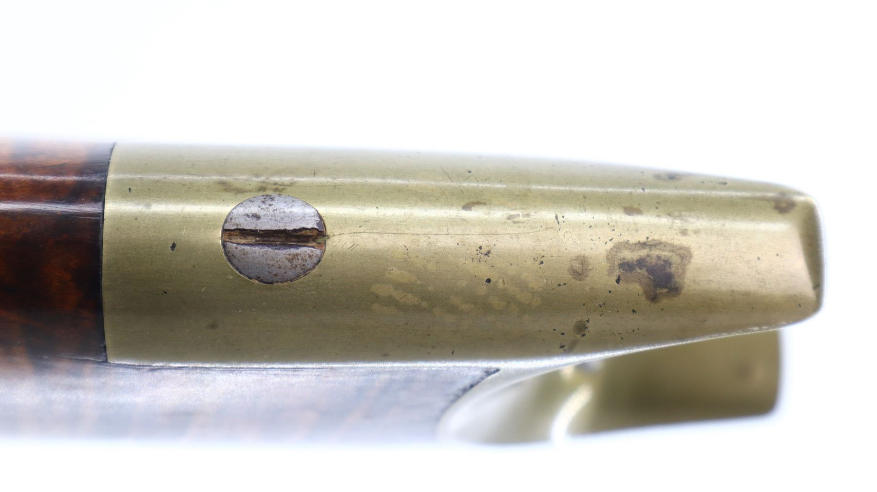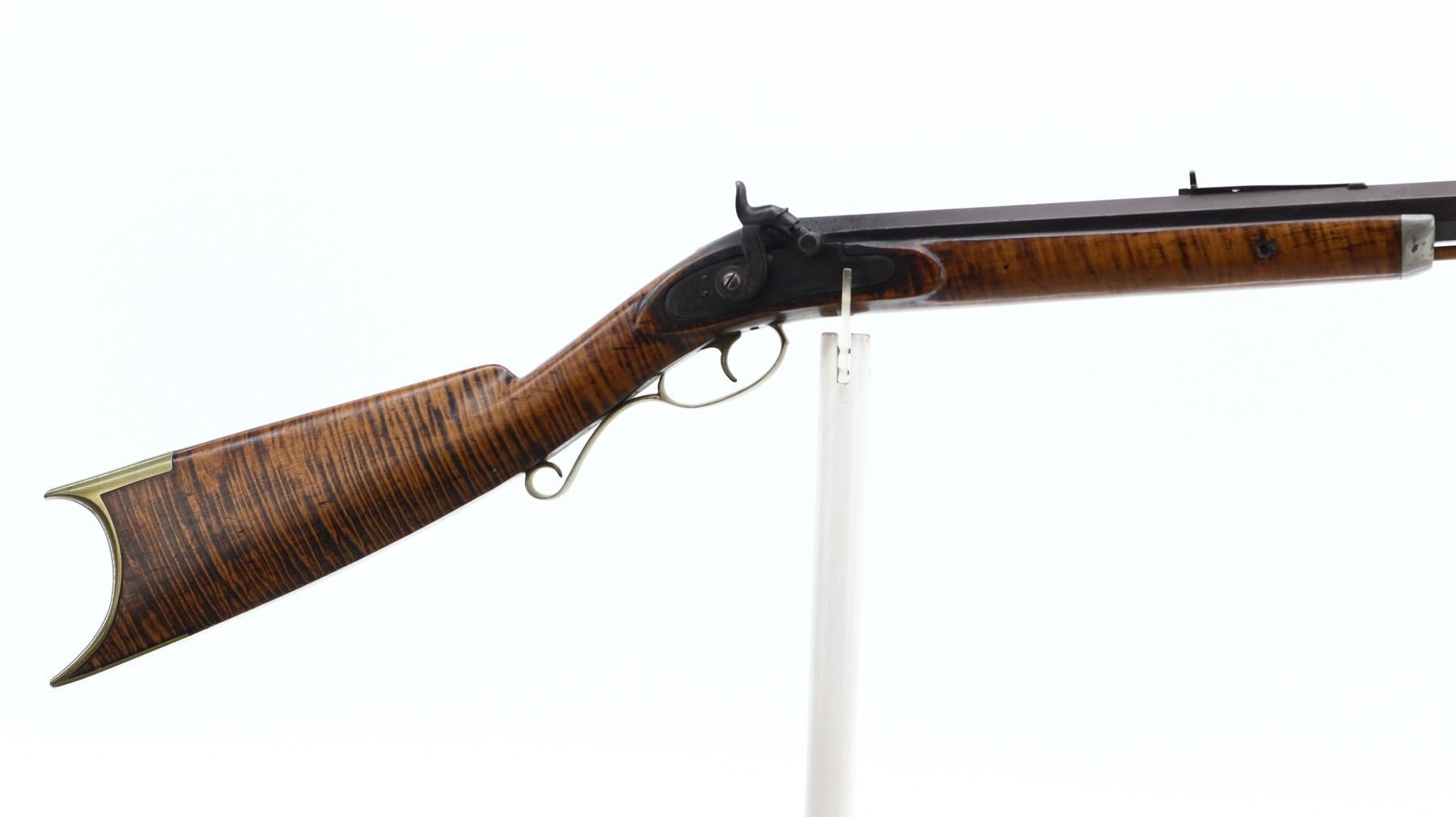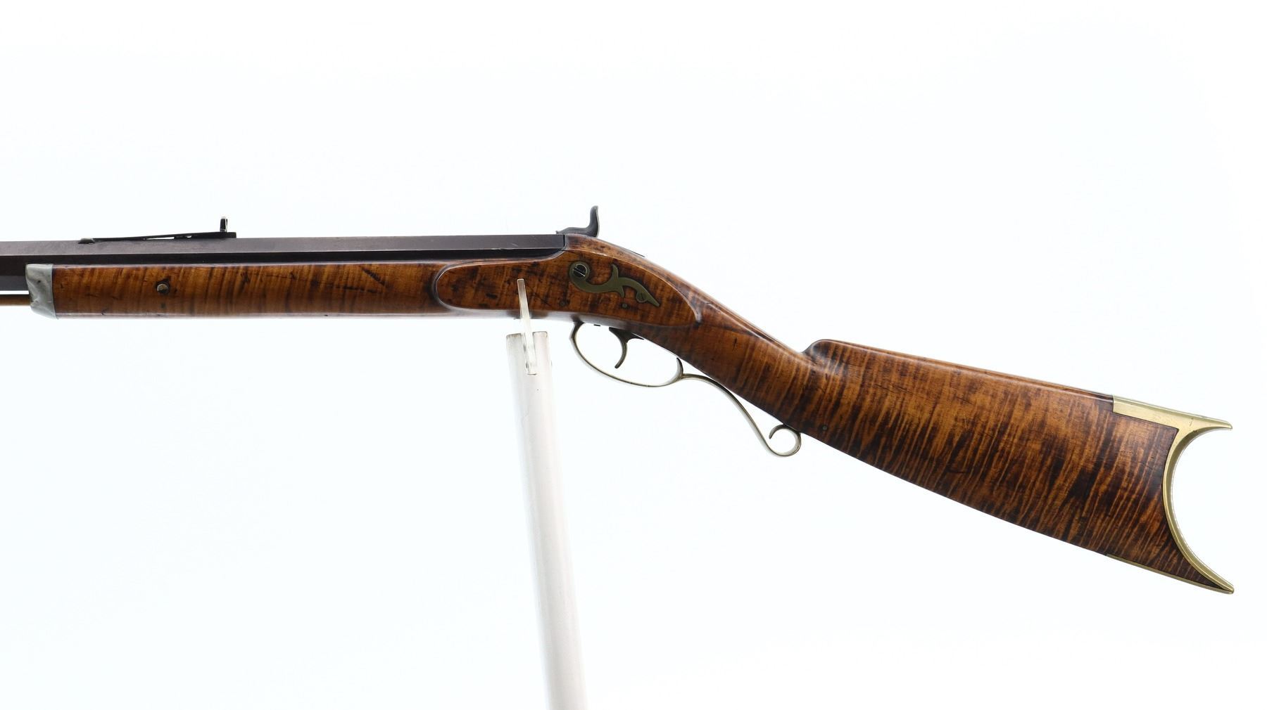 5+/10, T. NICHOL CHATHAM CW, MODEL: 85 , CALIBER:41 CAL APPROX., BORE IS POOR, PITTED, DARK. MANUFACTURED 1860-1870, BY A CANADIAN GUNSMITH LOCATING IN CHATHAM CANADA WEST. BLADE FRONT SIGHT, ADJUSTABLE U NOTCHED SEMI BUCKHORN REAR SIGHT, HEAVY OCTAGON BARREL, ENGRAVED LOCK AND HAMMER MARKED "WARRANTED". ONE PIECE HALF WOOD STOCK, STRAIGHT GRIP, SMOOTH CURVED BRASS BUTT PLATE, BRASS TRIGGER GUARD WITH FINGER REST, SILVER FOREND CAP, REPLACED WOOD RAMROD WITH BRASS TIP. METAL FINISH TURNING BROWN WITH LIGHT RUST SPECKLES, SCRATCHES, HANDLING MARKS AND WEAR. STOCK HAS A FEW SMALL CRACKS, MARKS, SCRATCHES AND WEAR. , ACTION: PERCUSSION RIFLE, BARREL LENGTH: 35.5", SERIAL # NA, CONDITION: 5+/10, CLASS: CANADIAN ANTIQUE CLASS, NO LICENSE REQUIRED