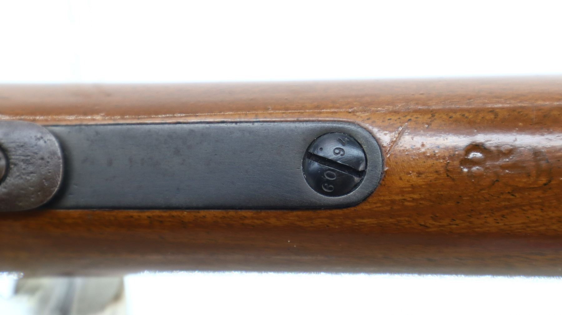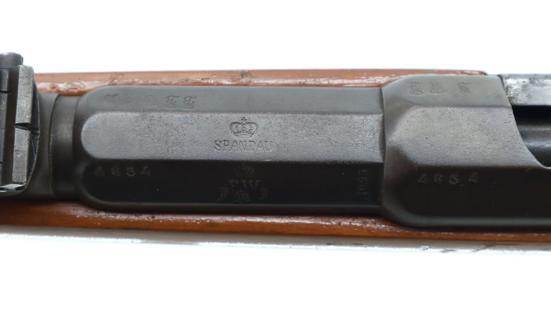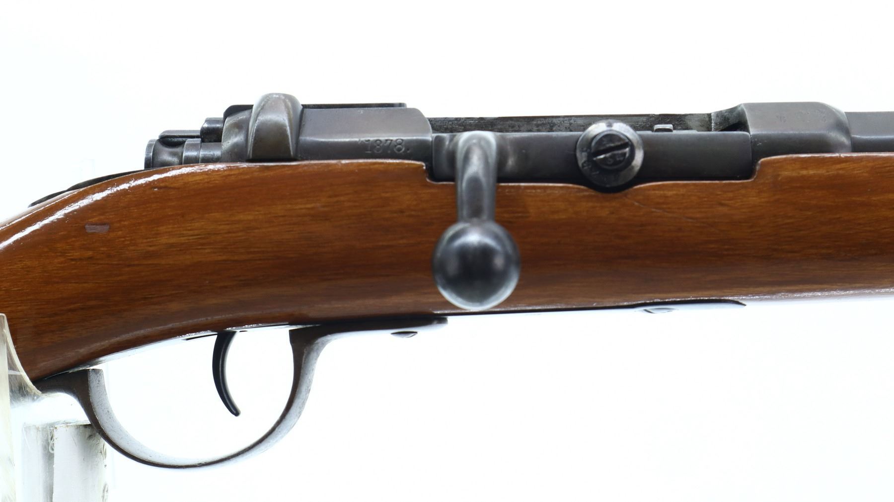 4/10, GERMAN MAUSER , MODEL: 71 SPORTER, CALIBER:43 MAUSER, BORE IS GOOD, LIGHT PITTING. MANUFACTURED BY SPANDAU, BOLT MATCHES FEW SMALL PARTS DO NOT. REPAIRED BLADE FRONT SIGHT, MODIFIED U NOTCHED REAR SIGHT, TURNED DOWN BOLT HANDLE. ONE PIECE SMOOTH SPORTERIZED WOOD STOCK, STRAIGHT GRIP, SMOOTH STEEL BUTT PLATE, SLING SWIVELS. METAL FINISH SILVER GREY WITH LIGHT PITTING, SCRATCHES, HANDLING MARKS AND WEAR. STOCKS SHOW MARKS, SCRATCHES AND WEAR. , ACTION: BOLT ACTION RIFLE, BARREL LENGTH: 24.75", SERIAL # 4634, CONDITION: 4/10, CLASS: CANADIAN ANTIQUE CLASS, NO LICENSE REQUIRED