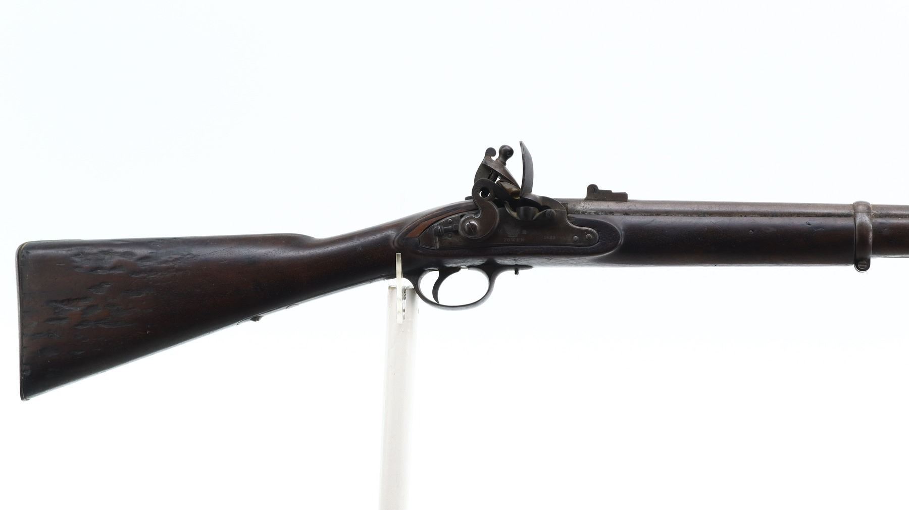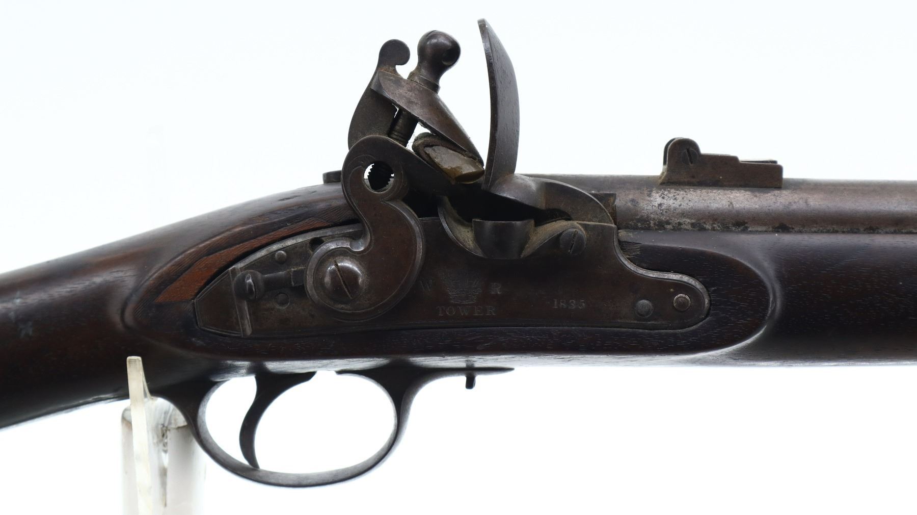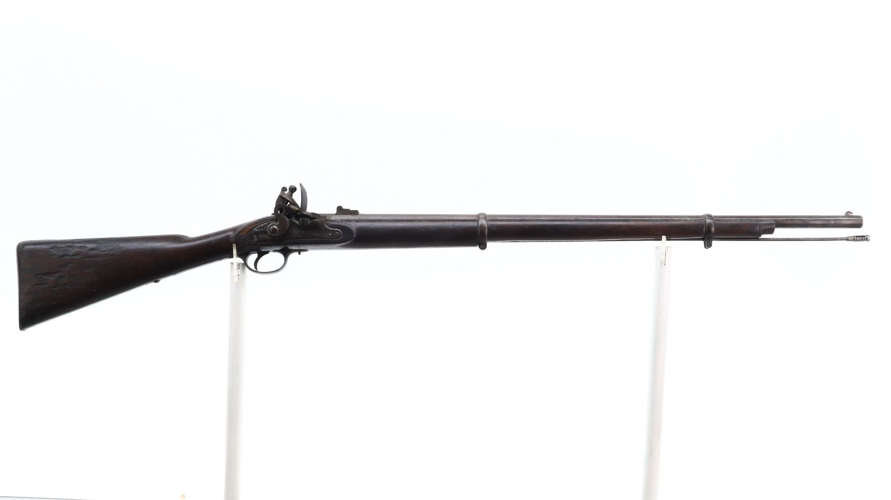 5/10, BRITISH TOWER, MODEL: 1833, CALIBER:62 CAL, COMES WITH BAYONET & POWDER FLASK, BORE IS FAIR, PITTED. BLADE FRONT SIGHT WITH RAMP, U NOTCHED L FLIP REAR SIGHT, ROUND BARREL WITH BRITISH PROOFS, LOCK MARKED W CROWN R TOWER 1835, HAMMER HAS A SAFETY CATCH, PRISON SPRING AND HAMMER FUNCTION. ONE PIECE FULL MILITARY WOOD STOCK, STOCK SHOWS CHIPS, SMALL CRACKS AND REPAIRS AROUND LOCK, STRAIGHT GRIP, SMOOTH STEEL BUTT PLATE, RIGHT SIDE OF BUTT SHOWS NUMEROUS SMALL CRACKS AND DAMAGED SPOTS, TWO BARREL BANDS, REPLACED STEEL RAMROD. ACCESSORIES INCLUDE SOCKET BAYONET MARKED WITH 03 (MISSING LOCK RING), BRASS POWDER FLASK MARKED SYKES PATENT. METAL FINISH TURNING BROWN WITH PITTING, RUST SPECKLES, HANDLING MARKS AND WEAR. STOCKS SHOW MARKS, SCRATCHES AND WEAR. , ACTION: FLINT LOCK RIFLE, BARREL LENGTH: 32", SERIAL # NA, CONDITION: 5/10, CLASS: CANADIAN ANTIQUE CLASS, NO LICENSE REQUIRED