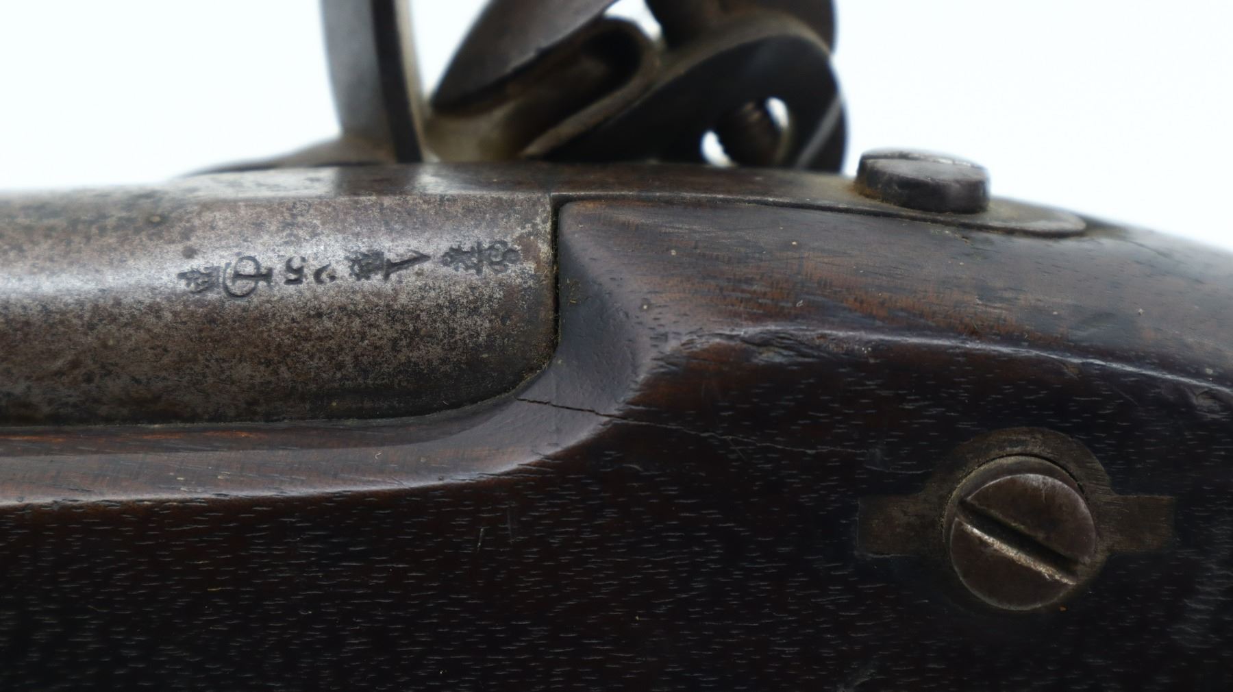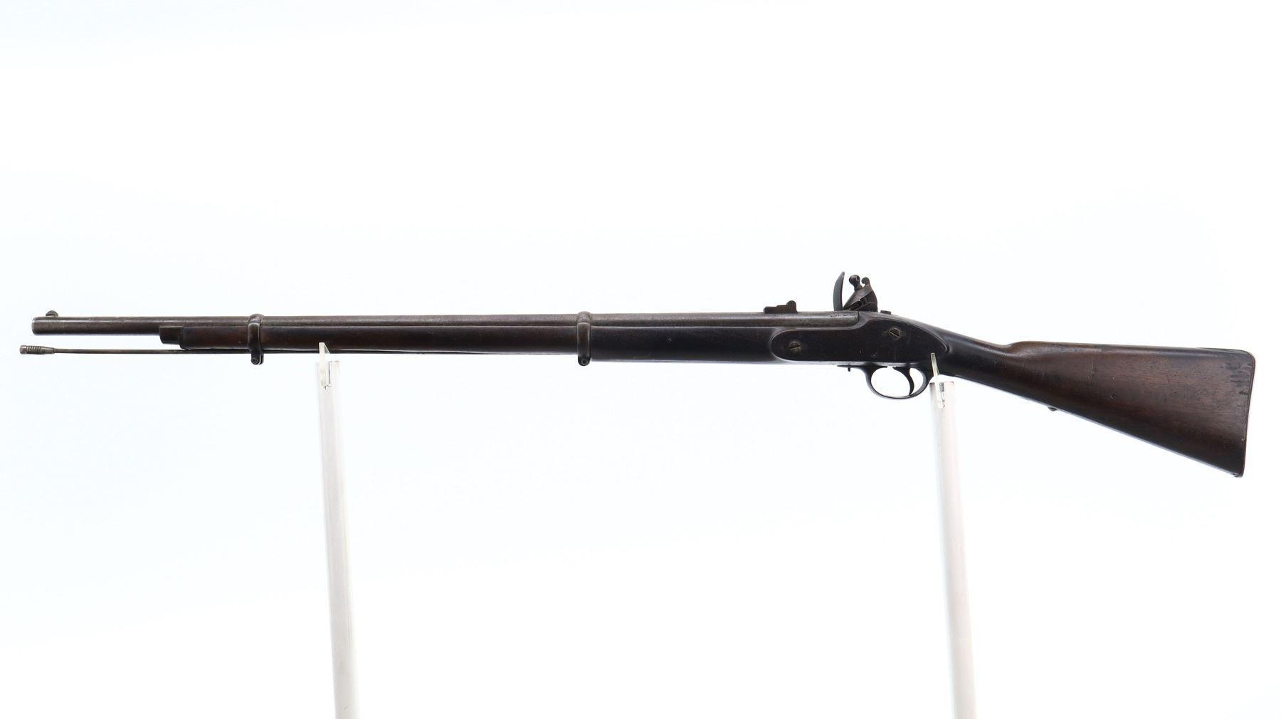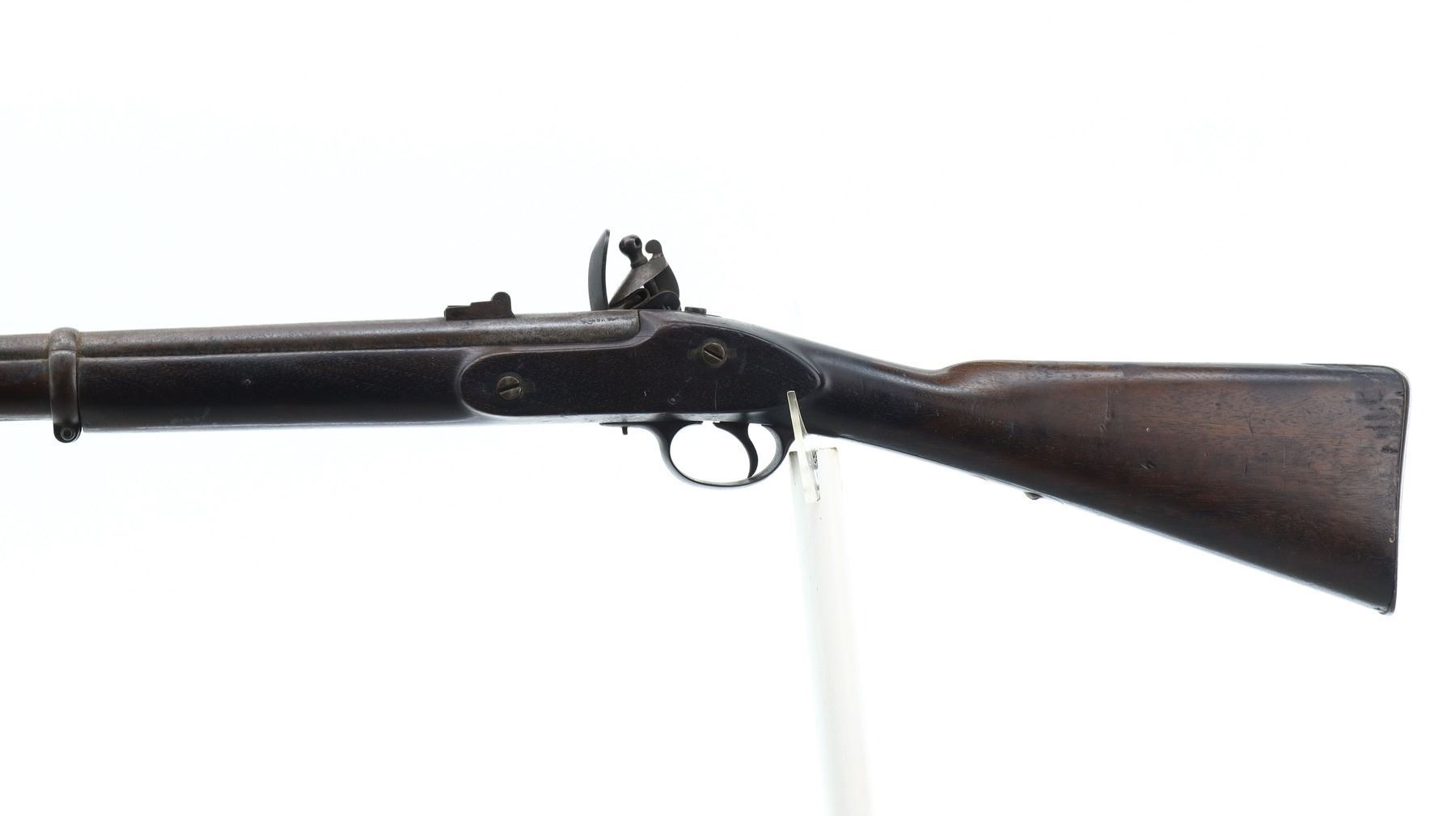5/10, BRITISH TOWER, MODEL: 1833, CALIBER:62 CAL, COMES WITH BAYONET & POWDER FLASK, BORE IS FAIR, PITTED. BLADE FRONT SIGHT WITH RAMP, U NOTCHED L FLIP REAR SIGHT, ROUND BARREL WITH BRITISH PROOFS, LOCK MARKED W CROWN R TOWER 1835, HAMMER HAS A SAFETY CATCH, PRISON SPRING AND HAMMER FUNCTION. ONE PIECE FULL MILITARY WOOD STOCK, STOCK SHOWS CHIPS, SMALL CRACKS AND REPAIRS AROUND LOCK, STRAIGHT GRIP, SMOOTH STEEL BUTT PLATE, RIGHT SIDE OF BUTT SHOWS NUMEROUS SMALL CRACKS AND DAMAGED SPOTS, TWO BARREL BANDS, REPLACED STEEL RAMROD. ACCESSORIES INCLUDE SOCKET BAYONET MARKED WITH 03 (MISSING LOCK RING), BRASS POWDER FLASK MARKED SYKES PATENT. METAL FINISH TURNING BROWN WITH PITTING, RUST SPECKLES, HANDLING MARKS AND WEAR. STOCKS SHOW MARKS, SCRATCHES AND WEAR. , ACTION: FLINT LOCK RIFLE, BARREL LENGTH: 32", SERIAL # NA, CONDITION: 5/10, CLASS: CANADIAN ANTIQUE CLASS, NO LICENSE REQUIRED