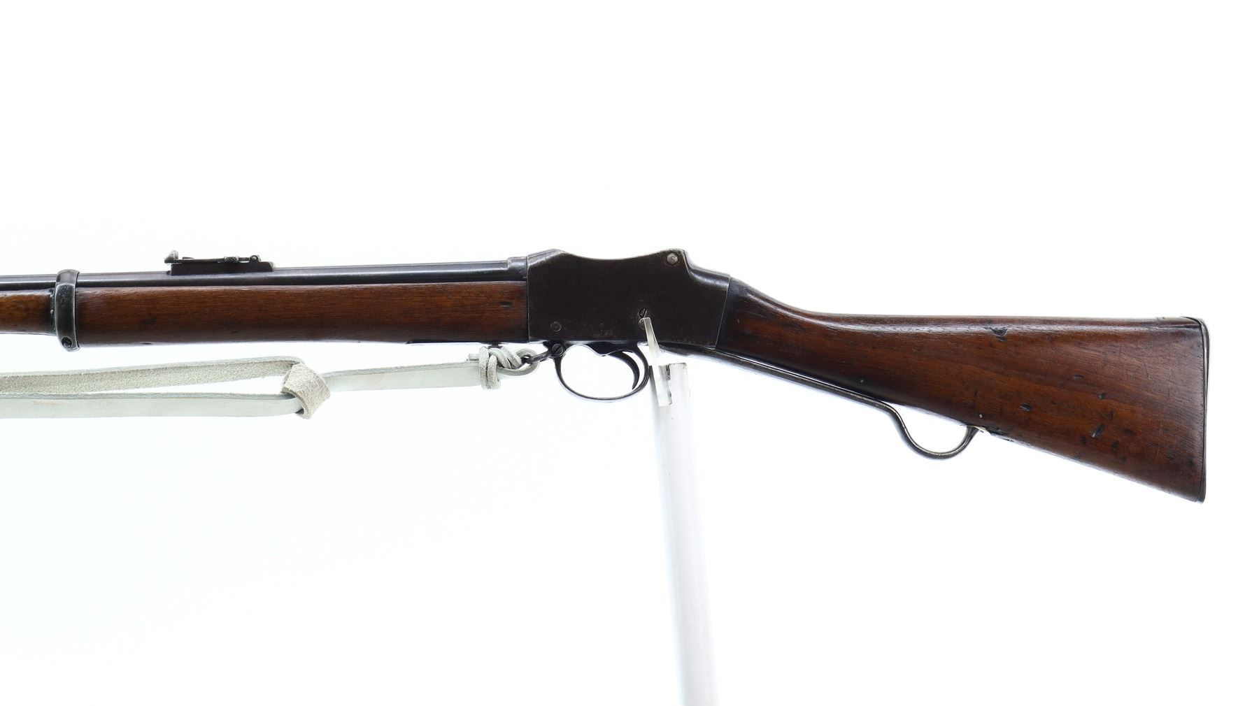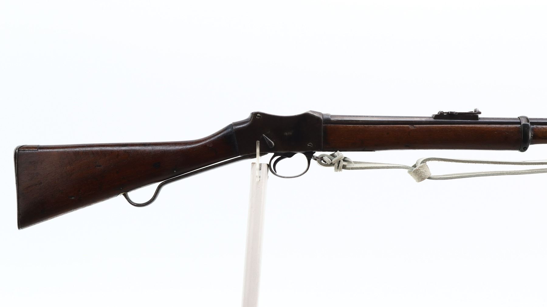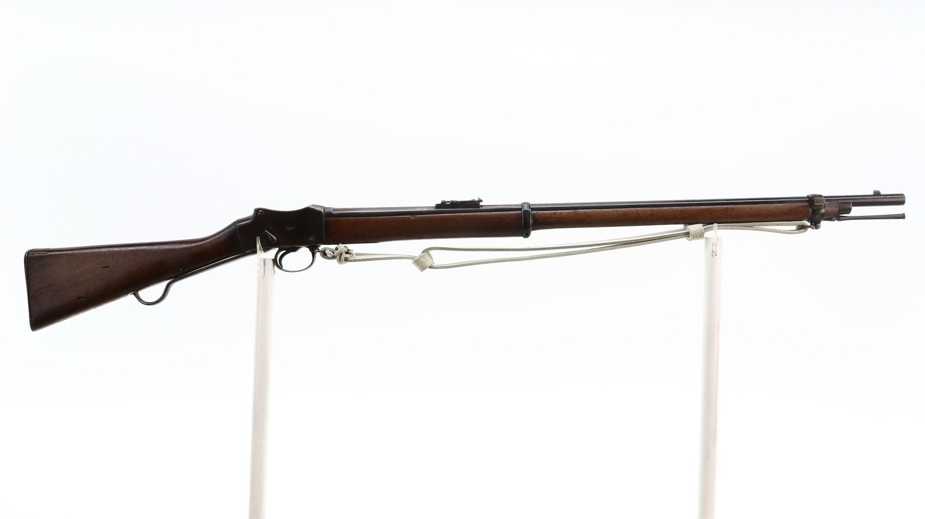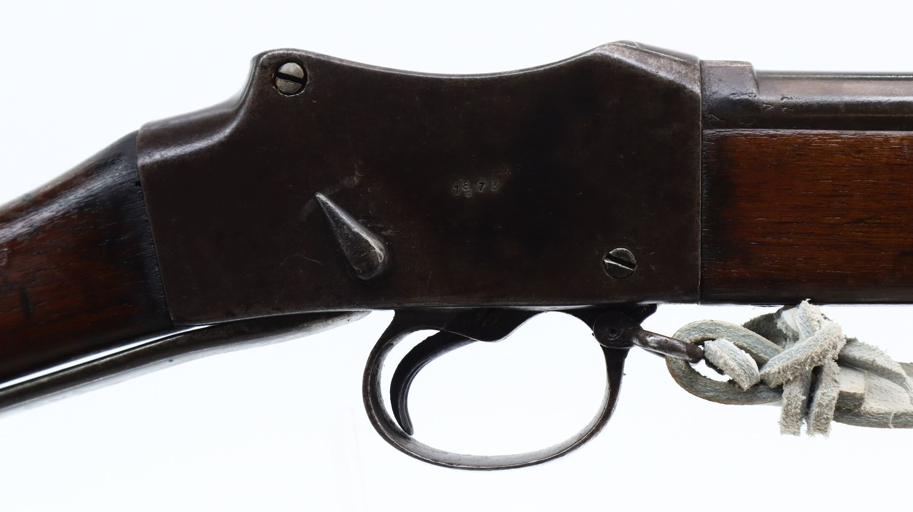 5/10, MARTINI HENRY, MODEL: MKIV, CALIBER:577-450, BORE IS FAIR, PITTED. BARLEY CORN FRONT SIGHT WITH RAMP, ADJUSTABLE U NOTCHED REAR SIGHT, METAL HAS BEEN REBLUED, RECEIVER HAS FAINT ED AND RE STAMPED 1873 ON RIGHT SIDE, SMALL COCKING INDICATOR, LONG LEVER. TWO PIECE SMOOTH FULL MILITARY WOOD STOCKS, SMOOTH STEEL BUTT PLATE, STOCK HAS ARMOURERS REPAIR AT HEEL, SWIVELS WITH WHITE LEATHER SLING, RAMROD, BAYONET LUG. METAL FINISH SHOWS LIGHT PITTING, RUST SPECKLES, SCRATCHES, HANDLING MARKS AND WEAR. STOCK SHOWS MARKS, SCRATCHES AND WEAR. , ACTION: HINGED SINGLE SHOT RIFLE, BARREL LENGTH: 33", SERIAL # NA, CONDITION: 5/10, CLASS: CANADIAN ANTIQUE CLASS, NO LICENSE REQUIRED