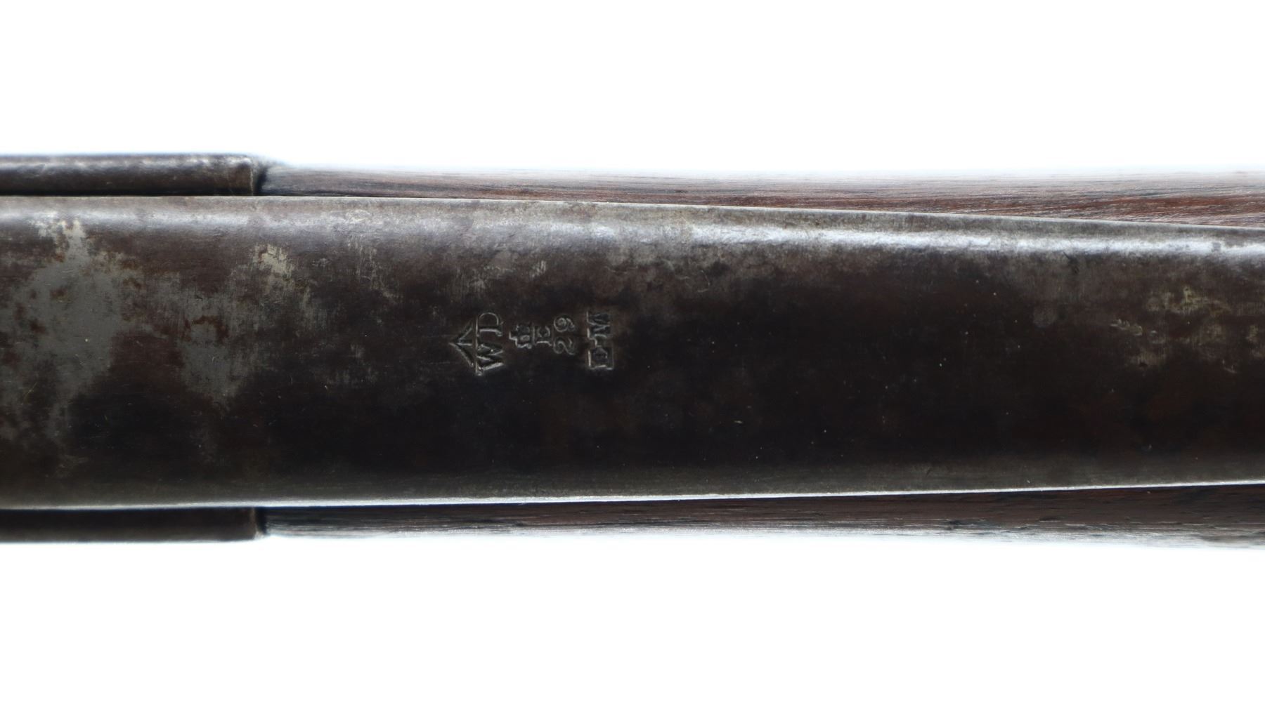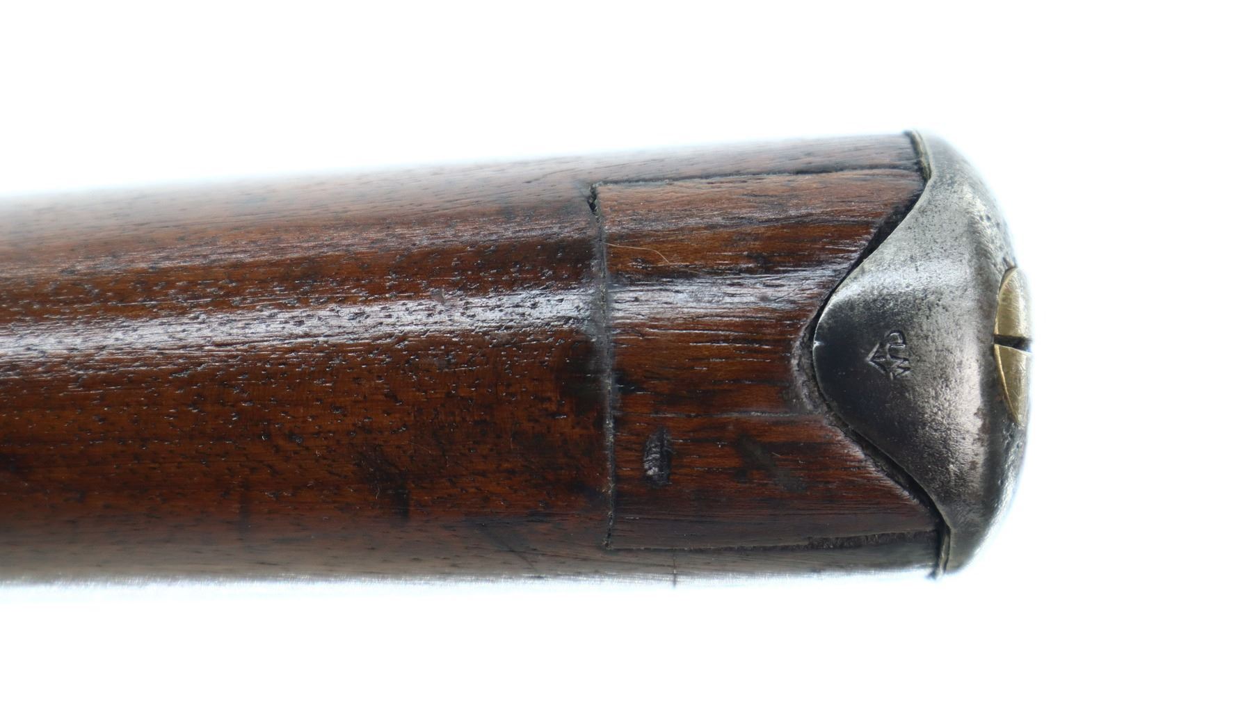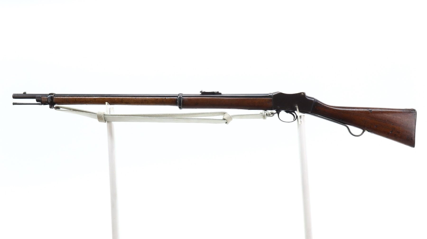 5/10, MARTINI HENRY, MODEL: MKIV, CALIBER:577-450, BORE IS FAIR, PITTED. BARLEY CORN FRONT SIGHT WITH RAMP, ADJUSTABLE U NOTCHED REAR SIGHT, METAL HAS BEEN REBLUED, RECEIVER HAS FAINT ED AND RE STAMPED 1873 ON RIGHT SIDE, SMALL COCKING INDICATOR, LONG LEVER. TWO PIECE SMOOTH FULL MILITARY WOOD STOCKS, SMOOTH STEEL BUTT PLATE, STOCK HAS ARMOURERS REPAIR AT HEEL, SWIVELS WITH WHITE LEATHER SLING, RAMROD, BAYONET LUG. METAL FINISH SHOWS LIGHT PITTING, RUST SPECKLES, SCRATCHES, HANDLING MARKS AND WEAR. STOCK SHOWS MARKS, SCRATCHES AND WEAR. , ACTION: HINGED SINGLE SHOT RIFLE, BARREL LENGTH: 33", SERIAL # NA, CONDITION: 5/10, CLASS: CANADIAN ANTIQUE CLASS, NO LICENSE REQUIRED