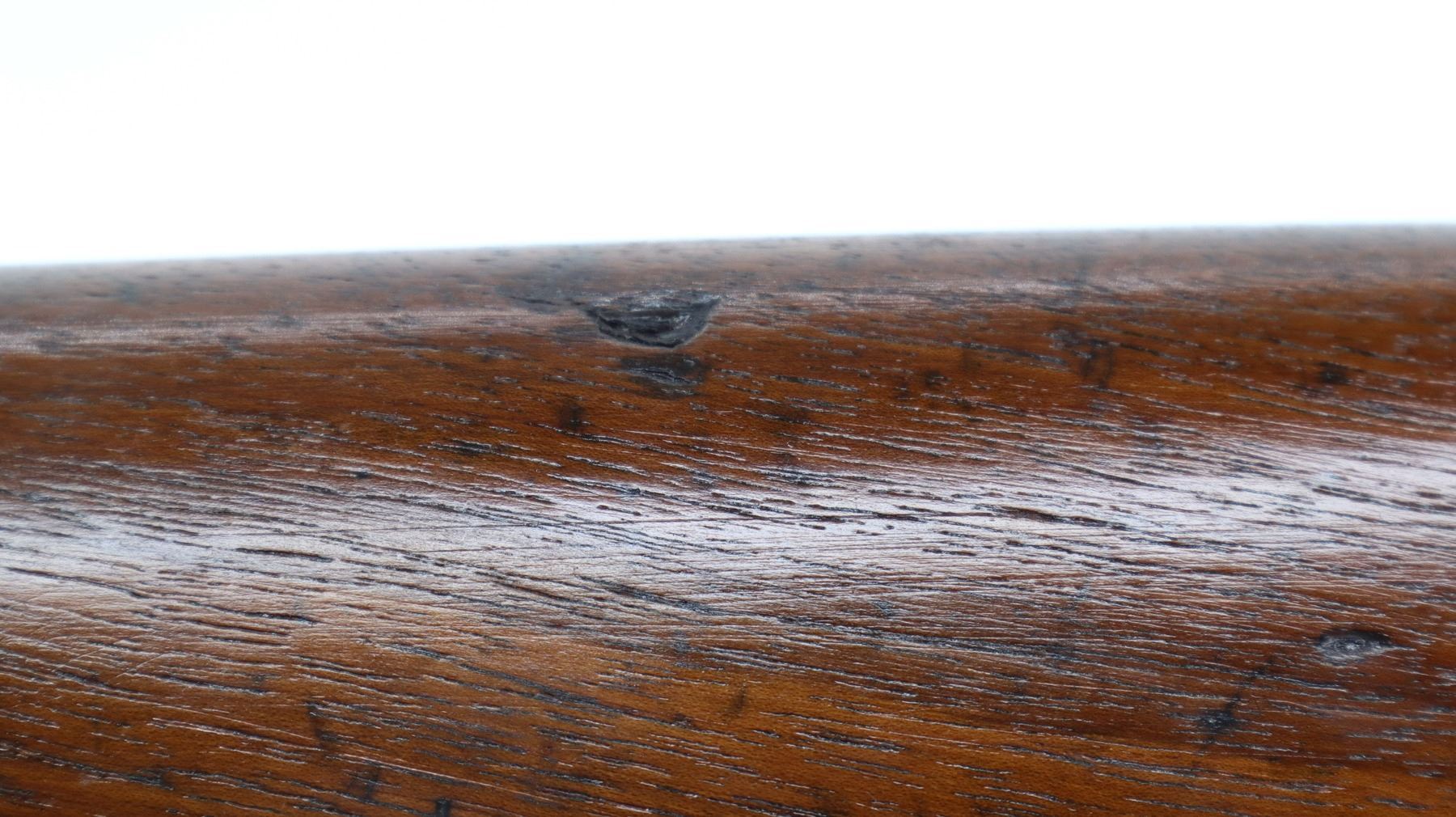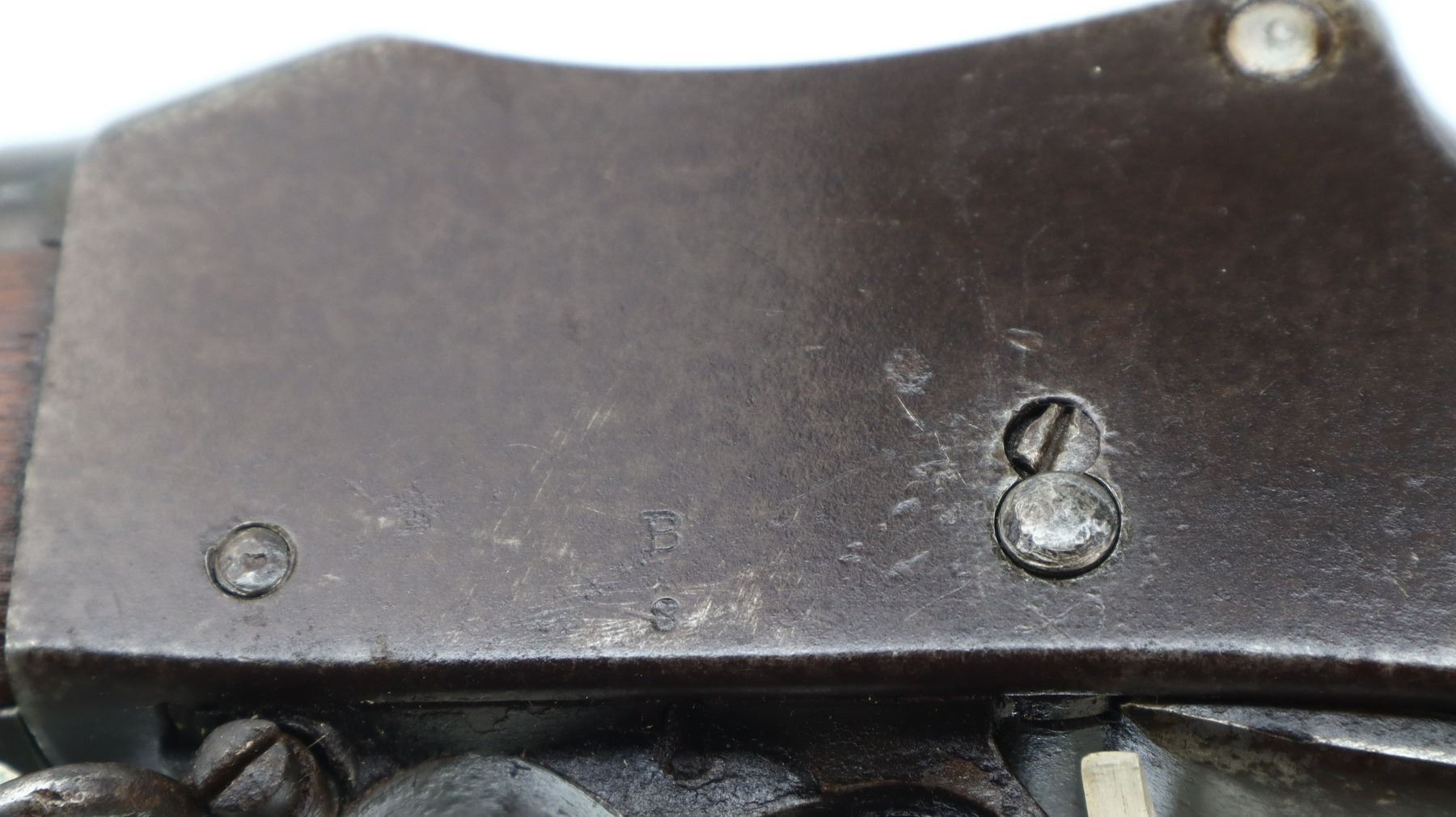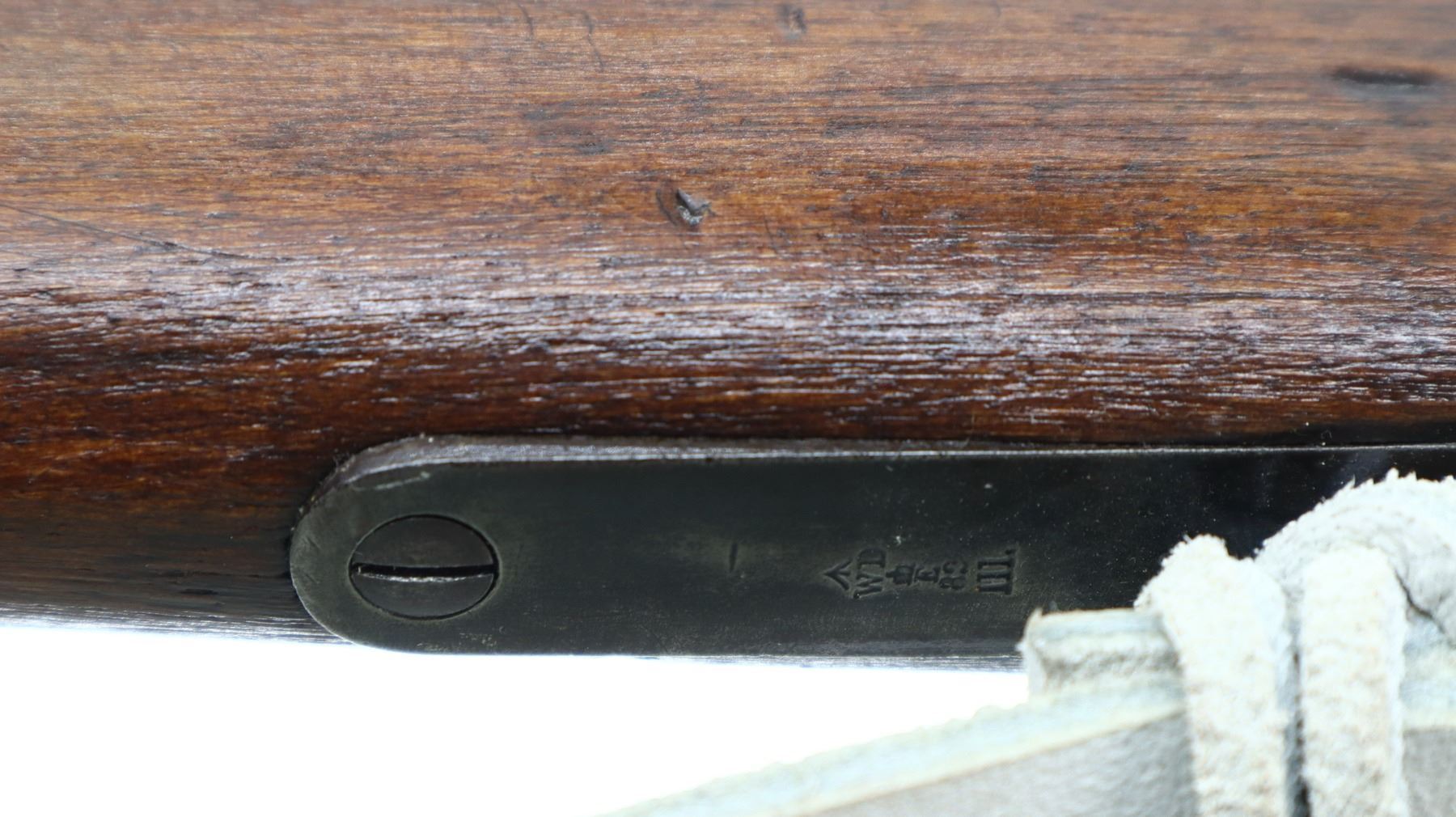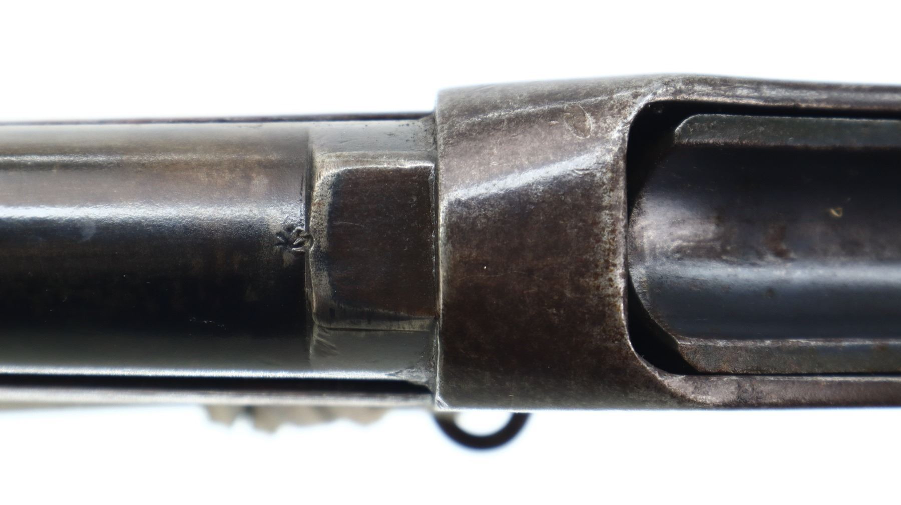 5/10, MARTINI HENRY, MODEL: MKIV, CALIBER:577-450, BORE IS FAIR, PITTED. BARLEY CORN FRONT SIGHT WITH RAMP, ADJUSTABLE U NOTCHED REAR SIGHT, METAL HAS BEEN REBLUED, RECEIVER HAS FAINT ED AND RE STAMPED 1873 ON RIGHT SIDE, SMALL COCKING INDICATOR, LONG LEVER. TWO PIECE SMOOTH FULL MILITARY WOOD STOCKS, SMOOTH STEEL BUTT PLATE, STOCK HAS ARMOURERS REPAIR AT HEEL, SWIVELS WITH WHITE LEATHER SLING, RAMROD, BAYONET LUG. METAL FINISH SHOWS LIGHT PITTING, RUST SPECKLES, SCRATCHES, HANDLING MARKS AND WEAR. STOCK SHOWS MARKS, SCRATCHES AND WEAR. , ACTION: HINGED SINGLE SHOT RIFLE, BARREL LENGTH: 33", SERIAL # NA, CONDITION: 5/10, CLASS: CANADIAN ANTIQUE CLASS, NO LICENSE REQUIRED