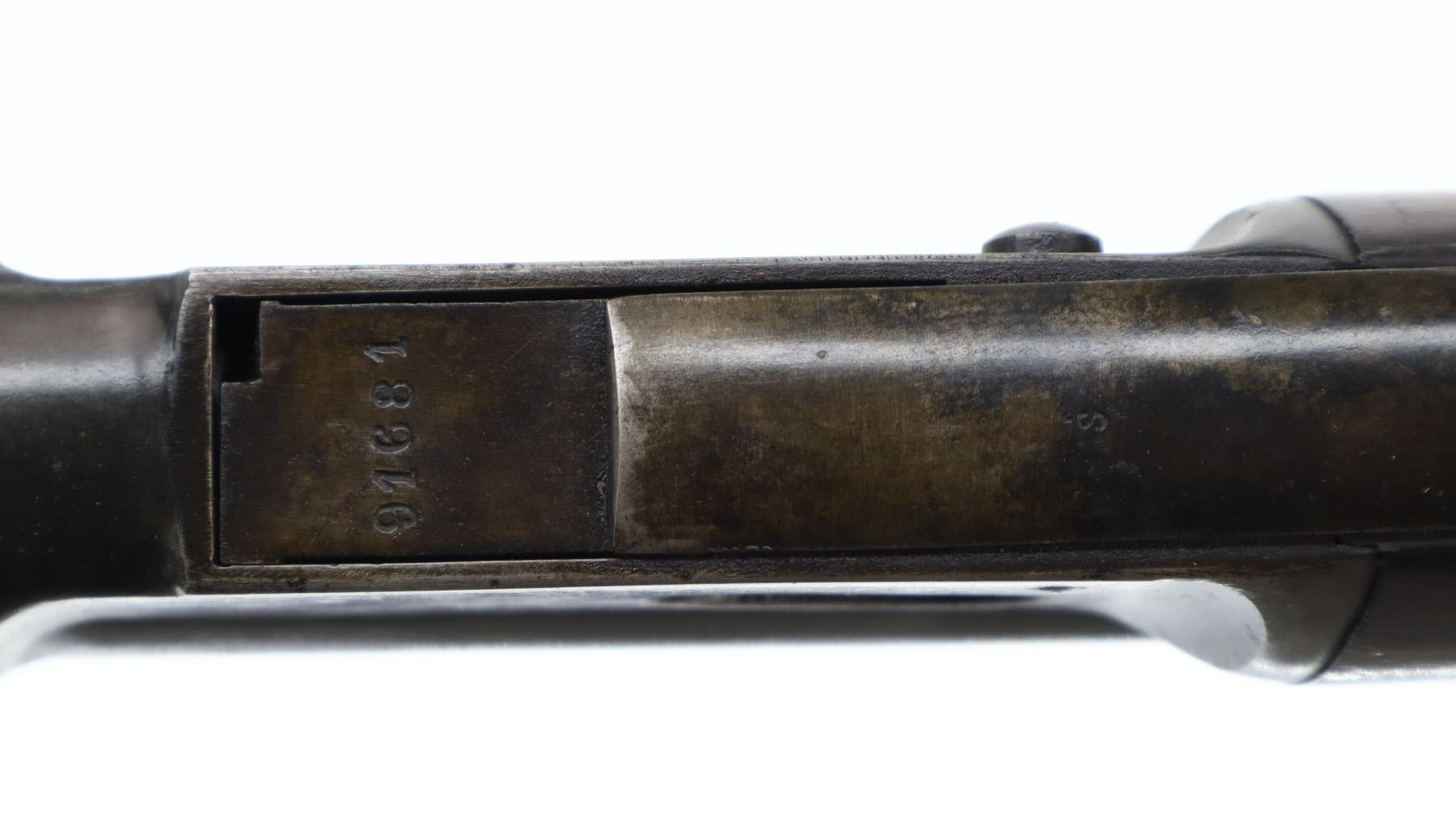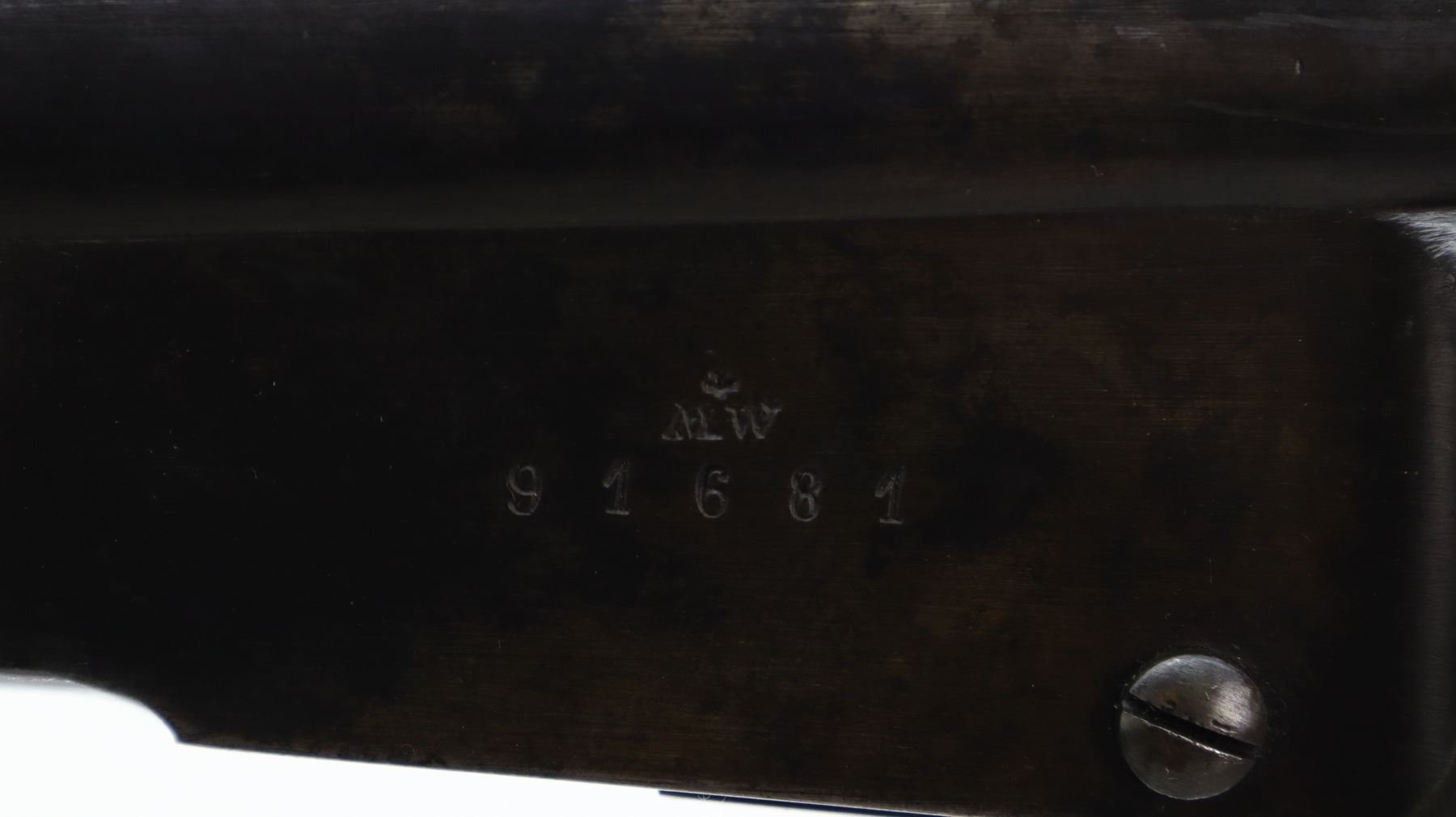 6/10, SWISS VETTERLLI, MODEL: 1889 RIFLE, CALIBER:41 SWISS RF, BORE IS VERY GOOD. MANUFACTURED 1892, BOLT MISMATCHED. BLADE FRONT SIGHT WITH RAMP, ADJUSTABLE U NOTCHED REAR SIGHT, BLUED FINISH. TWO PIECE FULL MILITARY WOOD STOCKS, CHECKERED FOREARM, STRAIGHT GRIP, SMOOTH STEEL BUTT PLATE, FINGER REST TRIGGER GUARD, SLING SWIVELS, RAMROD. METAL FINISH TURNING BROWN WITH LIGHT RUST SPECKLES, SCRATCHES, HANDLING MARKS AND WEAR. STOCKS SHOW SOME MARKS, SCRATCHES AND WEAR. , ACTION: BOLT ACTION RIFLE, BARREL LENGTH: 33", SERIAL # 91681, CONDITION: 6/10, CLASS: CANADIAN ANTIQUE CLASS, NO LICENSE REQUIRED