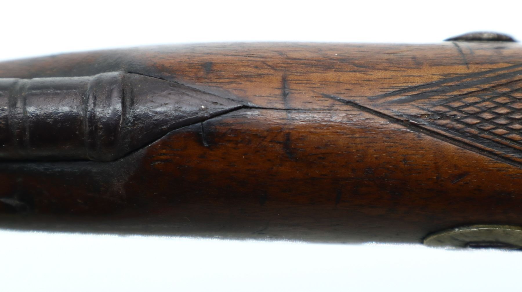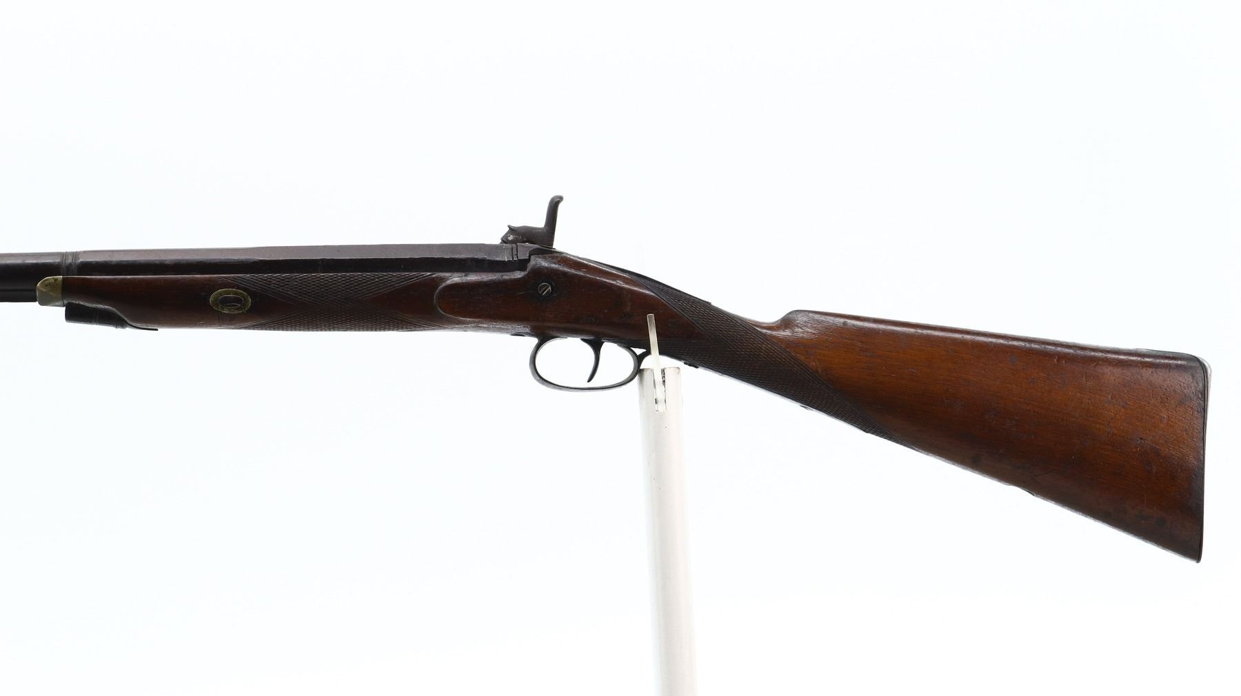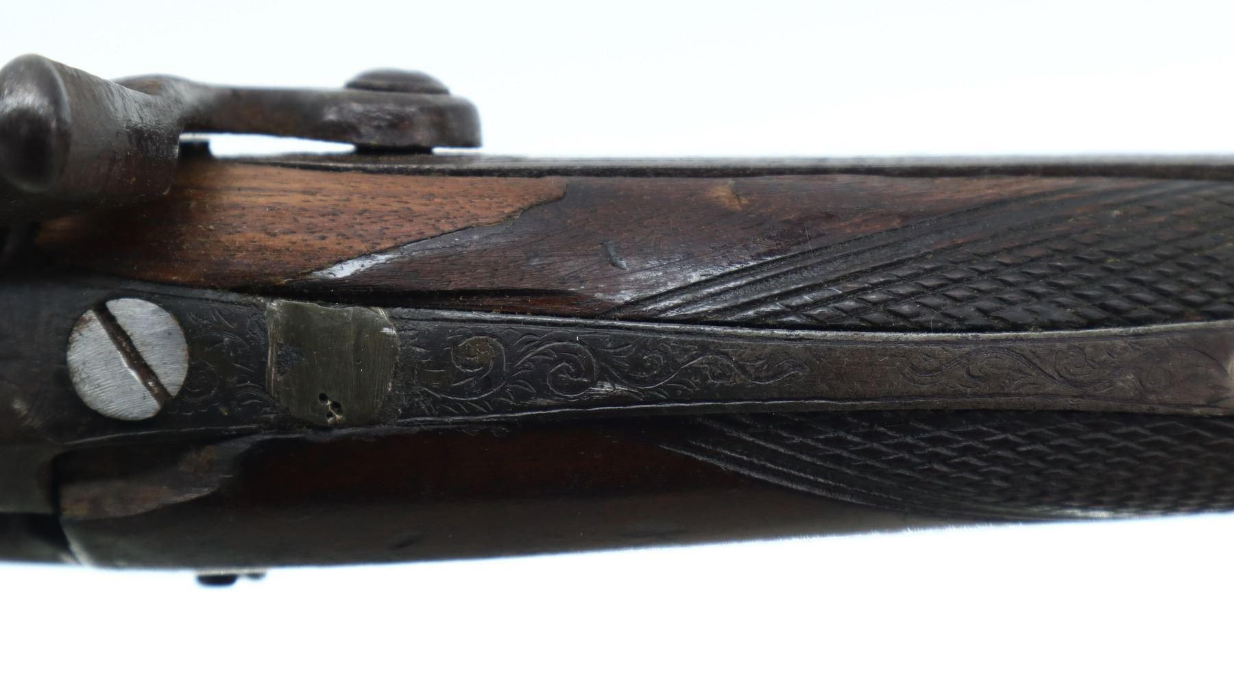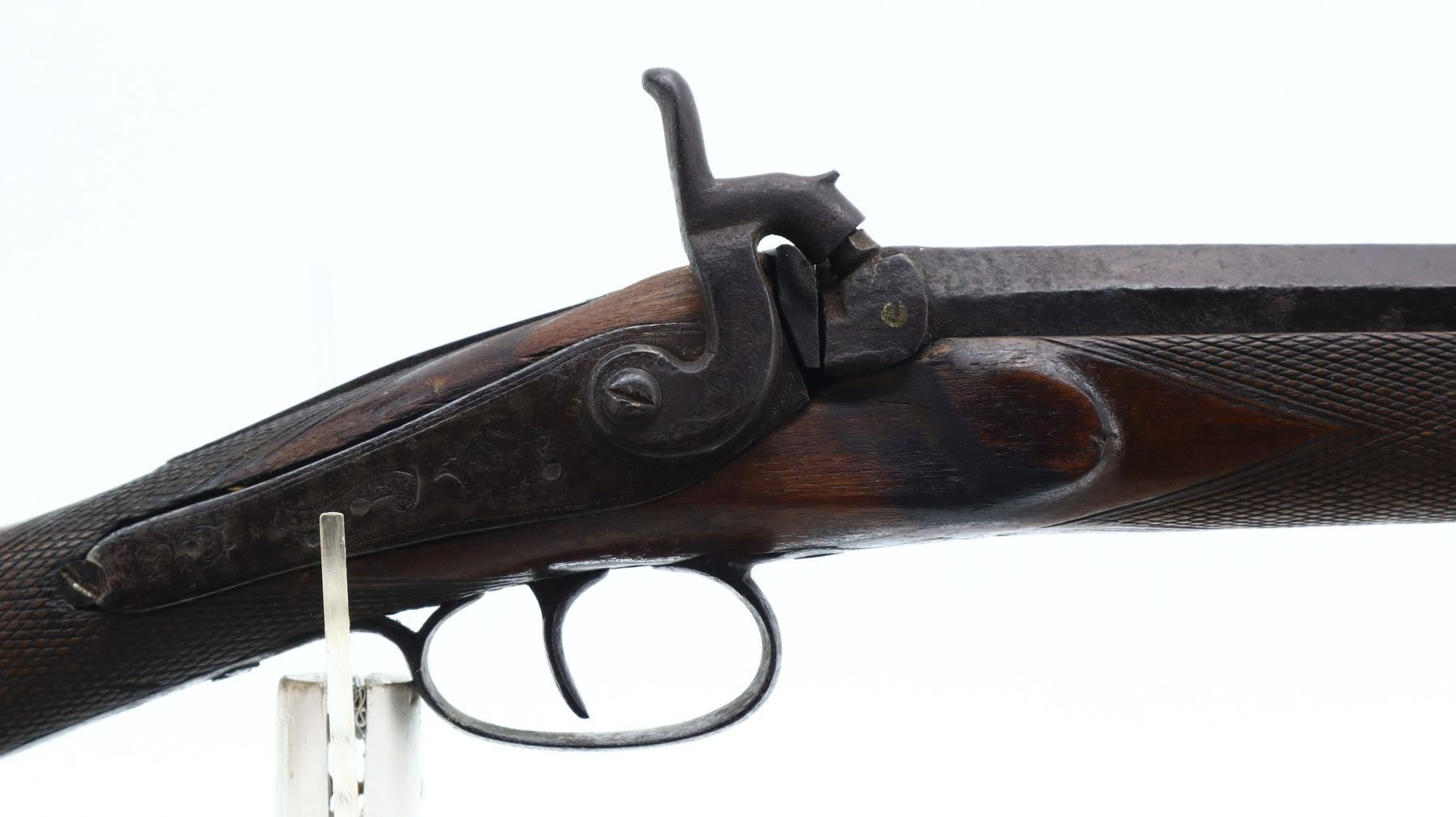 5/10, JOSEPH GOLCHER, MODEL: PERCUSSION FOWLER, CALIBER:12 G, BORE IS POOR, PITTED. REPLACED BRASS BEAD, 1/3RD OCTAGON 2/3RD ROUND BARREL, BREECH PLUG TANG HAS BEEN WELDED AND REPAIRED, ENGRAVED BACK ACTION LOCK AND HAMMER THAT FUNCTIONS. ONE PIECE HALF WOOD STOCK, CHECKERED FOREARM AND STRAIGHT GRIP, SMOOTH STEEL BUTT PLATE, ENGRAVED STEEL TRIGGER GUARD, MISSING VANITY PLATE, RAMROD AND PIPES. METAL FINISH TURNING BROWN WITH PITTING, LIGHT RUST, HANDLING MARKS AND WEAR. STOCK SHOWS MARKS, SCRATCHES AND WEAR. , ACTION: PERCUSSION SHOTGUN, BARREL LENGTH: 32", SERIAL # NA, CONDITION: 5/10, CLASS: CANADIAN ANTIQUE CLASS, NO LICENSE REQUIRED