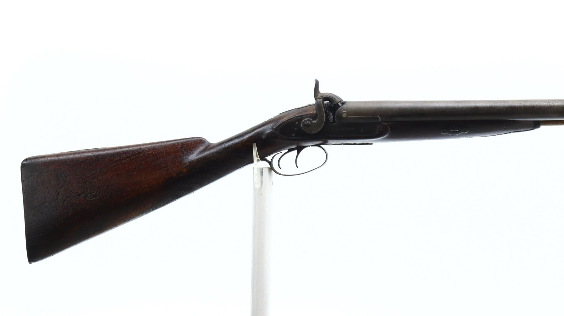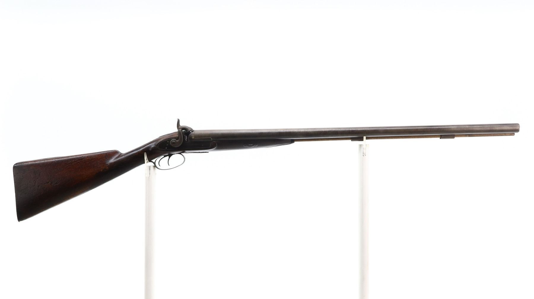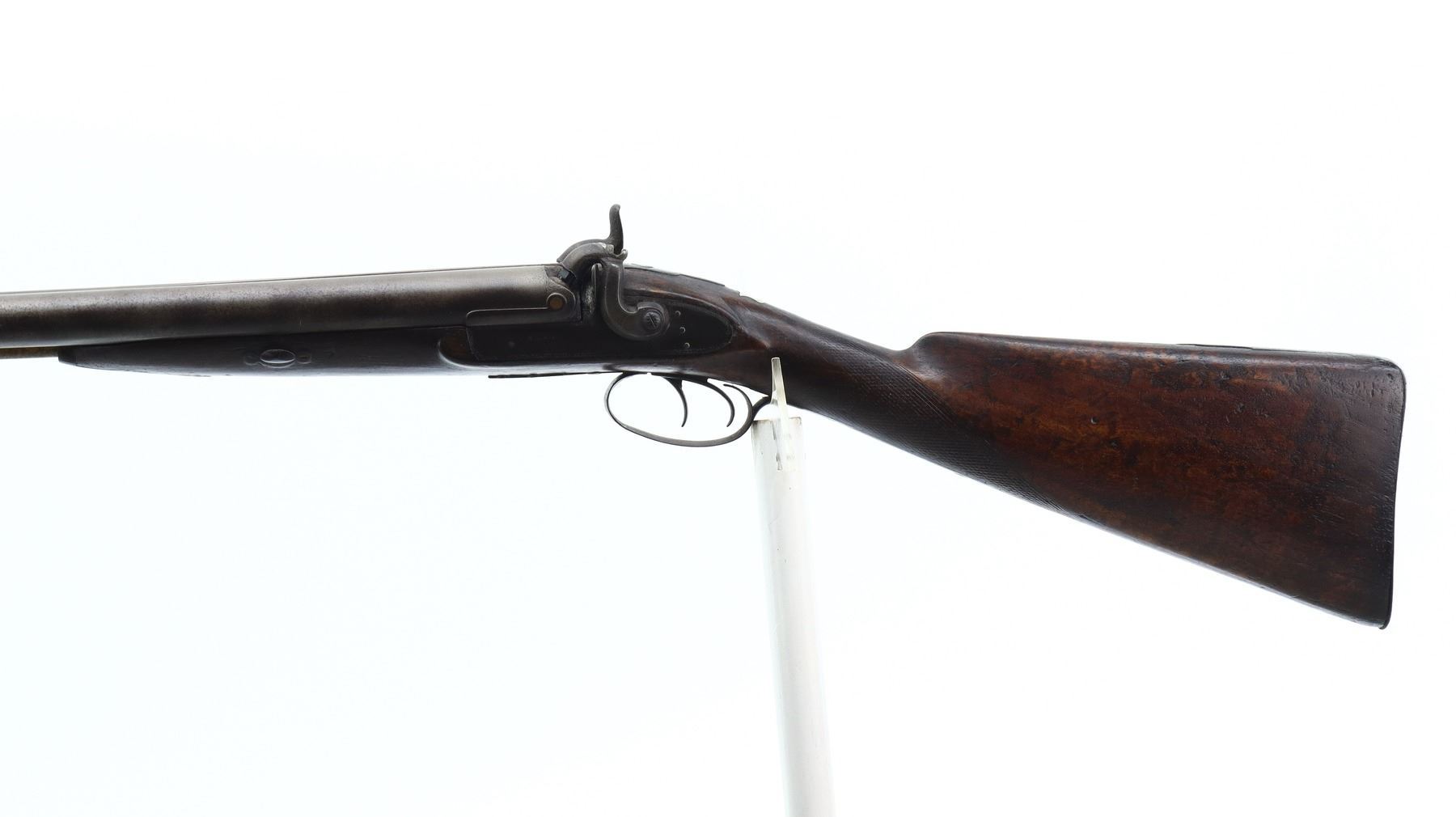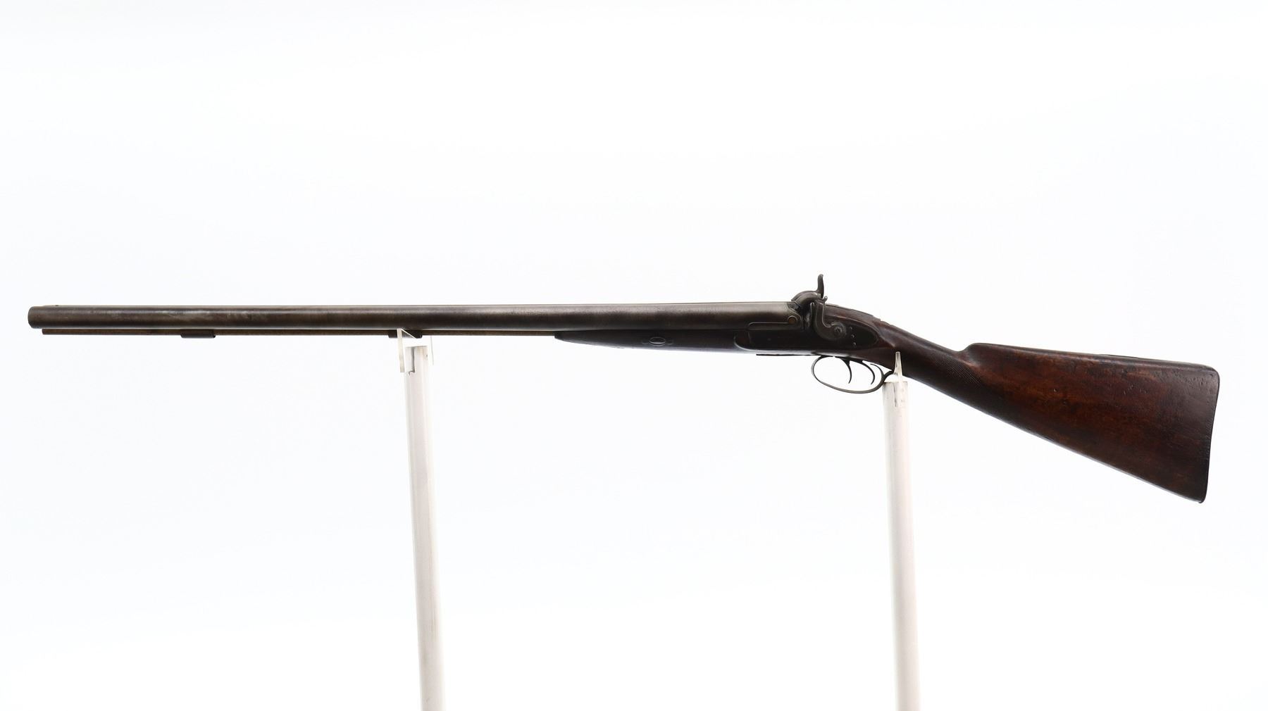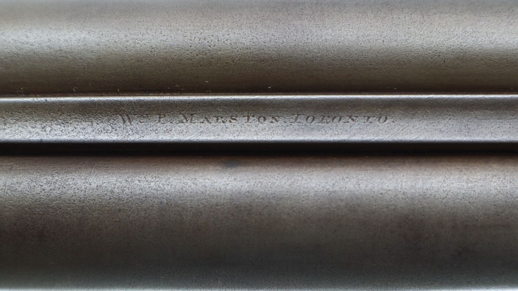 4/10, MARSTON, MODEL: SIDE BY SIDE, CALIBER:10 G, BORES ARE POOR, PITTED. MADE IN TORONTO. SILVER BEAD, DAMASCUS BARRELS WITH SMOOTH RIB, DAMAGED MUZZLES, NIPPLES REPLACED, ENGRAVED SIDE LOCKS WITH CHECKERED SPUR HAMMER LEFT SIDE IS BROKEN, DOUBLE TRIGGERS. ONE PIECE HALF LENGTH WOOD STOCK, FOREARM CRACKED, CHECKERED STRAIGHT GRIP, SMOOTH STEEL BUTT PLATE AND TRIGGER GUARD, REPLACED WOOD RAMROD. METAL FINISH SHOWS PITTING, LIGHT RUST, SCRATCHES, HANDLING MARKS AND WEAR. STOCK SHOWS MARKS, SCRATCHES AND WEAR. , ACTION: SIDE BY SIDE PERCUSSION SHOTGUN, BARREL LENGTH: 29.5", SERIAL # NA, CONDITION: 4/10, CLASS: CANADIAN ANTIQUE CLASS, NO LICENSE REQUIRED