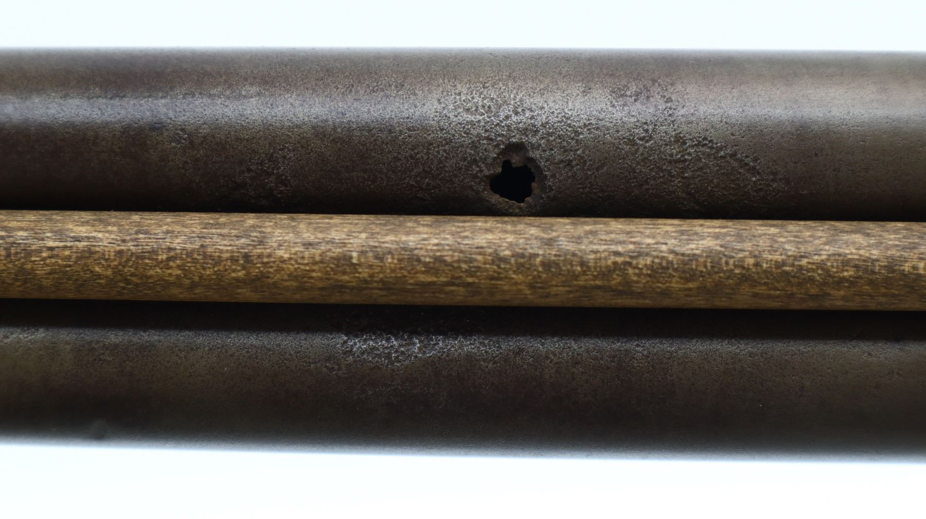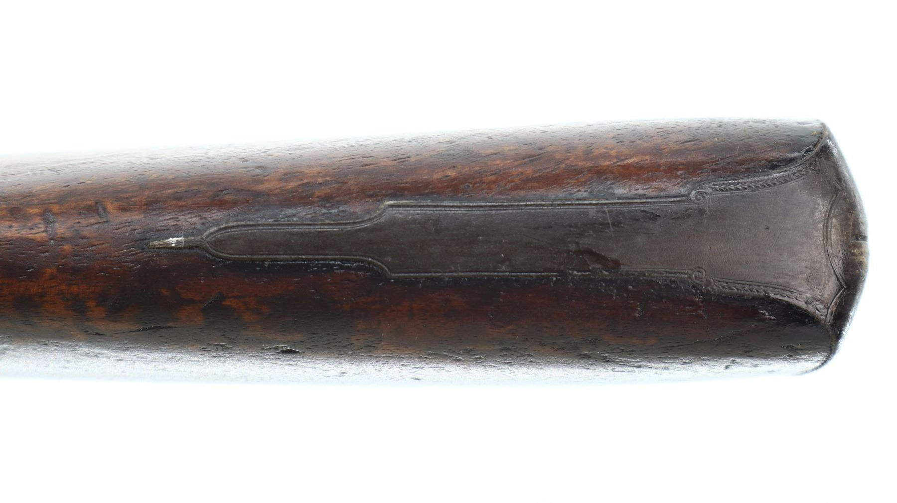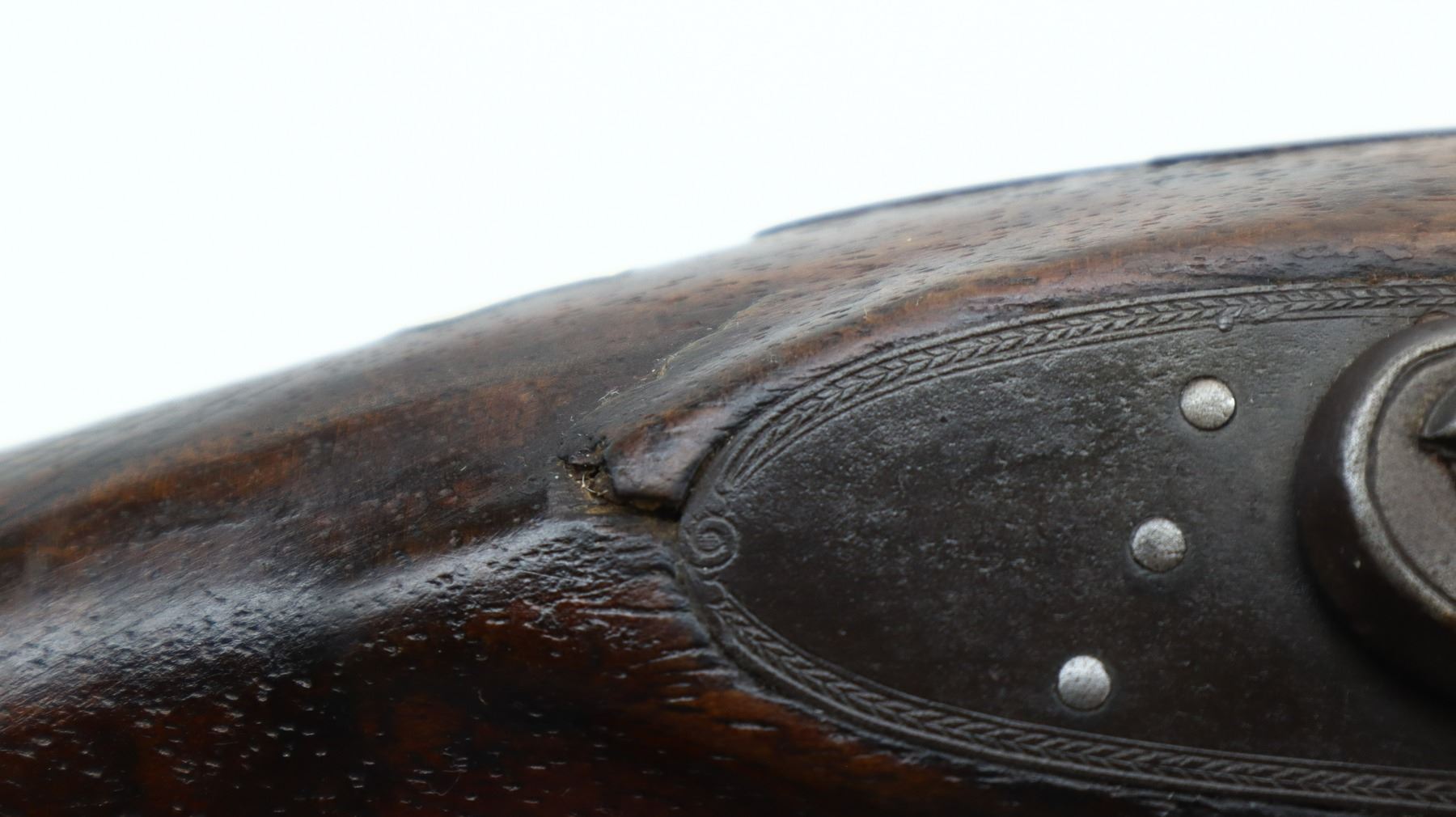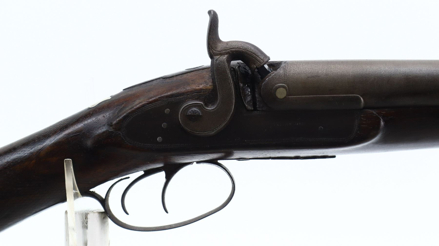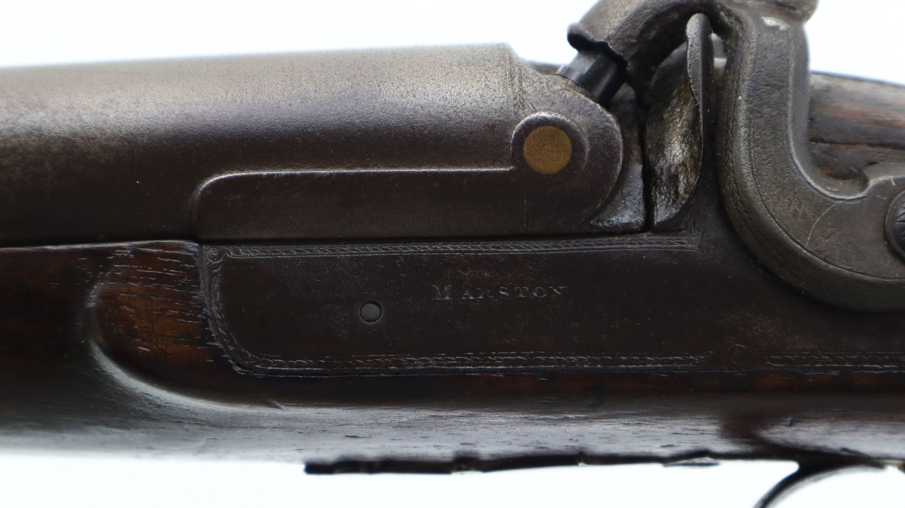 4/10, MARSTON, MODEL: SIDE BY SIDE, CALIBER:10 G, BORES ARE POOR, PITTED. MADE IN TORONTO. SILVER BEAD, DAMASCUS BARRELS WITH SMOOTH RIB, DAMAGED MUZZLES, NIPPLES REPLACED, ENGRAVED SIDE LOCKS WITH CHECKERED SPUR HAMMER LEFT SIDE IS BROKEN, DOUBLE TRIGGERS. ONE PIECE HALF LENGTH WOOD STOCK, FOREARM CRACKED, CHECKERED STRAIGHT GRIP, SMOOTH STEEL BUTT PLATE AND TRIGGER GUARD, REPLACED WOOD RAMROD. METAL FINISH SHOWS PITTING, LIGHT RUST, SCRATCHES, HANDLING MARKS AND WEAR. STOCK SHOWS MARKS, SCRATCHES AND WEAR. , ACTION: SIDE BY SIDE PERCUSSION SHOTGUN, BARREL LENGTH: 29.5", SERIAL # NA, CONDITION: 4/10, CLASS: CANADIAN ANTIQUE CLASS, NO LICENSE REQUIRED