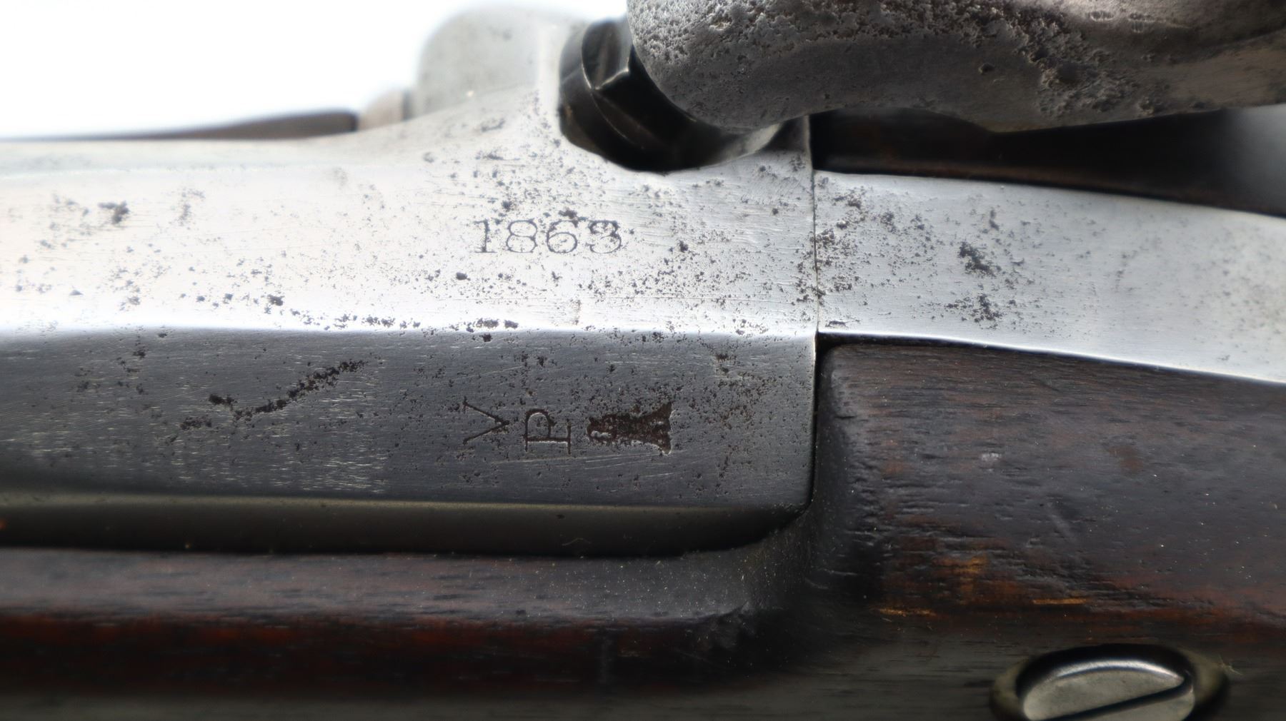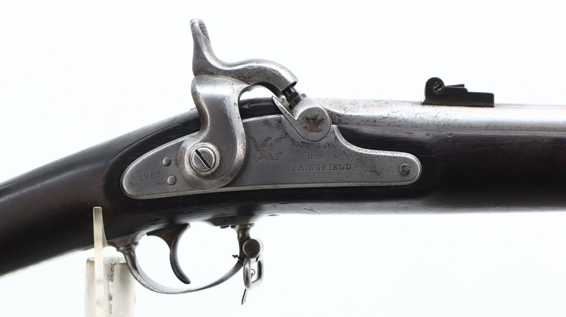 5/10, U.S. SPRINGFIELD, MODEL: 1861 MUSKET, CALIBER:58 CAL, BORE IS FAIR, PITTED. DATED 1863 ON BARREL AND LOCK. BLADE FRONT SIGHT WITH RAMP, ADJUSTABLE U NOTCHED THREE LEAF FOLDING REAR SIGHT, TAPERED ROUND BARREL, CHECKERED SPUR HAMMER (FUNCTIONS). ONE PIECE SMOOTH FULL MILITARY WOOD STOCK, STRAIGHT GRIP, SMOOTH STEEL BUTT PLATE MARKED US, STEEL TRIGGER GUARD, SLING SWIVELS, RAMROD. METAL FINISH SILVER GREY WITH PITTING, SCRATCHES, HANDLING MARKS AND WEAR. STOCK SHOWS MARKS, SCRATCHES AND WEAR. , ACTION: PERCUSSION RIFLE, BARREL LENGTH: 39.5", SERIAL # NA, CONDITION: 5/10, CLASS: CANADIAN ANTIQUE CLASS, NO LICENSE REQUIRED
