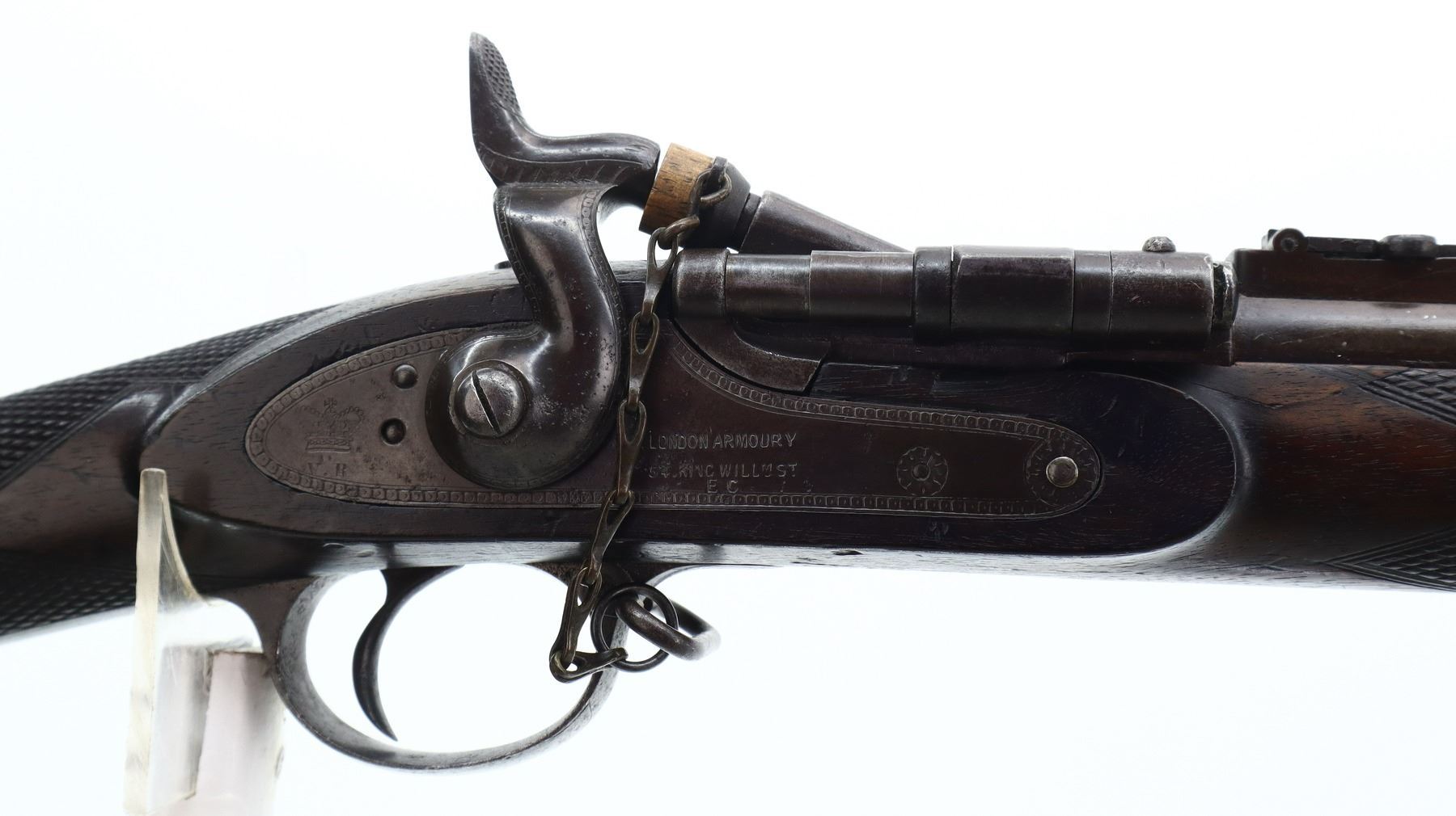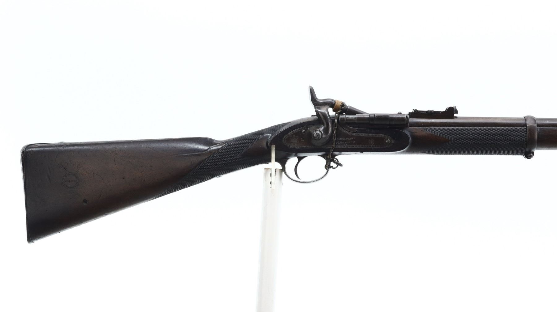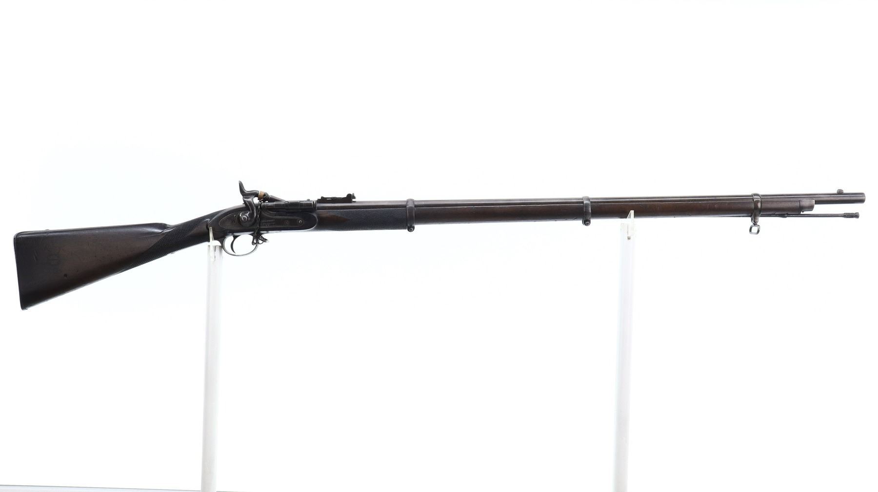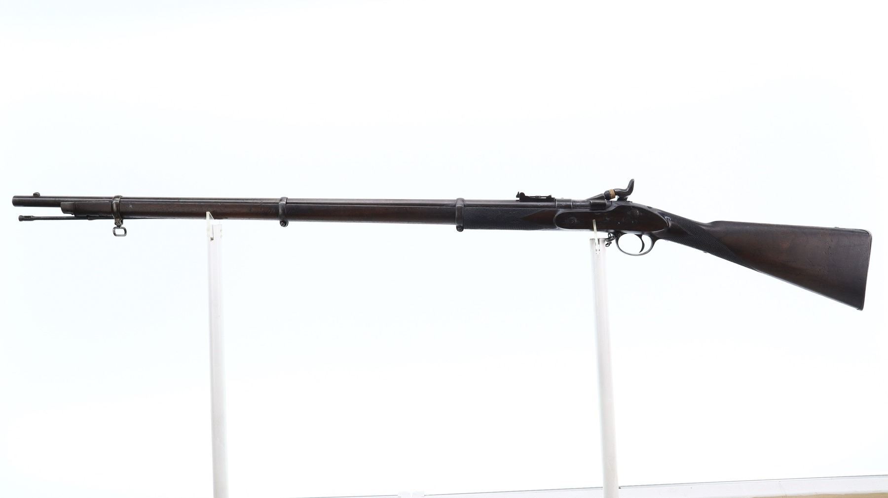 5+/10, SNIDER ENFIELD, MODEL: MKII** THREE BAND, CALIBER:577 SNIDER, BORE IS FAIR, LIGHT PITTING. MANUFACTURED BY LONDON ARMOURY. BLADE FRONT SIGHT WITH RAMP, ADJUSTABLE U NOTCHED LADDER REAR SIGHT, BREECH BLOCK IS SLIGHTLY LOOSE, ENGRAVED LOCK AND CHECKERED HAMMER, NIPPLE PROTECTOR, LEATHER REPLACED WITH WOOD. ONE PIECE FULL MILITARY WOOD STOCK, CHECKERED FOREARM AND STRAIGHT GRIP, SMOOTH STEEL BUTT PLATE, LONDON ARMOURIES ROUNDEL ON RIGHT SIDE OF BUTT, STEEL TRIGGER GUARD, SLING SWIVELS, RAMROD. METAL FINISH TURNING BROWN WITH SOME LIGHT PITTED SPOTS, SCRATCHES, HANDLING MARKS AND WEAR. STOCK SHOWS SOME MARKS, SCRATCHES AND WEAR. , ACTION: HINGED SINGLE SHOT RIFLE, BARREL LENGTH: 36.5", SERIAL # 29, CONDITION: 5+/10, CLASS: CANADIAN ANTIQUE CLASS, NO LICENSE REQUIRED