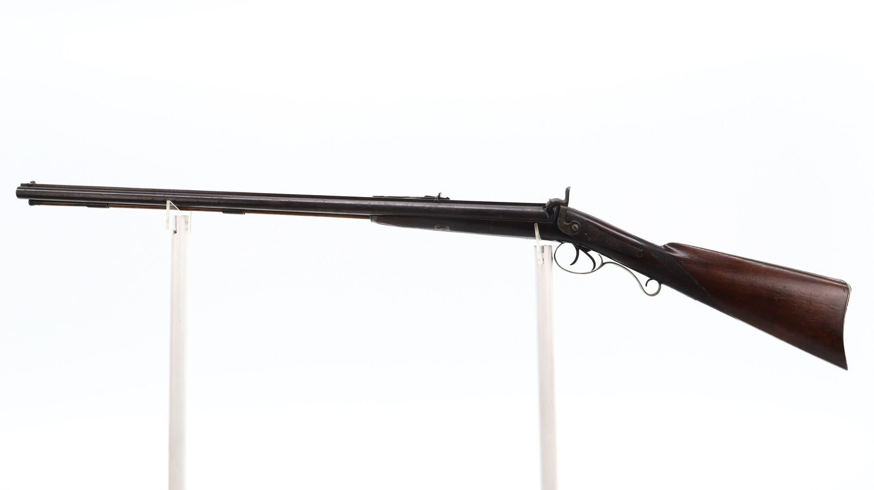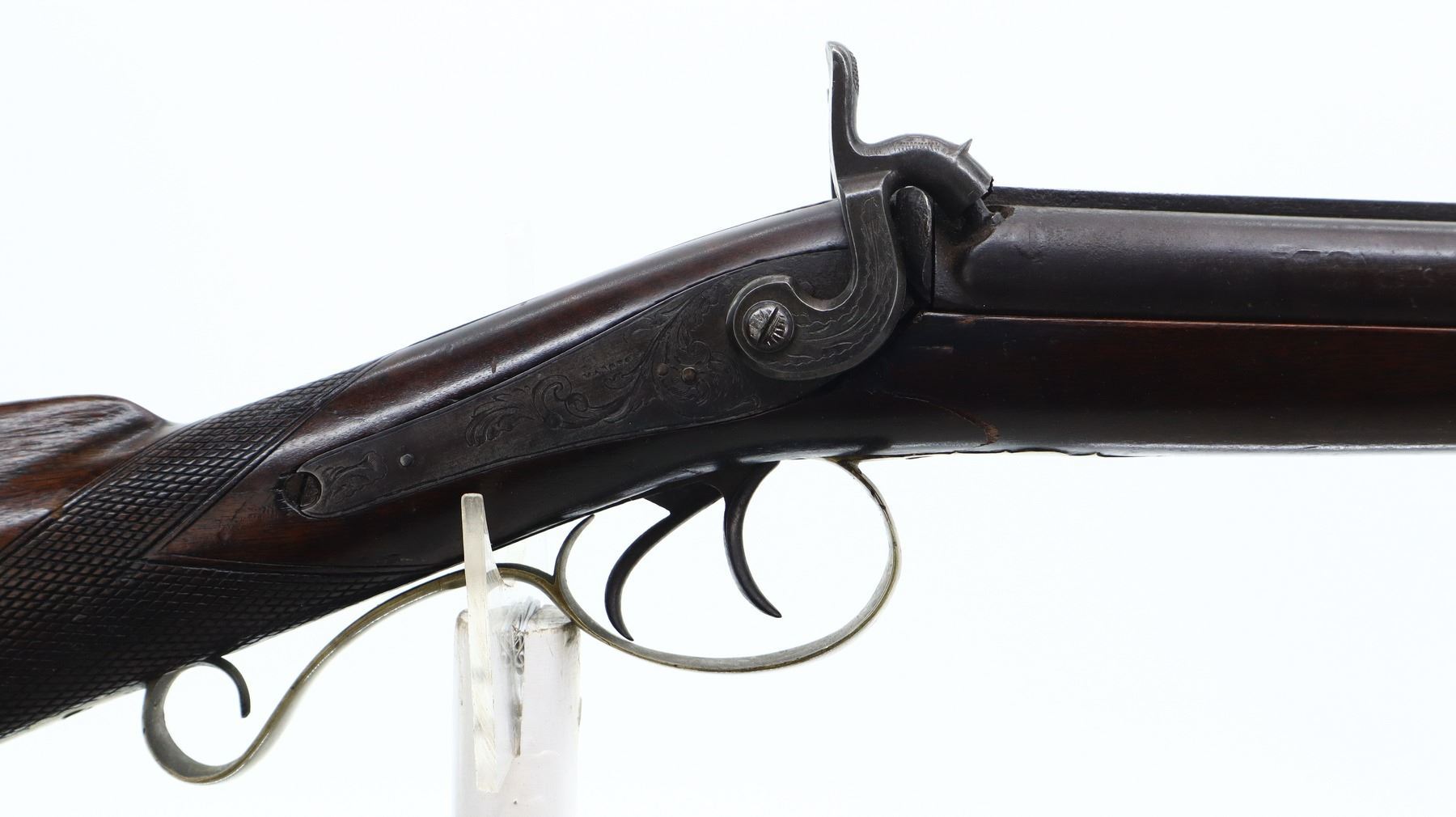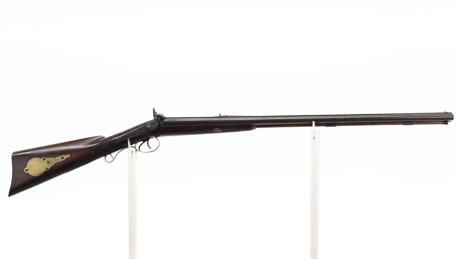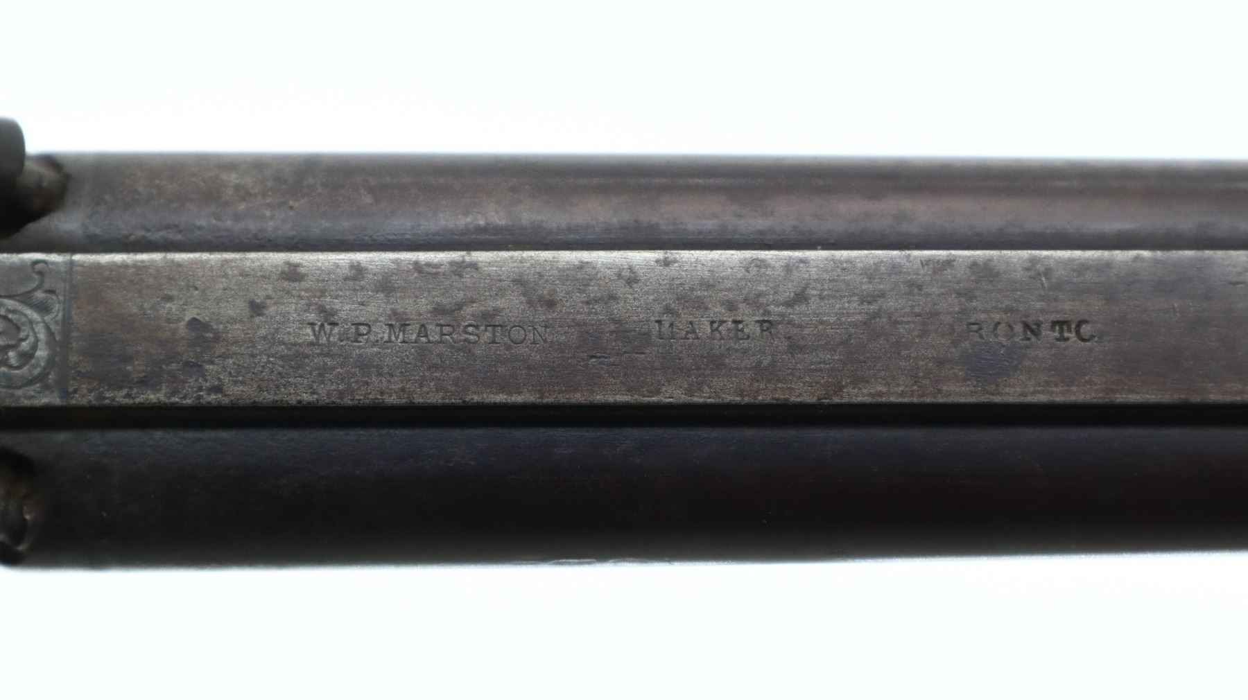 4+/10, WP MARSTON, MODEL: SIDE BY SIDE, CALIBER:16 G/ 40 CAL APPROX., BORES ARE POOR, PITTED. BLADE FRONT SIGHT, ADJUSTABLE U NOTCHED REAR SIGHT, ROUND BARRELS WITH RAISED SMOOTH RIB, ENGRAVED BREECH PLUG AND TANG, ENGRAVED BACK ACTION LOCKS AND HAMMERS THAT FUNCTION. ONE PIECE HALF WOOD STOCK, CHECKERED STRAIGHT GRIP, SMOOTH BRASS BUTT PLATE, FINGER REST TRIGGER GUARD, DOUBLE TRIGGERS, STOCK IS CRACKED AND BROKEN IN FRONT OF LOCKS, SINGLE FOREARM WEDGE, WOOD RAMROD WITH BRASS TIP, PATCH BOX. METAL FINISH TURNING BROWN WITH LIGHT RUST SPECKLES, SCRATCHES, HANDLING MARKS AND WEAR. STOCK SHOWS SOME MARKS, SCRATCHES AND WEAR. , ACTION: PERCUSSION COMBINATION, BARREL LENGTH: 30", SERIAL # NA, CONDITION: 4+/10, CLASS: CANADIAN ANTIQUE CLASS, NO LICENSE REQUIRED