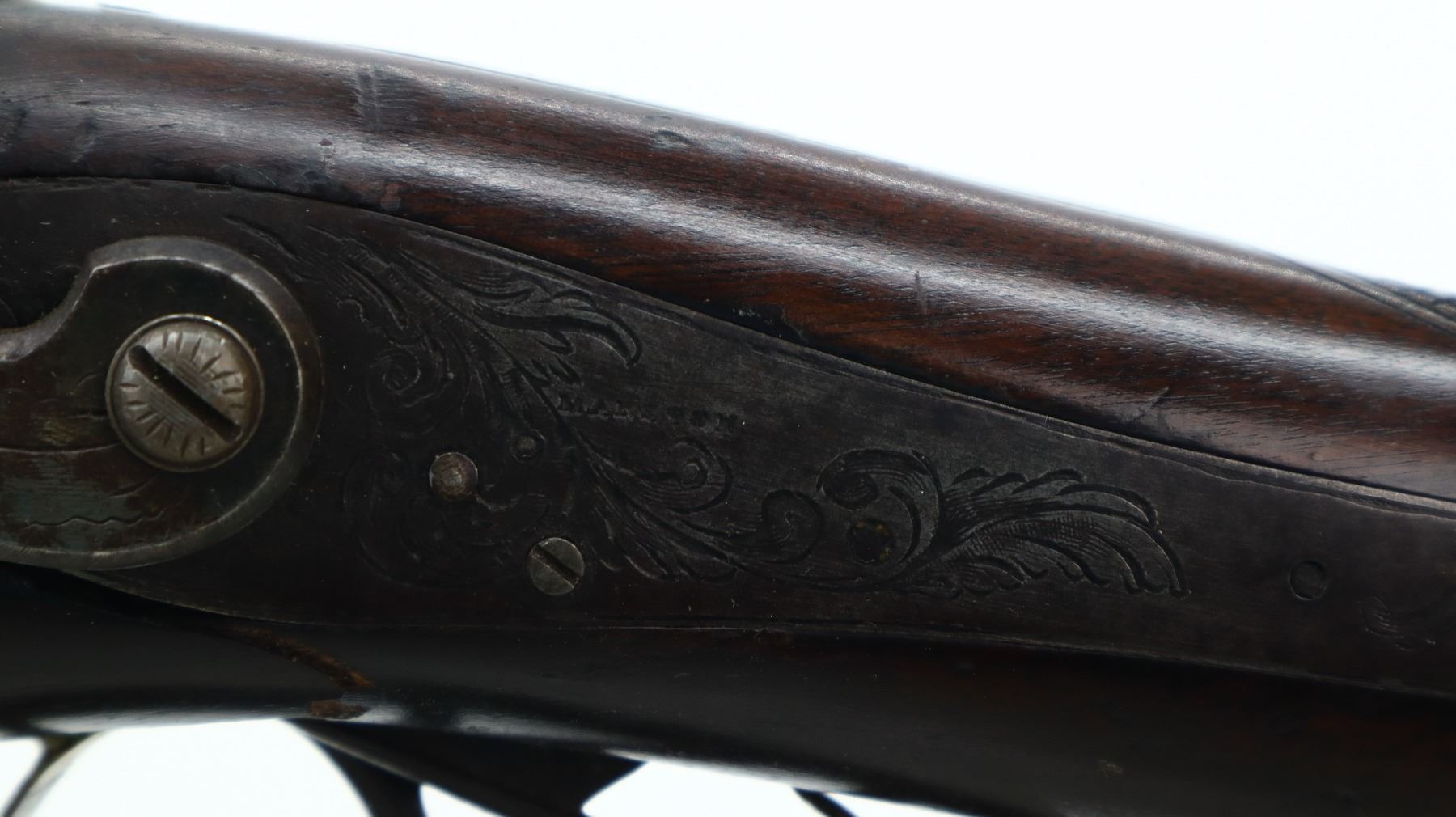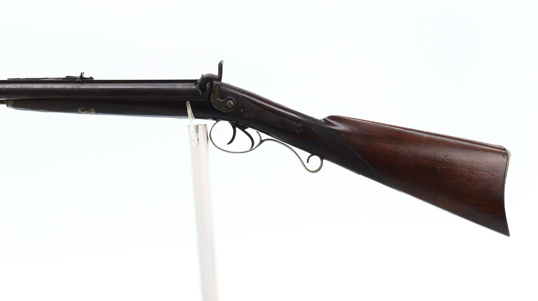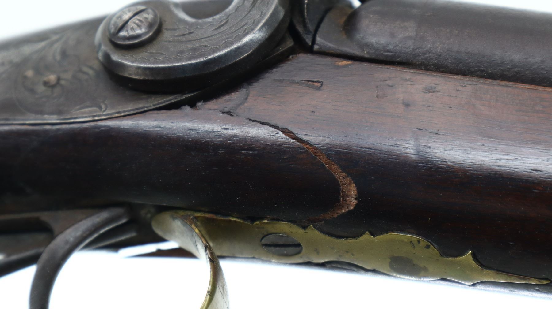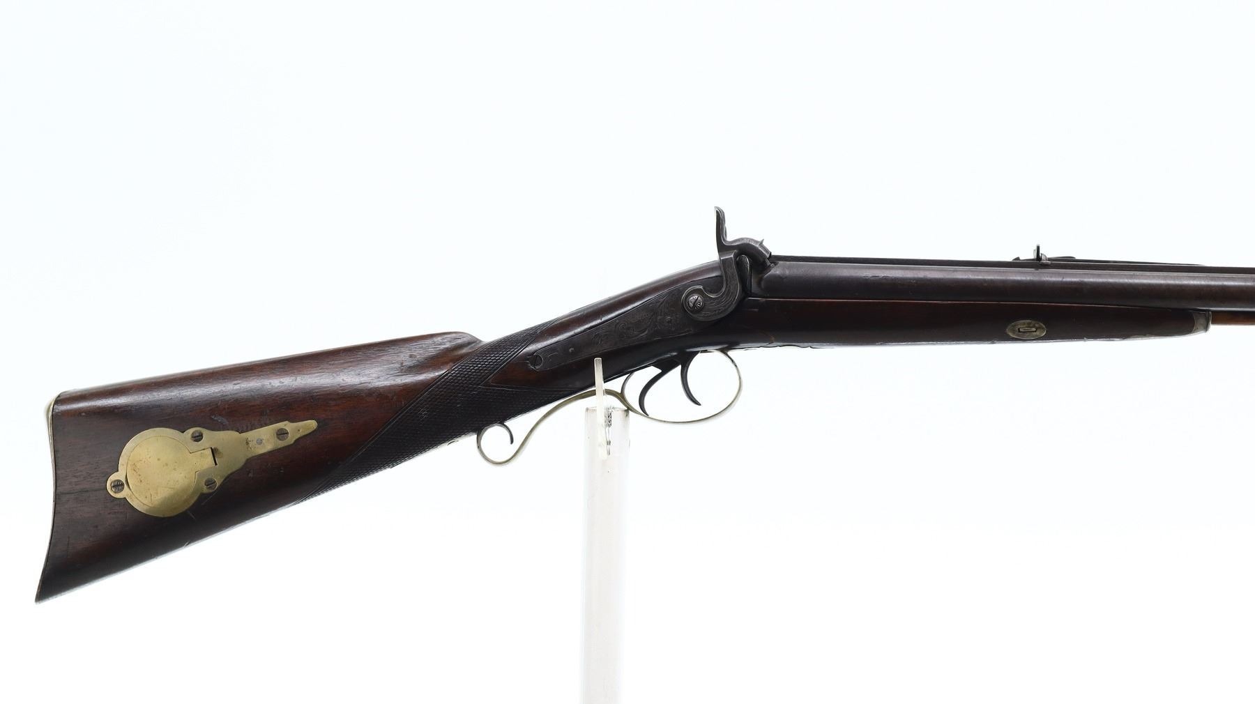 4+/10, WP MARSTON, MODEL: SIDE BY SIDE, CALIBER:16 G/ 40 CAL APPROX., BORES ARE POOR, PITTED. BLADE FRONT SIGHT, ADJUSTABLE U NOTCHED REAR SIGHT, ROUND BARRELS WITH RAISED SMOOTH RIB, ENGRAVED BREECH PLUG AND TANG, ENGRAVED BACK ACTION LOCKS AND HAMMERS THAT FUNCTION. ONE PIECE HALF WOOD STOCK, CHECKERED STRAIGHT GRIP, SMOOTH BRASS BUTT PLATE, FINGER REST TRIGGER GUARD, DOUBLE TRIGGERS, STOCK IS CRACKED AND BROKEN IN FRONT OF LOCKS, SINGLE FOREARM WEDGE, WOOD RAMROD WITH BRASS TIP, PATCH BOX. METAL FINISH TURNING BROWN WITH LIGHT RUST SPECKLES, SCRATCHES, HANDLING MARKS AND WEAR. STOCK SHOWS SOME MARKS, SCRATCHES AND WEAR. , ACTION: PERCUSSION COMBINATION, BARREL LENGTH: 30", SERIAL # NA, CONDITION: 4+/10, CLASS: CANADIAN ANTIQUE CLASS, NO LICENSE REQUIRED