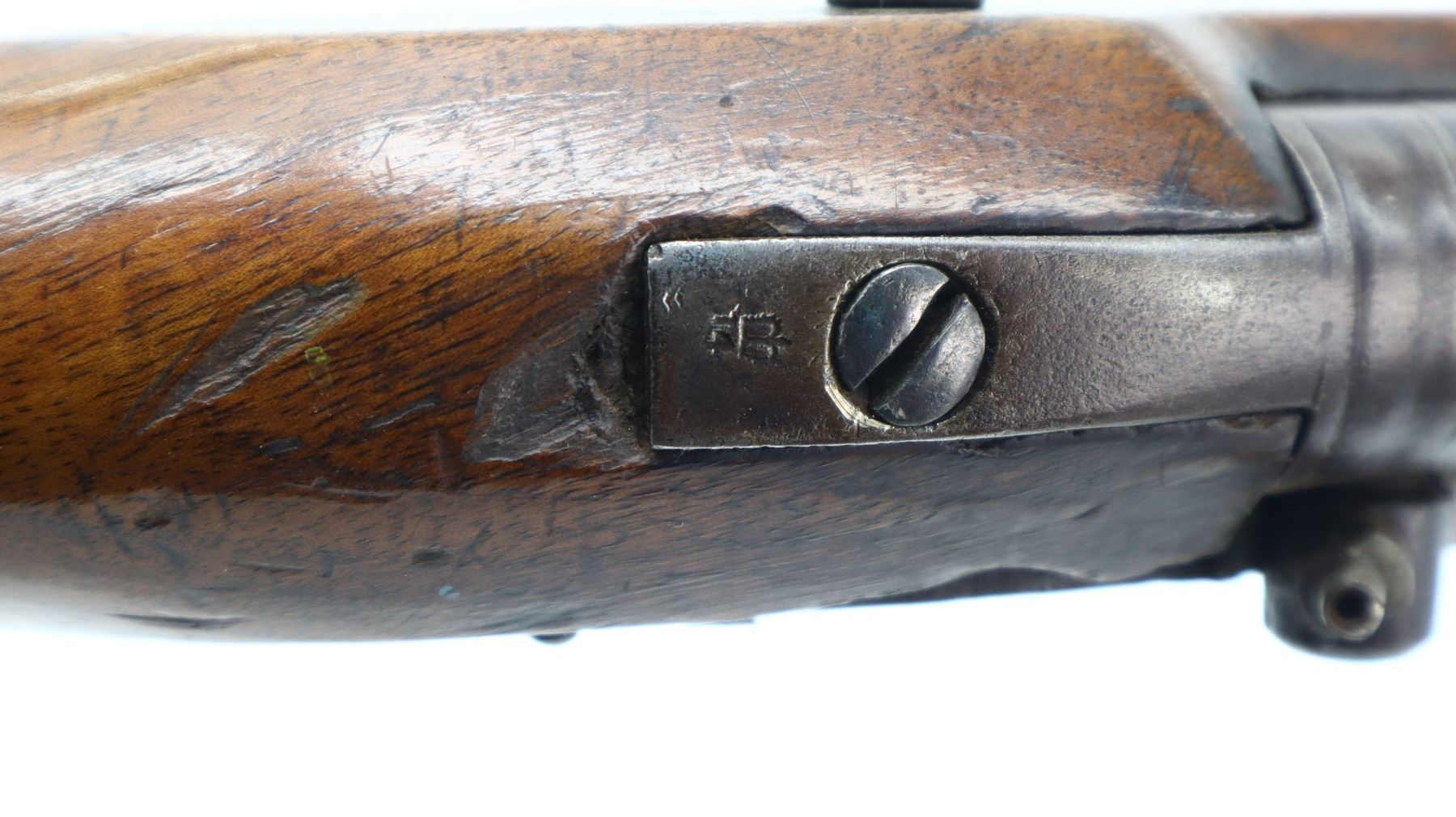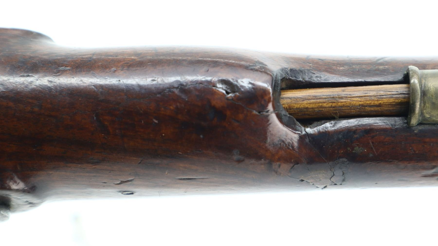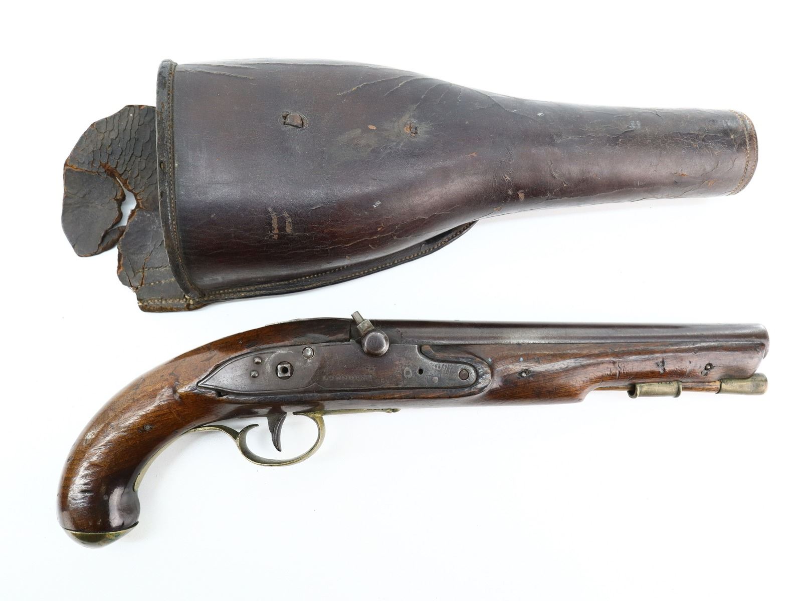 5/10, LOWNDES BRITISH, MODEL: PERCUSSION PISTOL, CALIBER:67 CAL, COMES WITH LEATHER HOLSTER, BORE IS FAIR, PITTED. ROUND BARREL NO SIGHTS, BRITISH PROOF MARKS, LOCK NOT FUNCTIONING, HAMMER AND SCREW NOT INSTALLED, APPEARS TO BE A CONVERSION FROM FLINTLOCK. ONE PIECE WOOD STOCK, PISTOL GRIP WITH BRASS CAP, BRASS TRIGGER GUARD, WOOD RAMROD WITH BRASS TIP. BROWN LEATHER HOLSTER IS UNMARKED, DAMAGED, BUT APPEARS TO BE VINTAGE. METAL FINISH TURNING BROWN WITH SCRATCHES, HANDLING MARKS AND WEAR. STOCK SHOWS SOME MARKS, SCRATCHES AND WEAR. , ACTION: PERCUSSION PISTOL, BARREL LENGTH: 215MM, SERIAL # NA, CONDITION: 5/10, CLASS: CANADIAN ANTIQUE CLASS, NO LICENSE REQUIRED