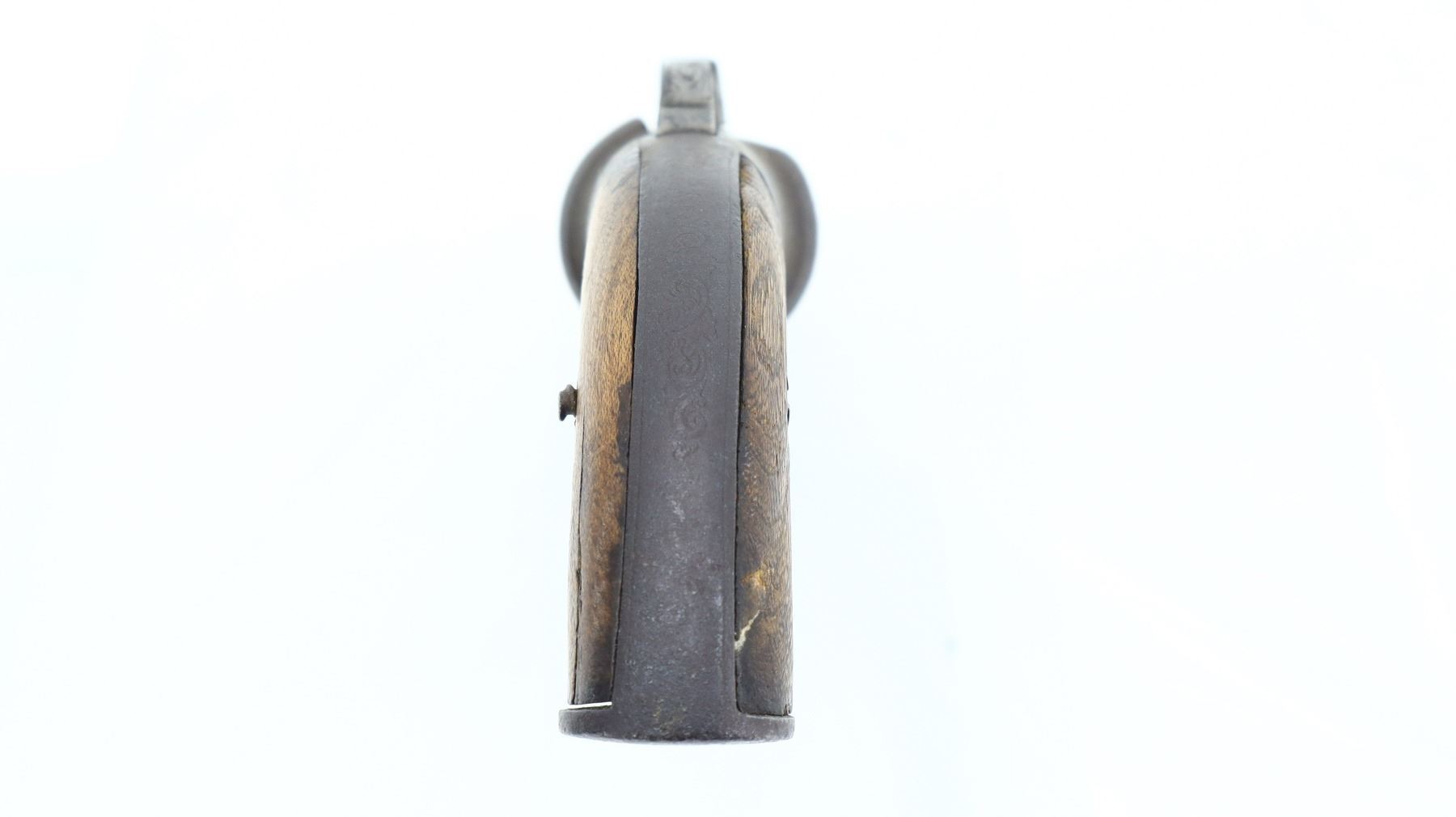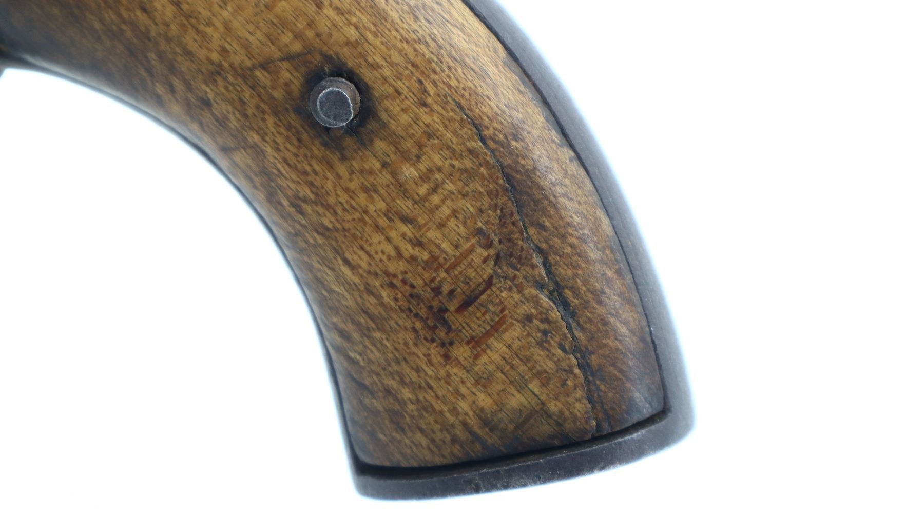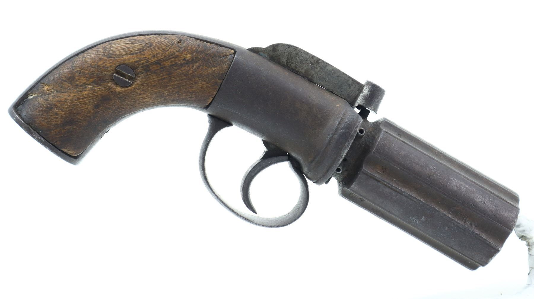 3+/10, UNKNOWN BRITISH, MODEL: PEPPER BOX, CALIBER:36 CAL, BORES ARE POOR, PITTED. DOES NOT FUNCTION AS MECHANICALLY DESIGNED. NO SIGHTS, FLUTED BARRELS, ENGRAVED TOP HAMMER, SMOOTH TRIGGER, ENGRAVED FRAME. SMOOTH TWO PIECE WOOD GRIPS WITH REPLACED SCREW, MISSING SCREW BEHIND TRIGGER GUARD, POSSIBLY INTERNAL PARTS. METAL FINISH HAS PITTING, LIGHT RUST, HANDLING MARKS AND WEAR. GRIPS ARE CRACKED WITH HANDLING MARKS AND WEAR. , ACTION: PERCUSSION REVOLVER, BARREL LENGTH: 72MM, SERIAL # NA, CONDITION: 3+/10, CLASS: CANADIAN ANTIQUE CLASS, NO LICENSE REQUIRED