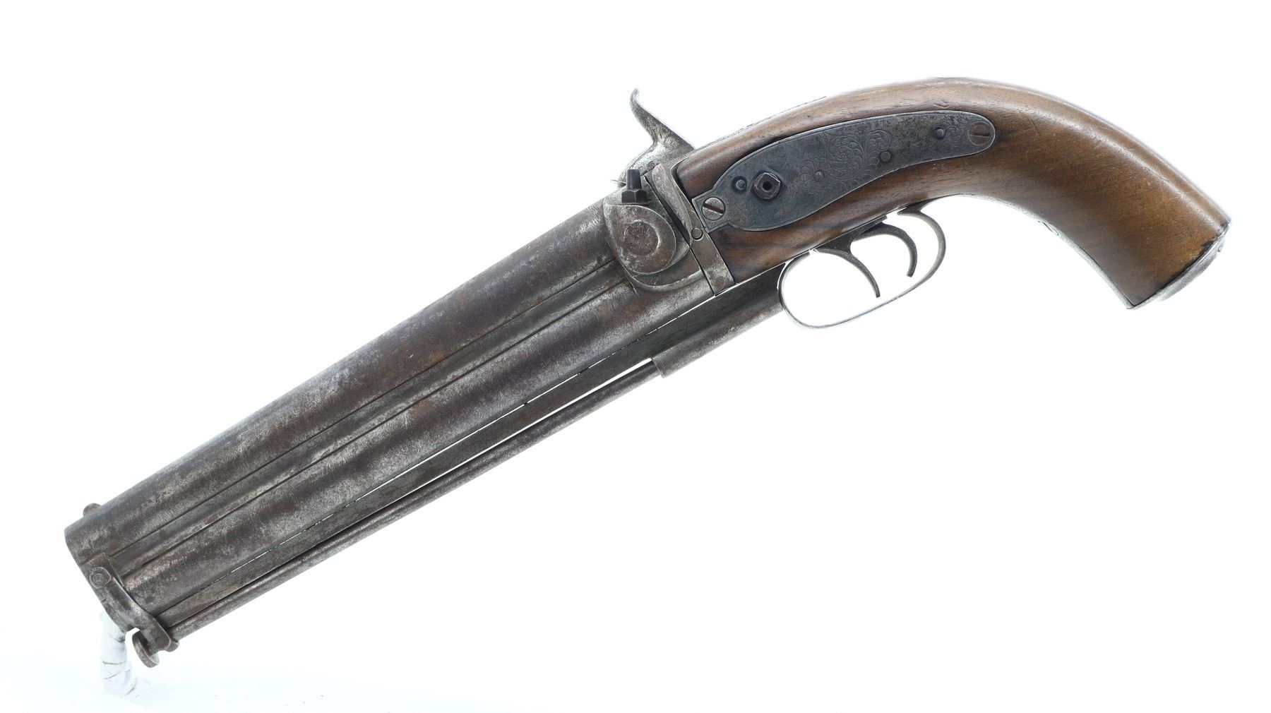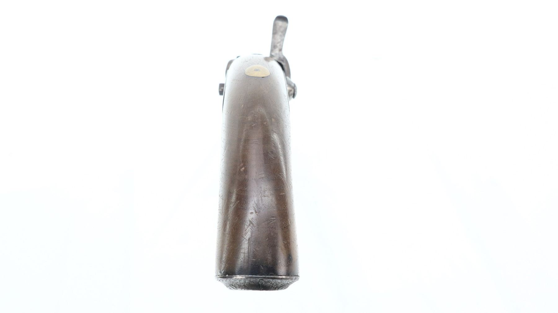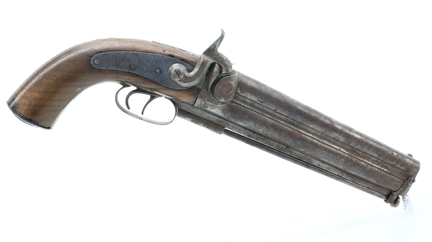4/10, UNKNOWN , MODEL: OVER UNDER, CALIBER:58 CAL, BORES ARE FAIR, PITTED. BLADE FRONT SIGHT, FIXED U NOTCHED REAR SIGHT, DAMASCUS BARRELS, MISSING RIGHT NIPPLE, HAS ENGRAVED BACK ACTION LOCKS AND HAMMER, MISSING LEFT HAMMER AND SCREW, HAS DOUBLE TRIGGERS. ONE PIECE WOOD STOCK, ENGRAVED GRIP CAP WITH HINGED PERCUSSION CAP STORAGE. ONE PIECE STEEL CAPTIVE RAMROD. METAL FINISH SILVER GREY WITH LIGHT RUST, PITTING, HANDLING MARKS AND WEAR. GRIPS SHOW MARKS, SCRATCHES AND WEAR. , ACTION: OVER UNDER PERCUSSION PISTOL, BARREL LENGTH: 200MM, SERIAL # NA, CONDITION: 4/10, CLASS: CANADIAN ANTIQUE CLASS, NO LICENSE REQUIRED