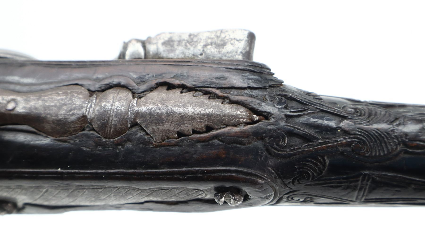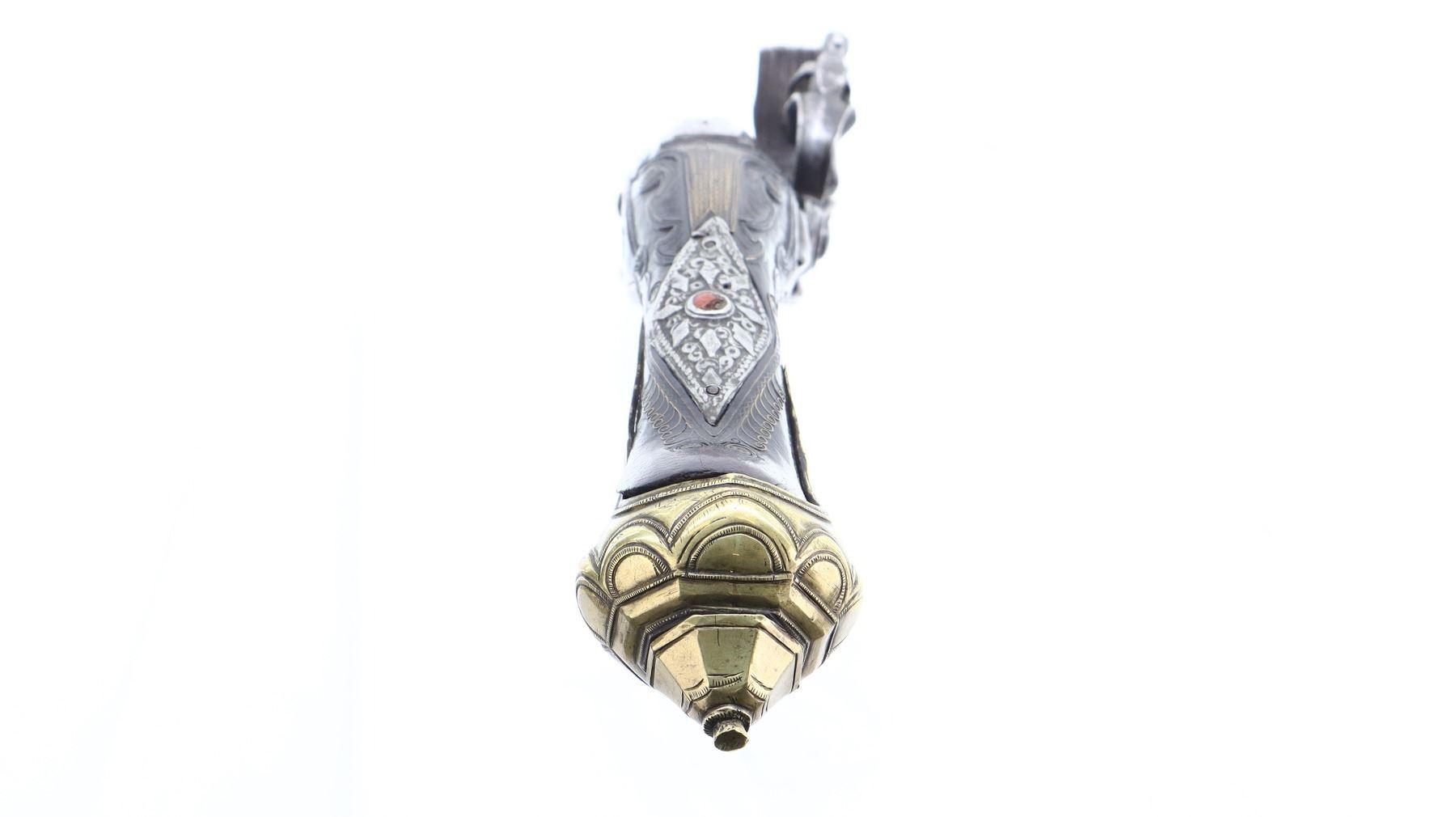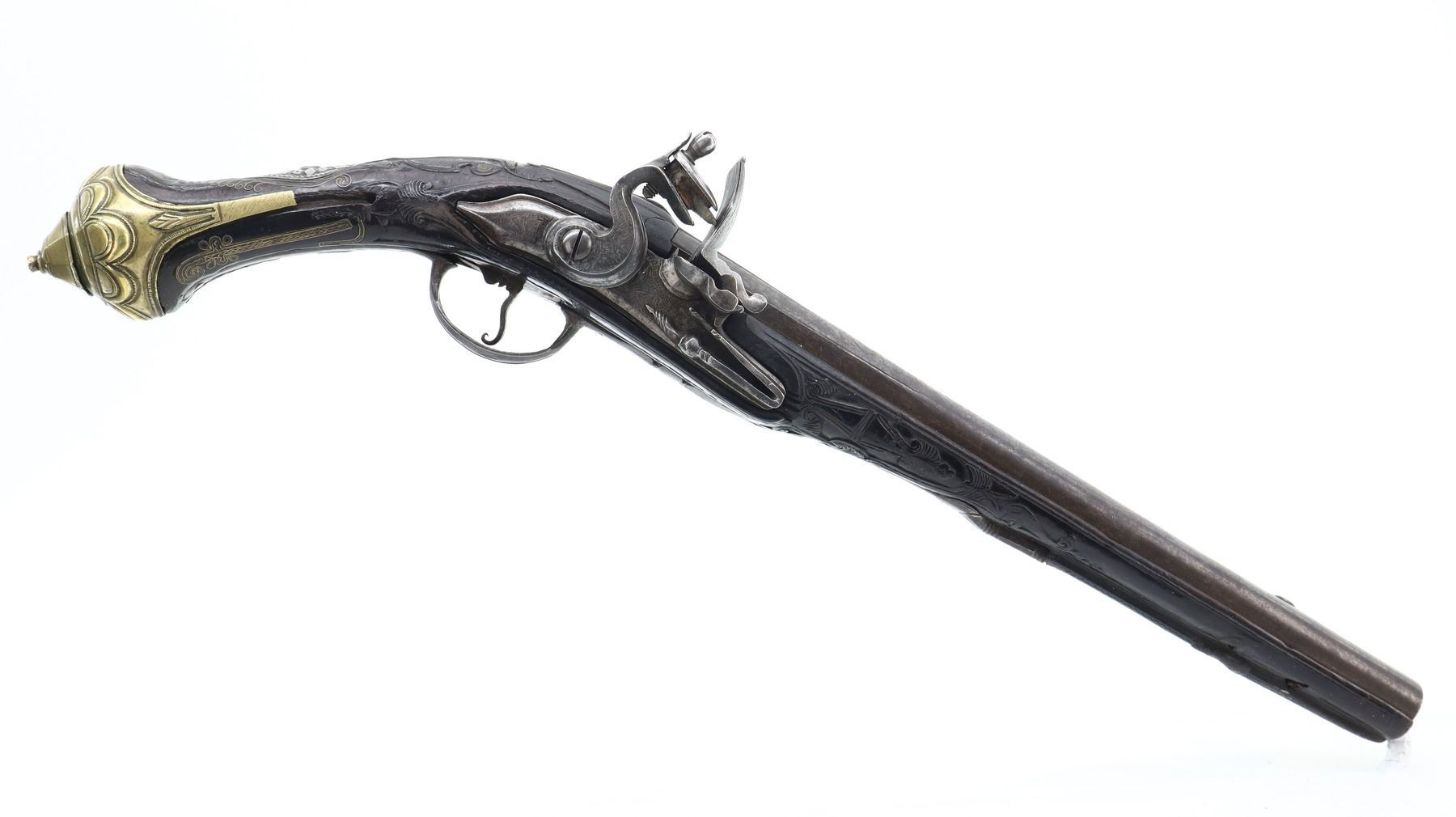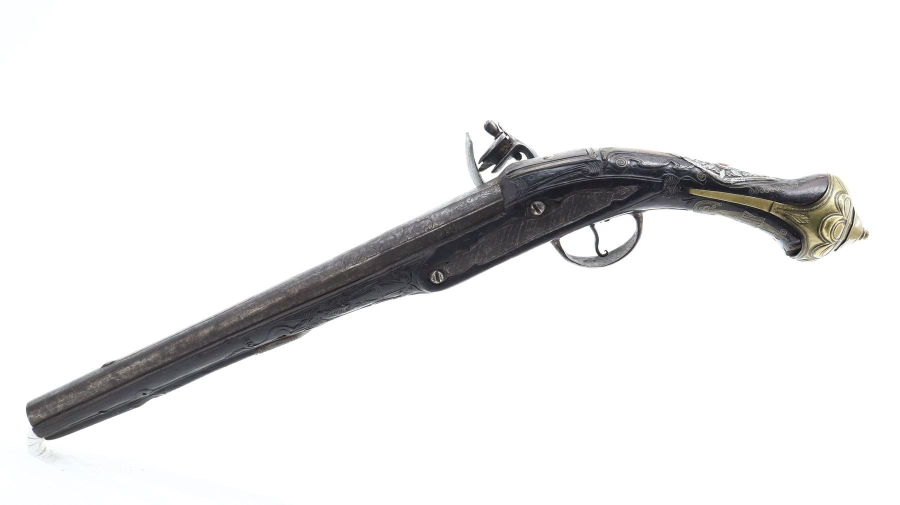 6/10, UNKNOWN, MODEL: FLINTLOCK PISTOL, CALIBER:65 CAL, BORE IS POOR, PITTED. BLADE FRONT SIGHT, PART OCTAGON PART ROUND BARREL WITH ENGRAVING, UNKNOWN PROOF MARKS ON RIGHT SIDE, ENGRAVED LOCK AND HAMMER, HAMMER AND FRIZZEN FUNCTION. ONE PIECE FULL LENGTH WOOD GRIP WITH ENGRAVING, GRIP HAS BRASS INLETS WITH SILVER PLATE PINNED ON THE REAR, ENGRAVED BRASS PISTOL GRIP CAP, STEEL TRIGGER GUARD, INLAYED FAUX RAMROD. METAL FINISH TURNING BROWN WITH HANDLING MARKS AND WEAR. GRIP CHIPPED AT THE BASE WITH HANDLING MARKS AND WEAR. , ACTION: FLINT LOCK PISTOL, BARREL LENGTH: 310MM, SERIAL # NA, CONDITION: 6/10, CLASS: CANADIAN ANTIQUE CLASS, NO LICENSE REQUIRED