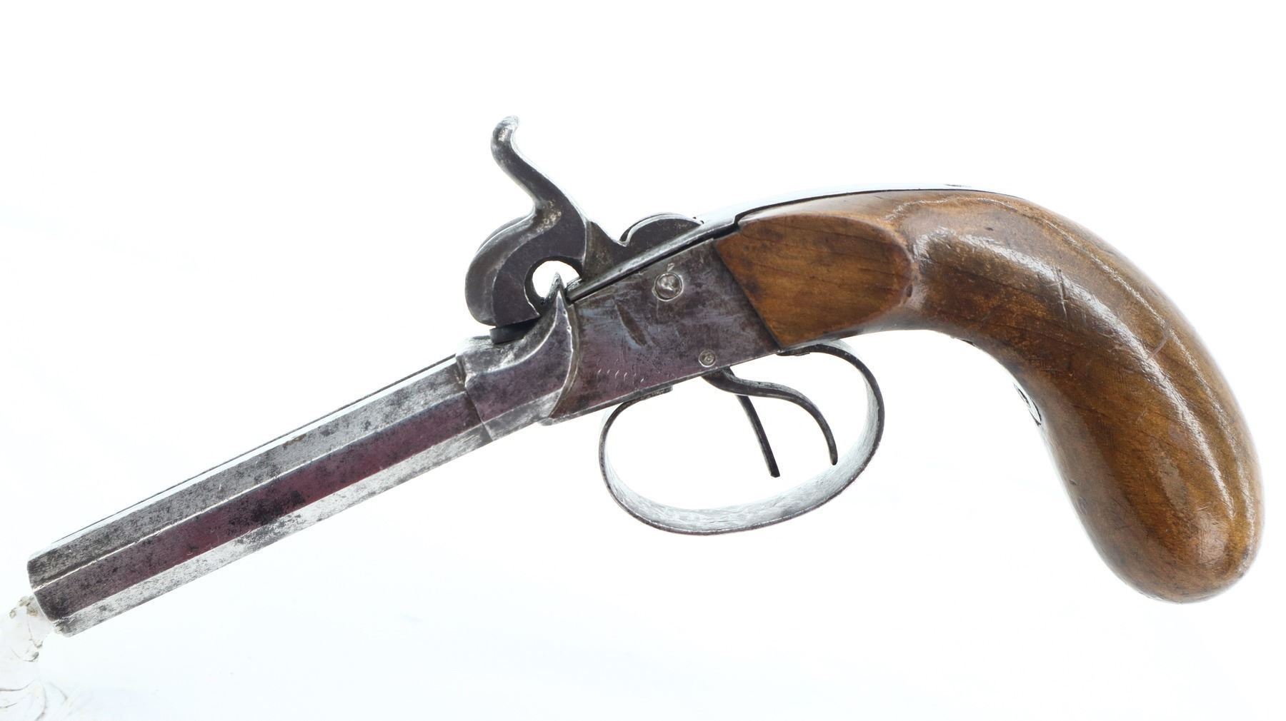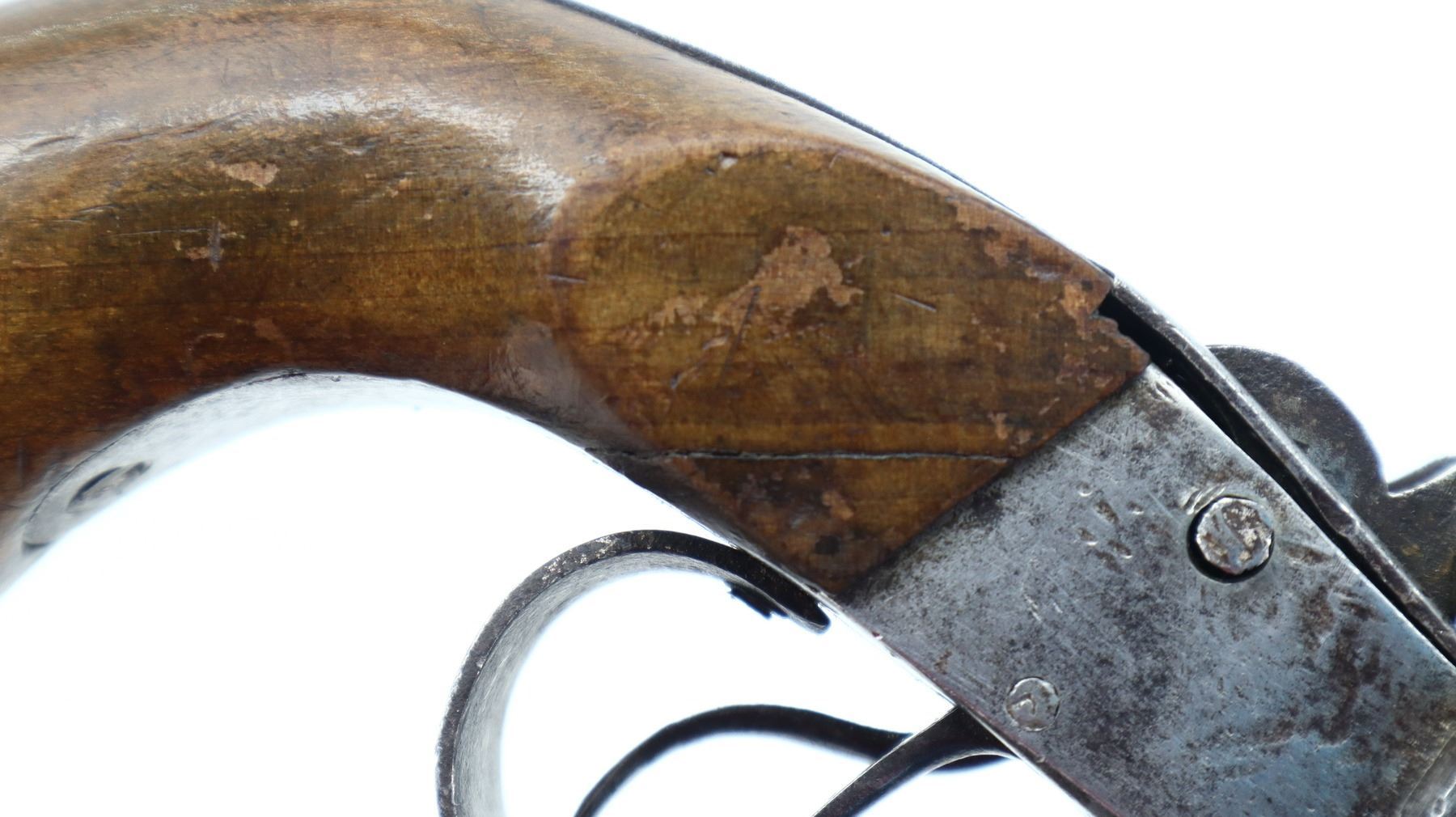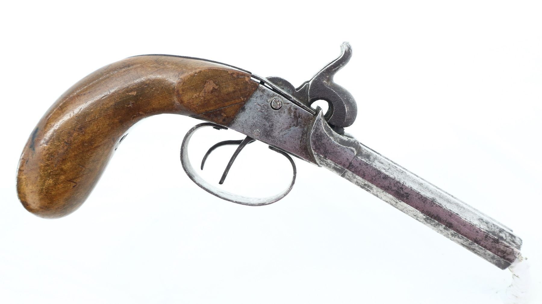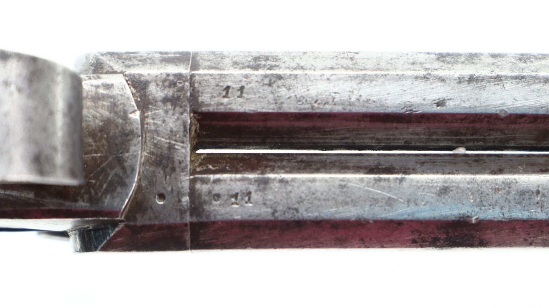 4/10, UNKNOWN , MODEL: SIDE BY SIDE, CALIBER:40 CAL, BORES ARE POOR, PITTED. NO SIGHTS, SIDE BY SIDE OCTAGON BARRELS, SMOOTH SPUR HAMMERS AND TRIGGERS THAT FUNCTION. ONE PIECE SMOOTH WOOD GRIP, STEEL TRIGGER GUARD. METAL FINISH SILVER GREY WITH PITTING, LIGHT RUST SPECKLES, HANDLING MARKS AND WEAR. GRIP SHOWS MARKS, SCRATCHES AND WEAR. , ACTION: SIDE BY SIDE PERCUSSION PISTOL, BARREL LENGTH: 90MM, SERIAL # 11, CONDITION: 4/10, CLASS: CANADIAN ANTIQUE, NO LICENSE REQUIRED