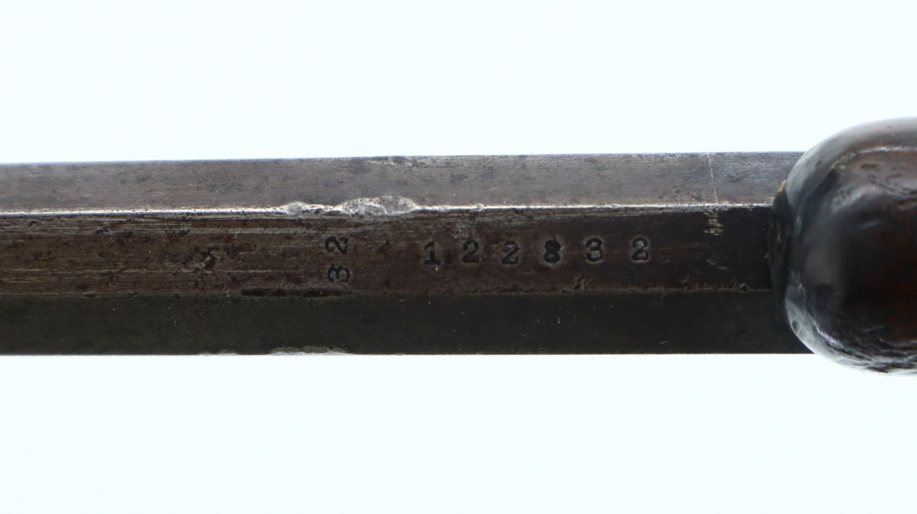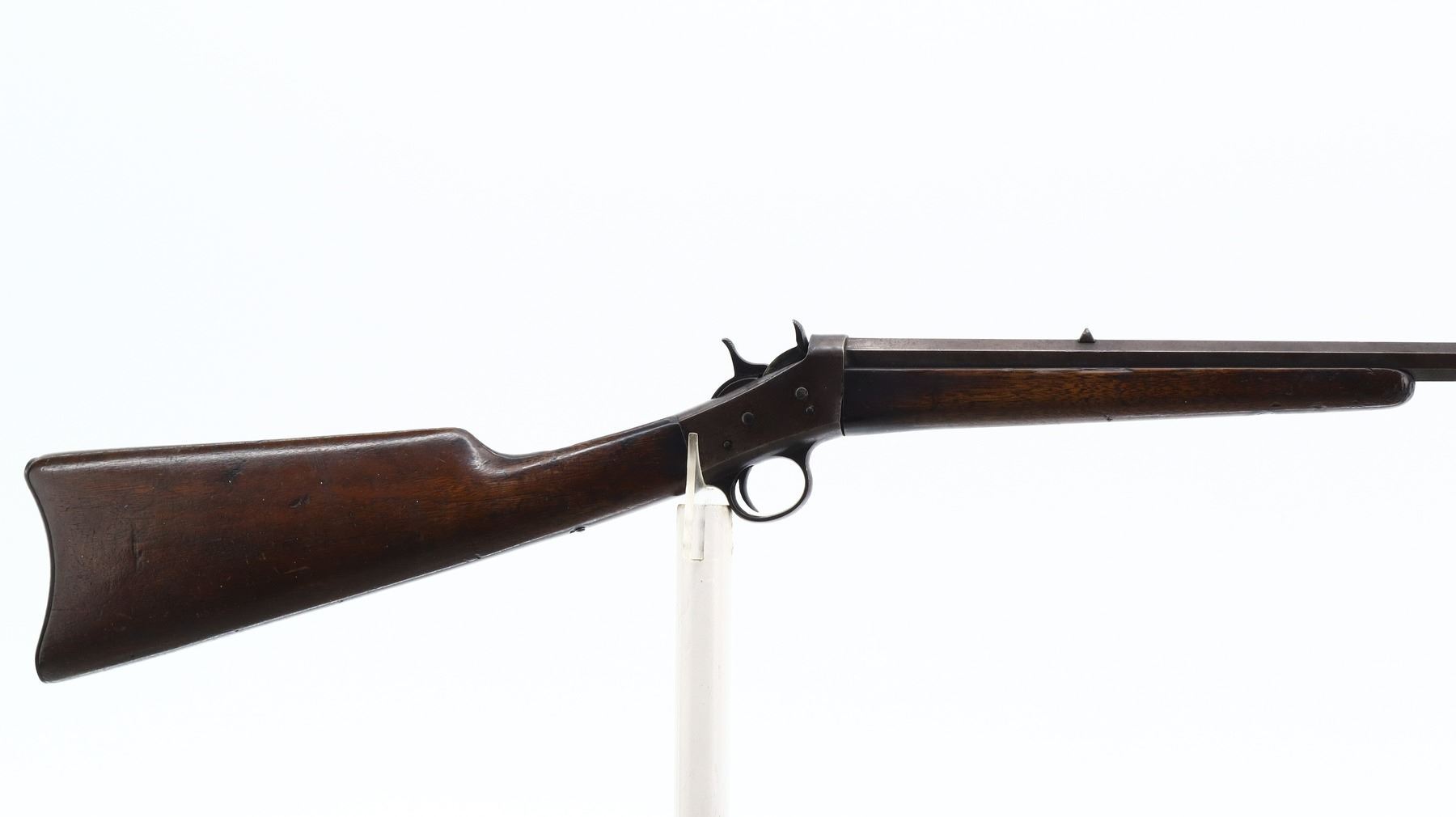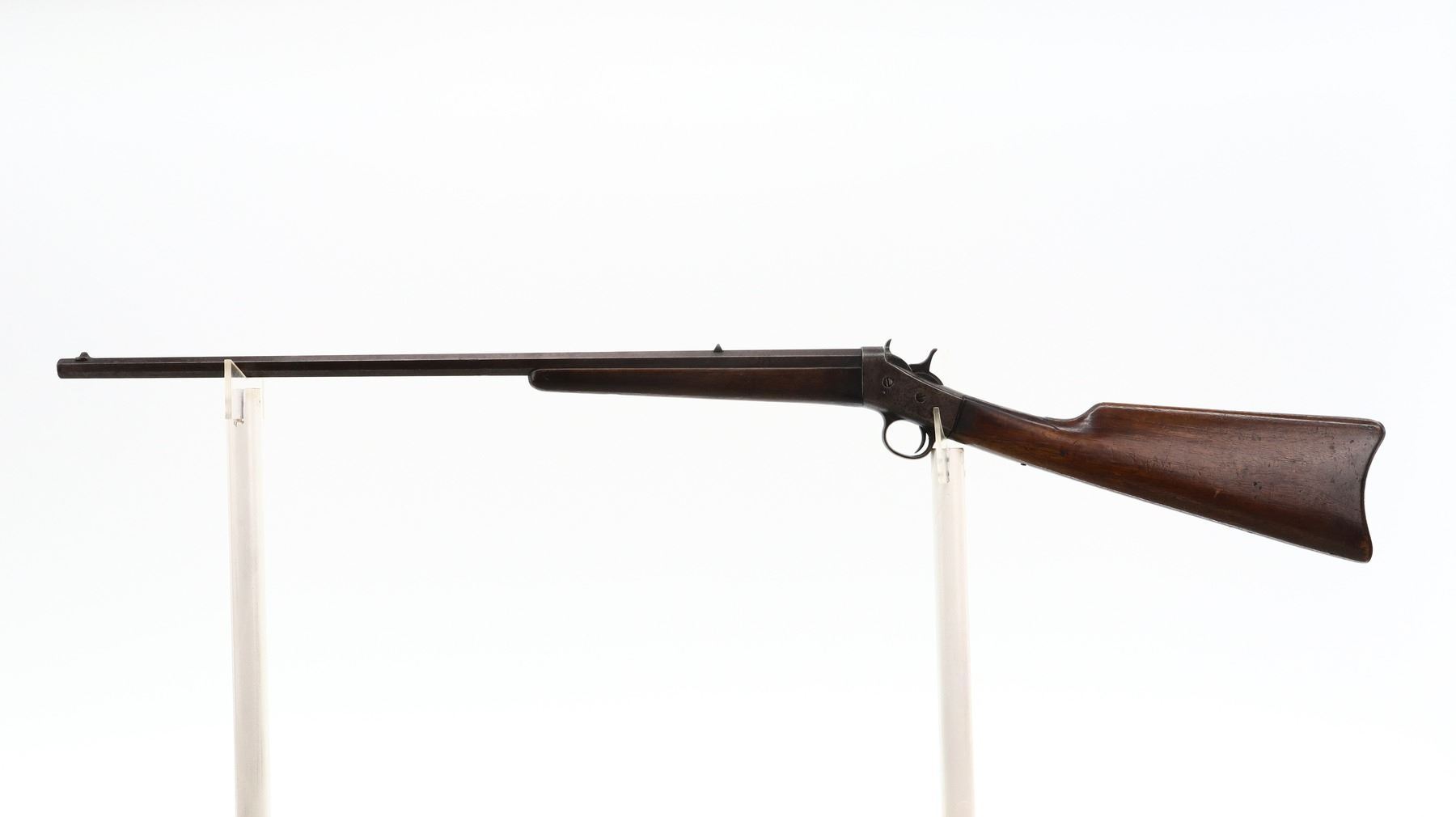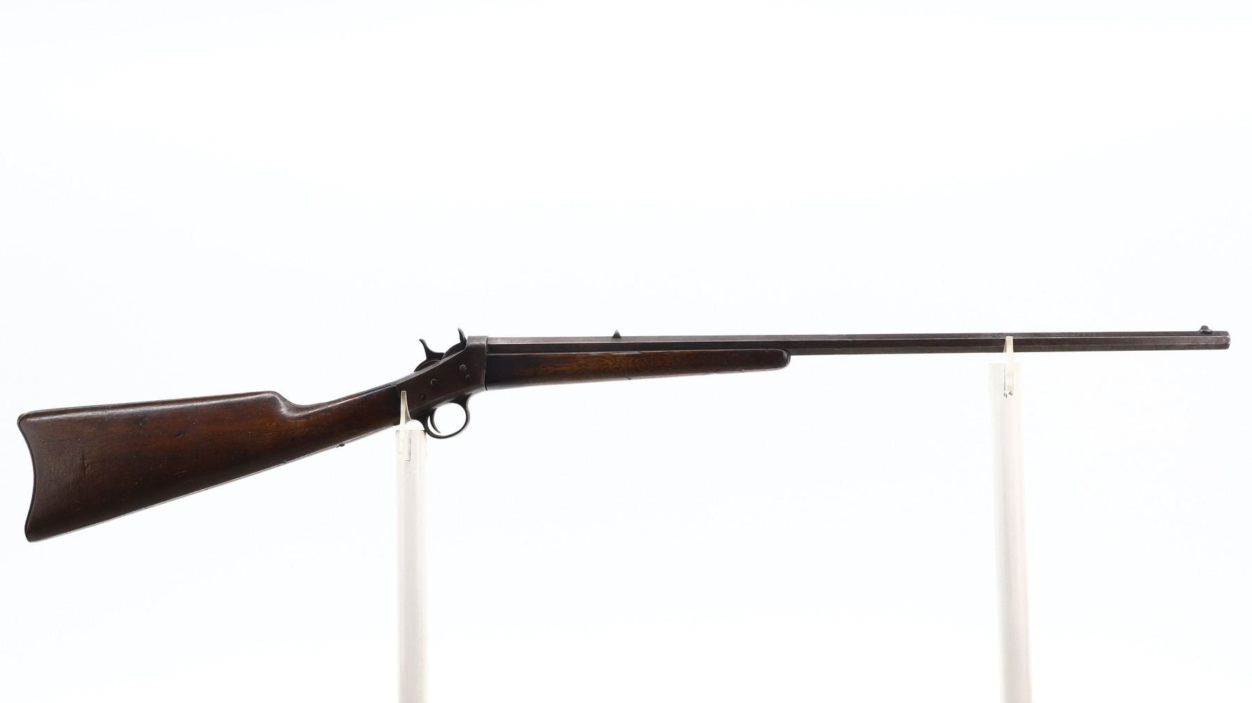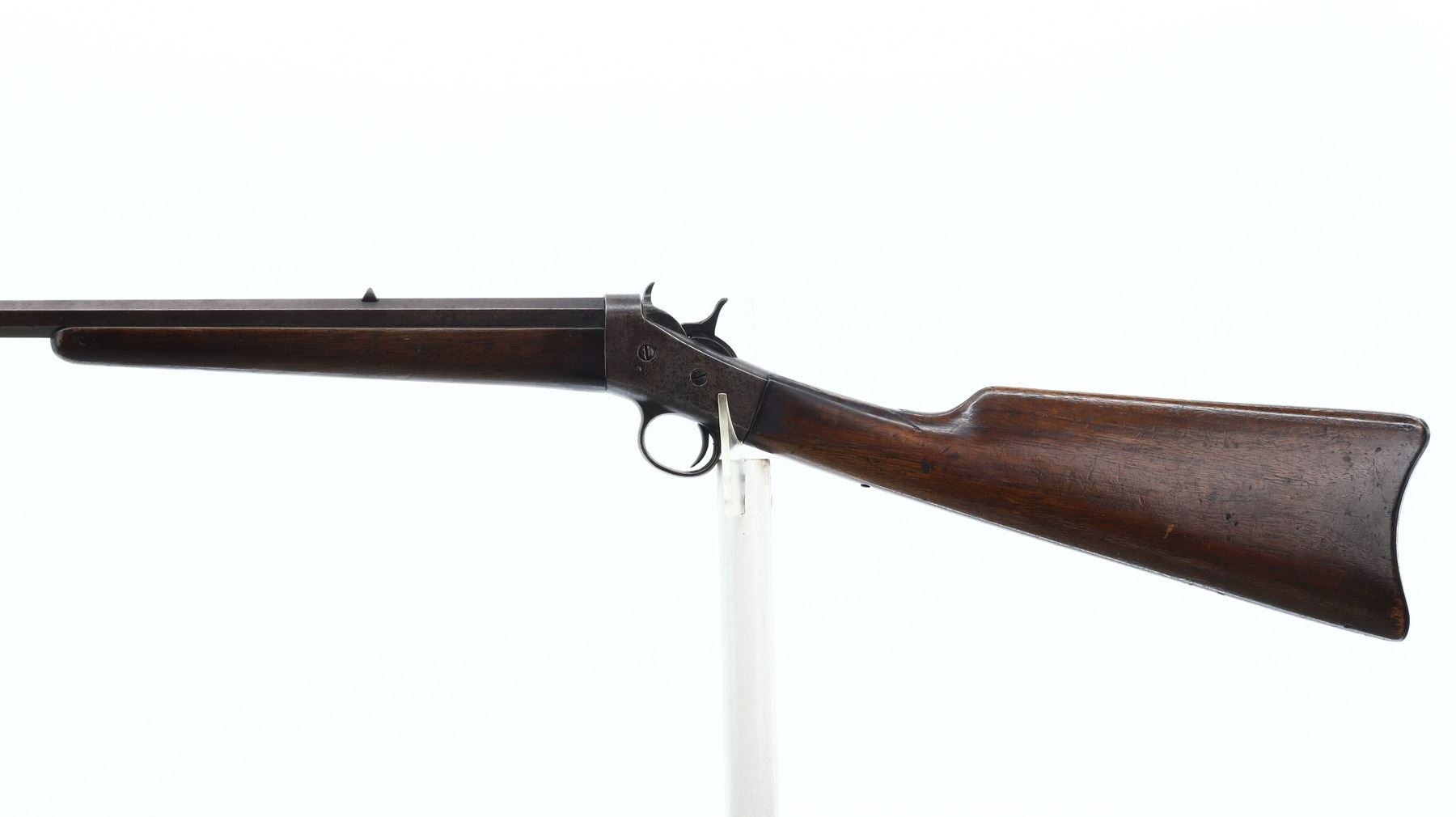 5+/10, REMINGTON, MODEL: ROLLING BLOCK, CALIBER:32 RF, BORE IS FAIR, WORN, PITTED. BLADE FRONT SIGHT, U NOTCHED REAR SIGHT, TAPERED OCTAGON BARREL. TWO PIECE SMOOTH WOOD STOCKS, STRAIGHT GRIP (CRACKED AND CHIPPED AT WRIST), SMOOTH CURVED STEEL BUTT PLATE. METAL FINISH TURNING BROWN WITH LIGHT RUST, PITTING, HANDLING MARKS AND WEAR. STOCKS SHOW MARKS, SCRATCHES AND WEAR. , ACTION: SINGLE SHOT RIFLE, BARREL LENGTH: 24", SERIAL # 122832, CONDITION: 5+/10, CLASS: CANADIAN NON RESTRICTED