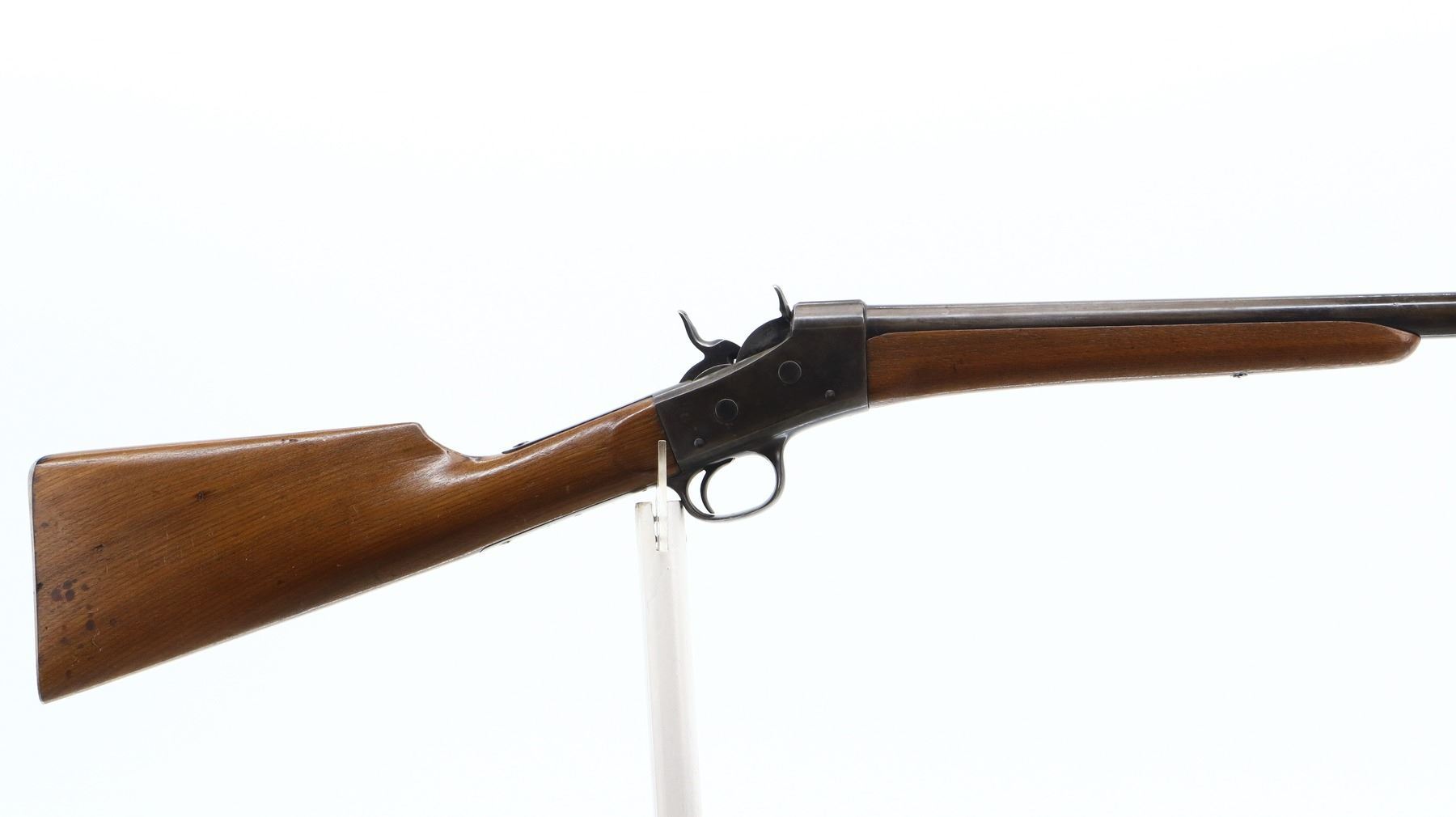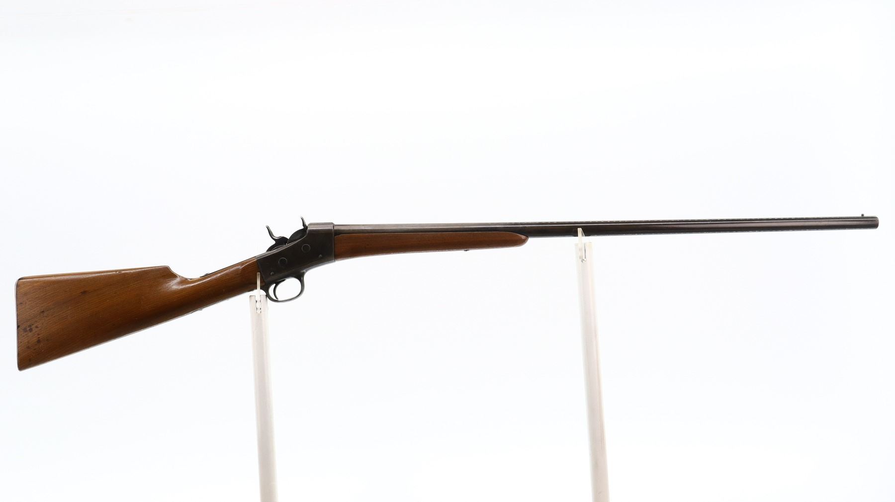 6/10, REMINGTON, MODEL: ROLLING BLOCK, CALIBER:20 G X 2 5/8", BORE IS FAIR, PITTED. FIXED CYLINDER CHOKE. BRASS BEAD, ROUND BARREL. TWO PIECE SMOOTH WOOD STOCKS, STRAIGHT GRIP, SMOOTH STEEL BUTT PLATE. METAL FINISH TURNING BROWN WITH SCRATCHES, HANDLING MARKS AND WEAR. STOCKS SHOW MARKS, SCRATCHES AND WEAR. , ACTION: SINGLE SHOT SHOTGUN, BARREL LENGTH: 32", SERIAL # NA, CONDITION: 6/10, CLASS: CANADIAN NON RESTRICTED