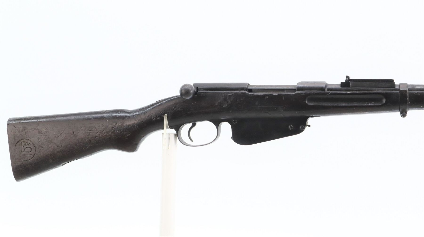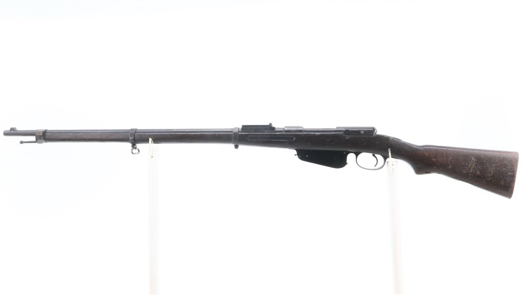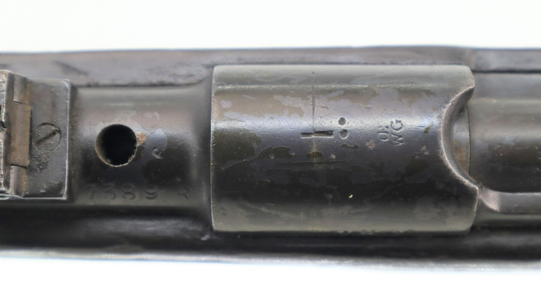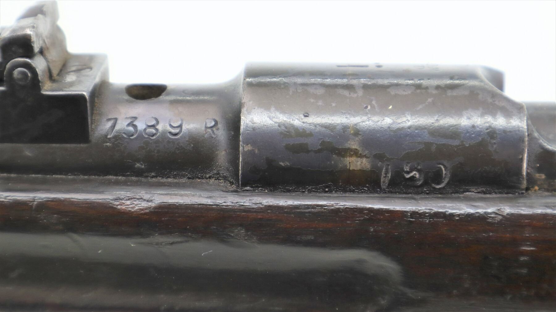 5/10, STEYR, MODEL: 1888, CALIBER:8 X 50R, BORE IS POOR, WORN, PITTED. BOLT MATCHES. MISSING FRONT SIGHT BLADE, RAMP PRESENT, U NOTCHED LADDER REAR SIGHT, MISSING SLIDE, SPRING BROKEN. CHAMBER HAS A HOLE DRILLED IN IT NOT FIREABLE. ONE PIECE FULL MILITARY WOOD STOCK, PISTOL GRIP, MISSING BUTT PLATE AND REAR SWIVEL, HAS FRONT SWIVEL, STACKING HOOK, BAYONET LUG. METAL FINISH SHOWS SOME LIGHT RUST, SCRATCHES, HANDLING MARKS AND WEAR. STOCK SHOW CRACKED BEHIND RECEIVER WITH DINGS, SCRATCHES AND WEAR. , ACTION: STRAIGHT PULL RIFLE, BARREL LENGTH: 30.25", SERIAL # 7389R, CONDITION: 5/10, CLASS: CANADIAN NON RESTRICTED