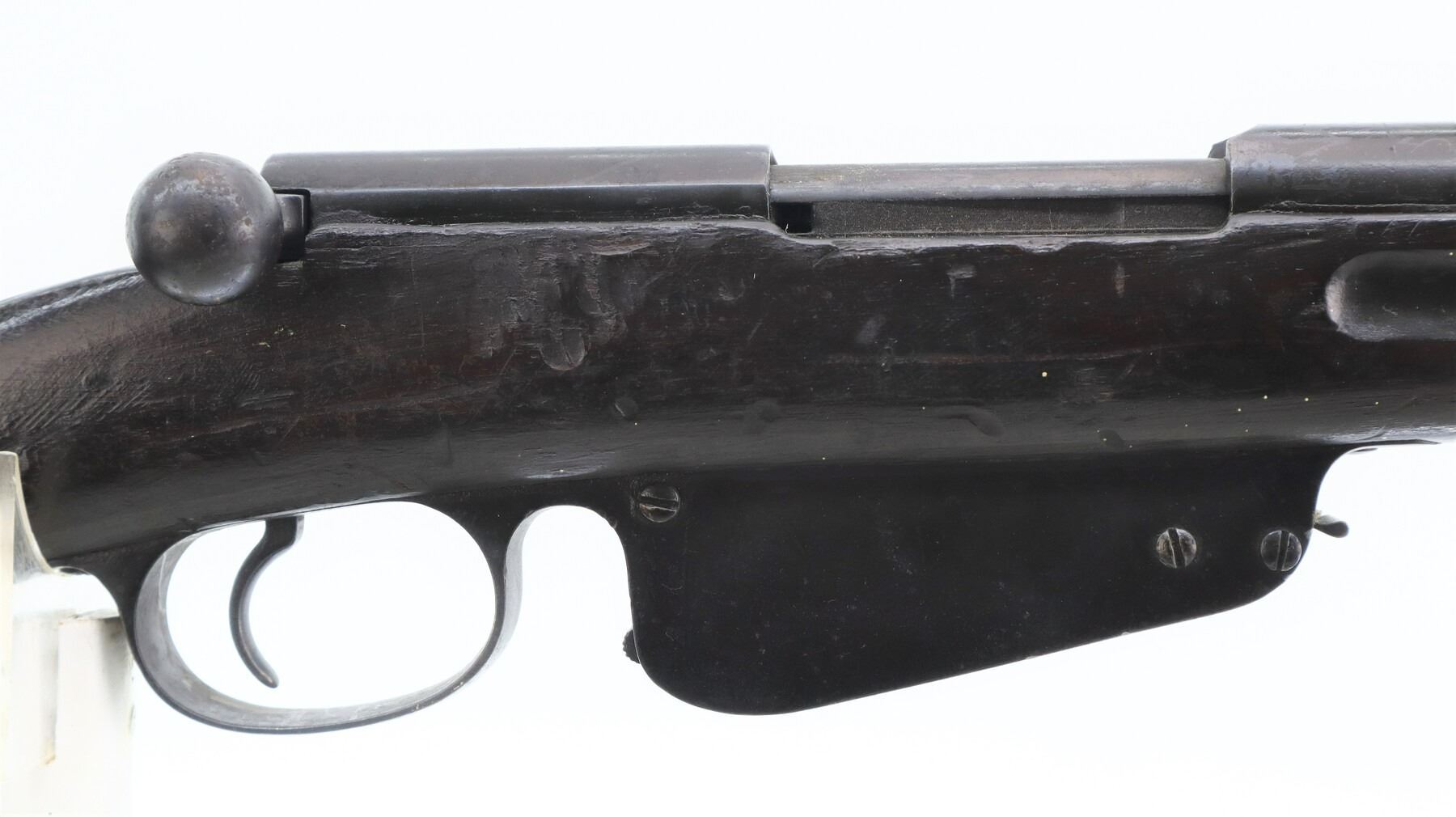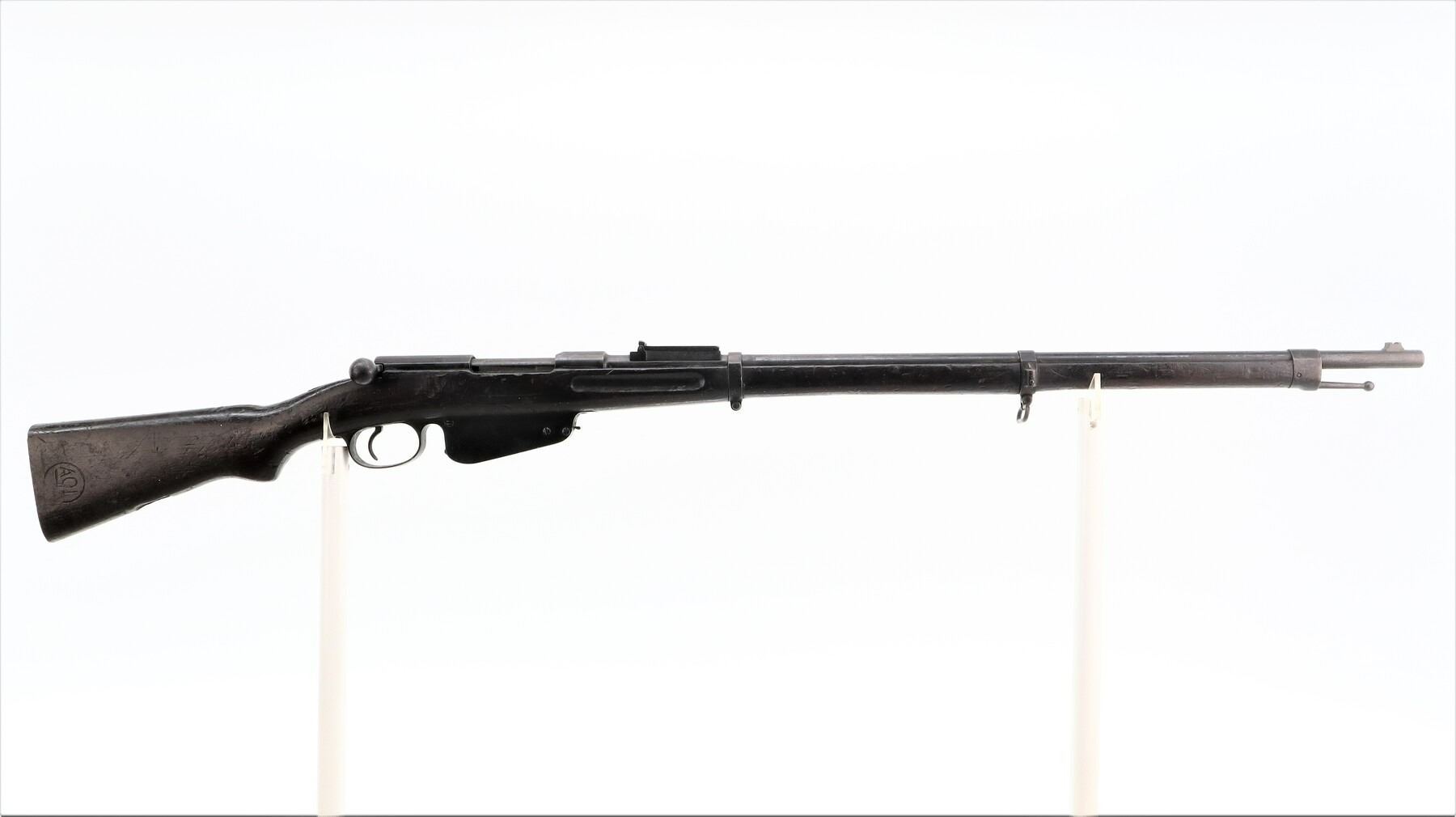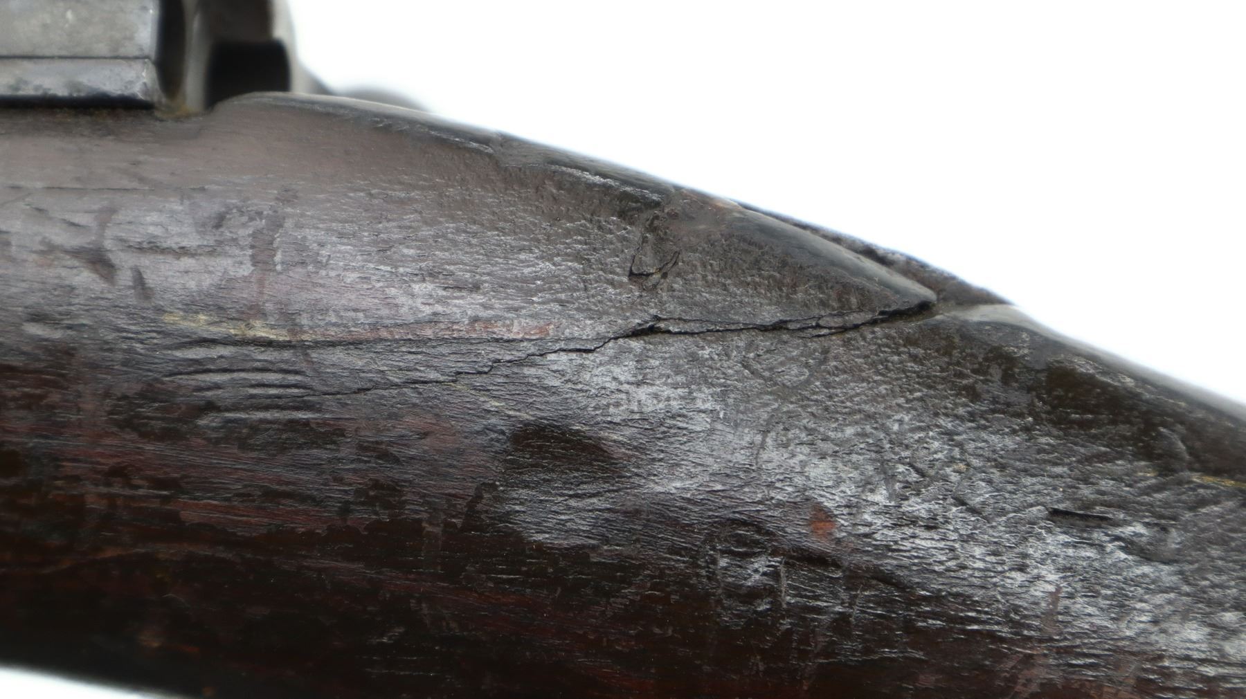 5/10, STEYR, MODEL: 1888, CALIBER:8 X 50R, BORE IS POOR, WORN, PITTED. BOLT MATCHES. MISSING FRONT SIGHT BLADE, RAMP PRESENT, U NOTCHED LADDER REAR SIGHT, MISSING SLIDE, SPRING BROKEN. CHAMBER HAS A HOLE DRILLED IN IT NOT FIREABLE. ONE PIECE FULL MILITARY WOOD STOCK, PISTOL GRIP, MISSING BUTT PLATE AND REAR SWIVEL, HAS FRONT SWIVEL, STACKING HOOK, BAYONET LUG. METAL FINISH SHOWS SOME LIGHT RUST, SCRATCHES, HANDLING MARKS AND WEAR. STOCK SHOW CRACKED BEHIND RECEIVER WITH DINGS, SCRATCHES AND WEAR. , ACTION: STRAIGHT PULL RIFLE, BARREL LENGTH: 30.25", SERIAL # 7389R, CONDITION: 5/10, CLASS: CANADIAN NON RESTRICTED