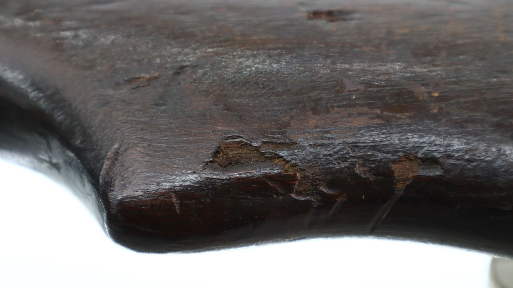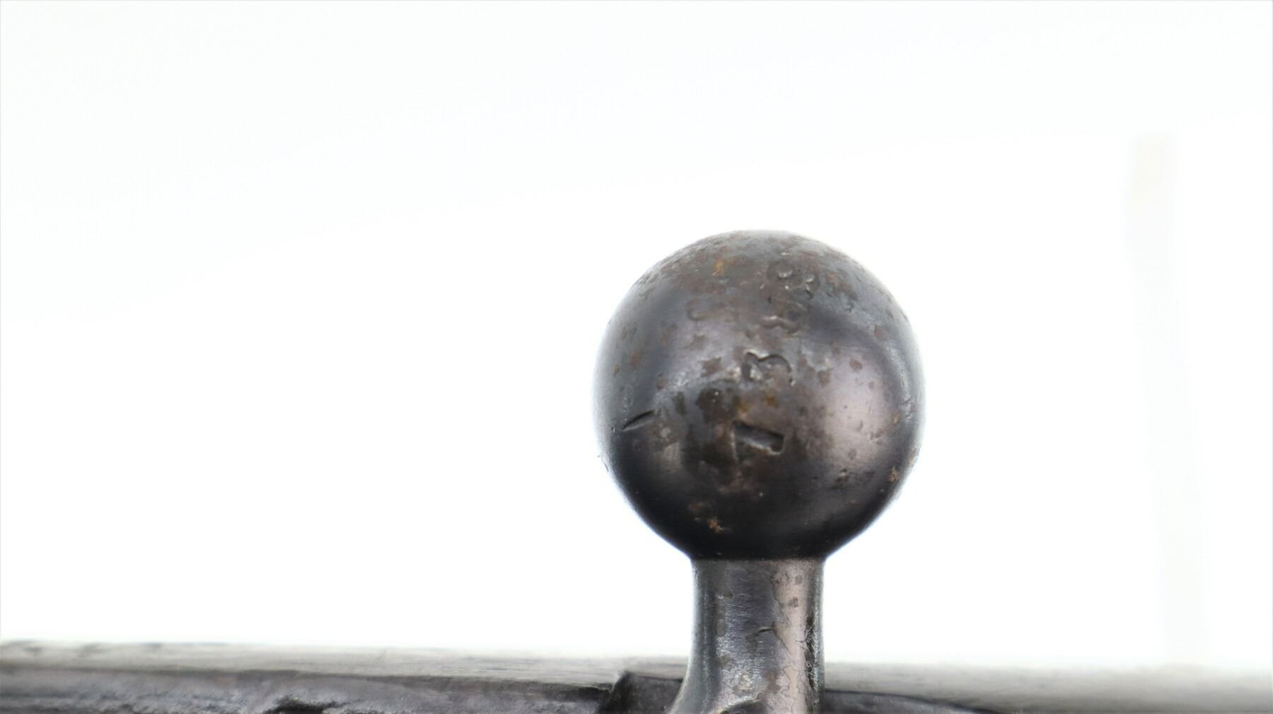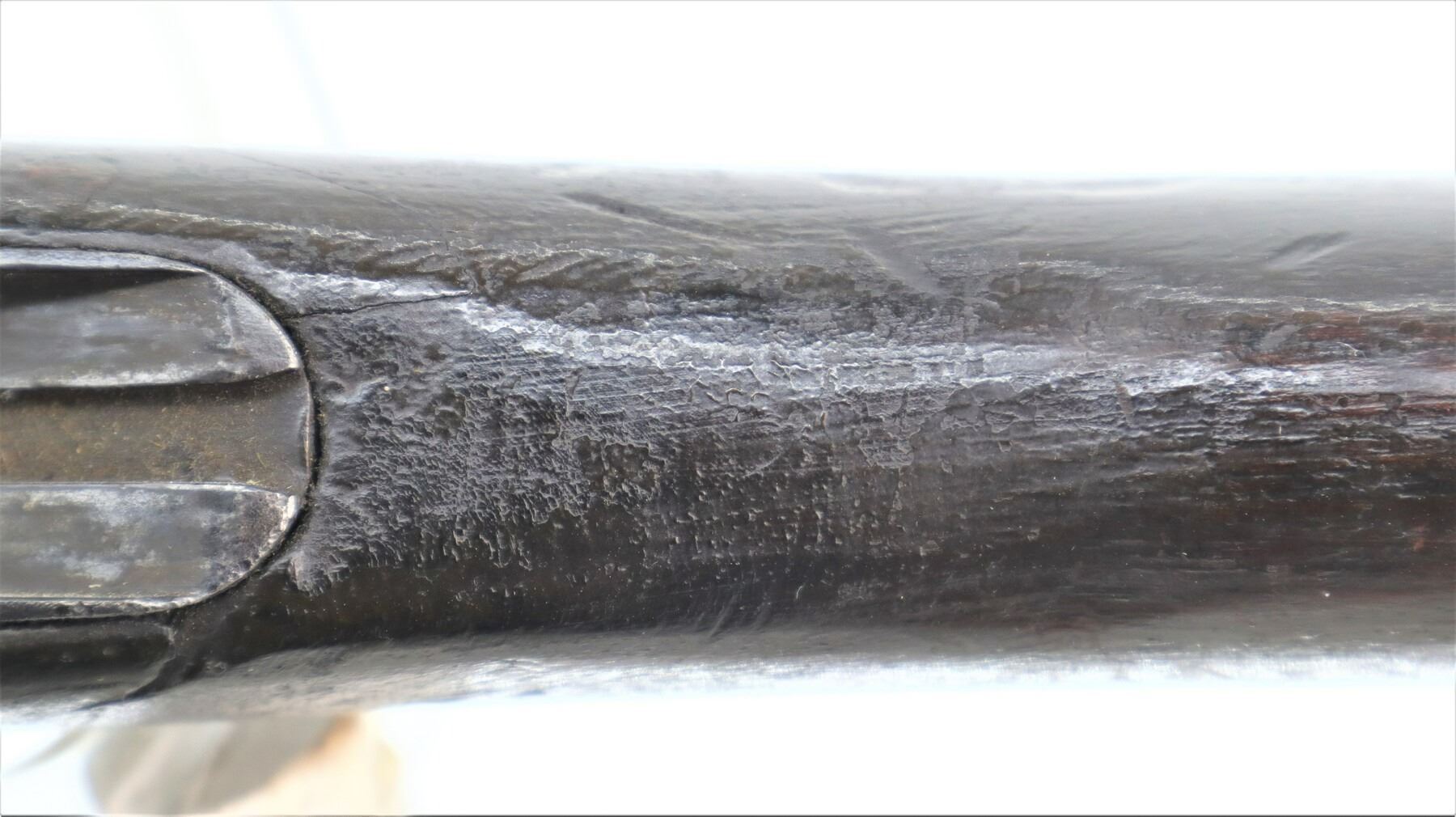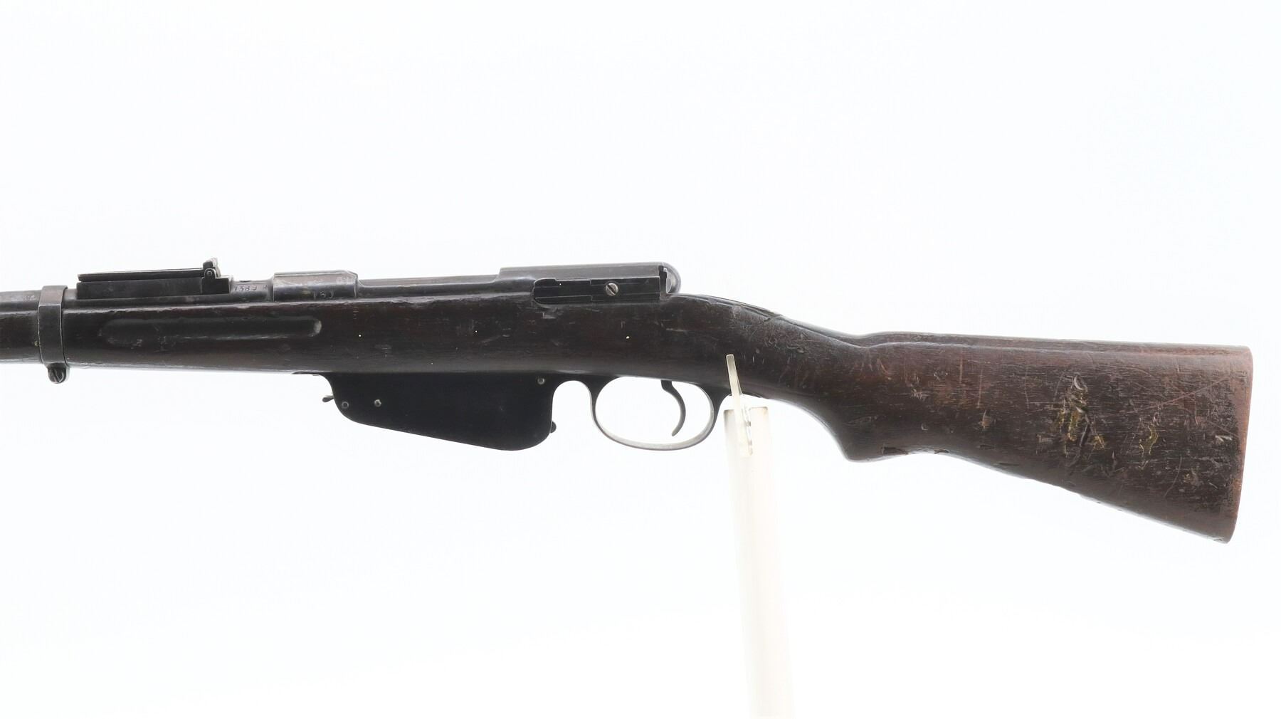 5/10, STEYR, MODEL: 1888, CALIBER:8 X 50R, BORE IS POOR, WORN, PITTED. BOLT MATCHES. MISSING FRONT SIGHT BLADE, RAMP PRESENT, U NOTCHED LADDER REAR SIGHT, MISSING SLIDE, SPRING BROKEN. CHAMBER HAS A HOLE DRILLED IN IT NOT FIREABLE. ONE PIECE FULL MILITARY WOOD STOCK, PISTOL GRIP, MISSING BUTT PLATE AND REAR SWIVEL, HAS FRONT SWIVEL, STACKING HOOK, BAYONET LUG. METAL FINISH SHOWS SOME LIGHT RUST, SCRATCHES, HANDLING MARKS AND WEAR. STOCK SHOW CRACKED BEHIND RECEIVER WITH DINGS, SCRATCHES AND WEAR. , ACTION: STRAIGHT PULL RIFLE, BARREL LENGTH: 30.25", SERIAL # 7389R, CONDITION: 5/10, CLASS: CANADIAN NON RESTRICTED