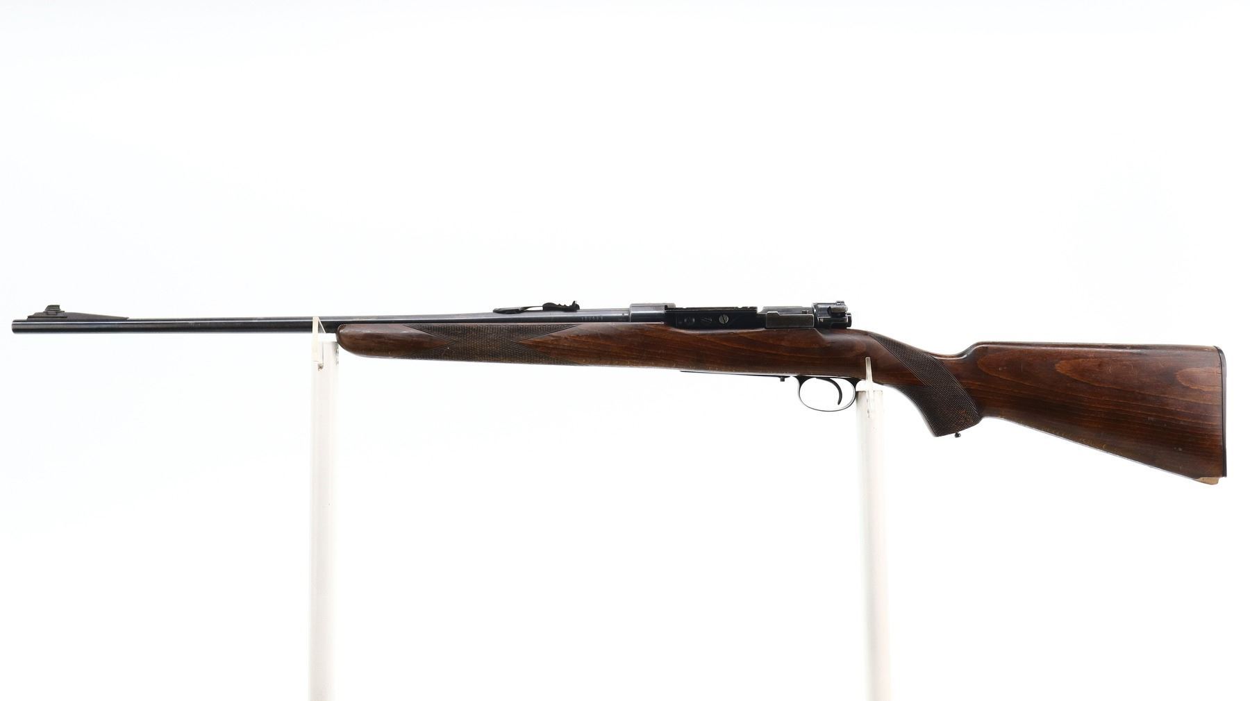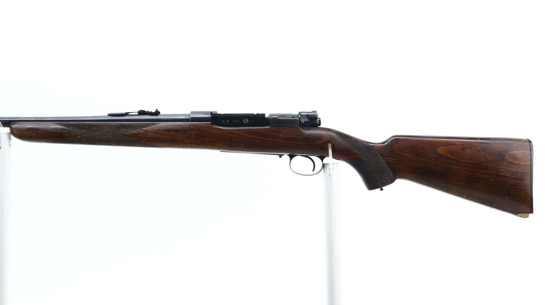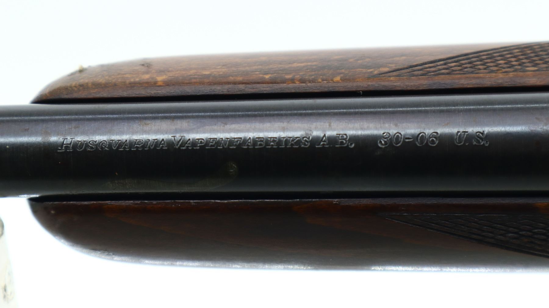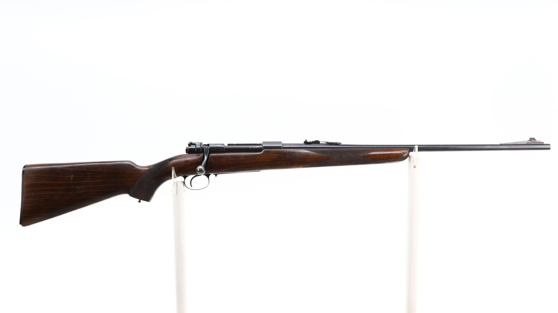 6/10, HUSQVARNA, MODEL: 98 SPORTER, CALIBER:30-06 SPRG, BORE IS GOOD. BLADE FRONT SIGHT WITH RAMP, ADJUSTABLE U NOTCHED REAR SIGHT, BLUED FINISH, RECEIVER DRILLED AND TAPPED ON TOP WITH UNKNOWN SCOPE BASE ON LEFT SIDE. ONE PIECE WOOD STOCK, CHECKERED FOREARM AND PISTOL GRIP, GROOVED BLACK POLYMER BUTT PLATE, STOCK AND BUTT PLATE CHIPPED AT TOE, MISSING GRIP CAP AND SWIVELS. METAL FINISH SHOWS SOME SCRATCHES, HANDLING MARKS AND WEAR. STOCK SHOWS SOME MARKS, SCRATCHES AND WEAR. , ACTION: BOLT ACTION RIFLE, BARREL LENGTH: 23.5", SERIAL # 132441, CONDITION: 6/10, CLASS: CANADIAN NON RESTRICTED
