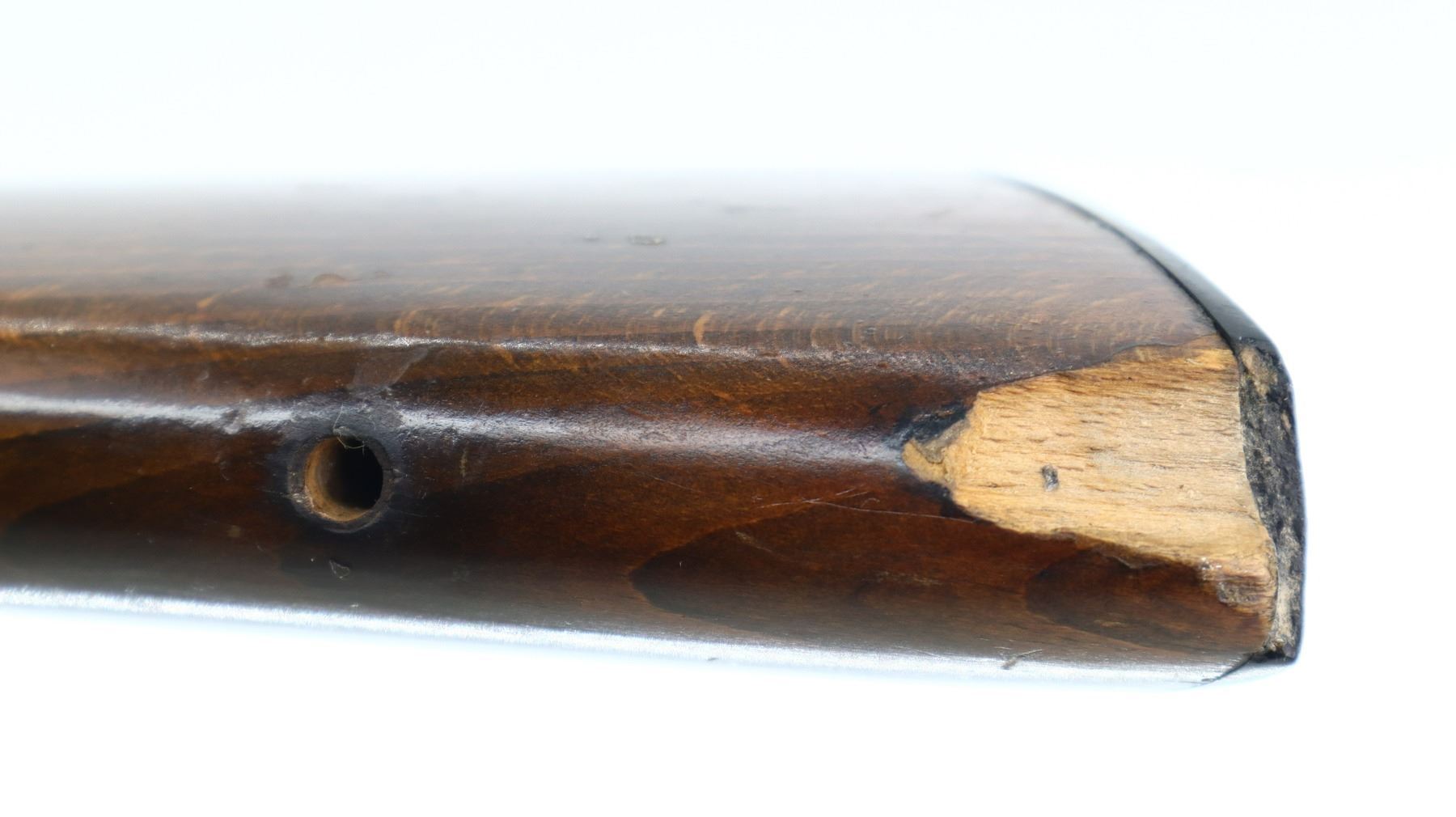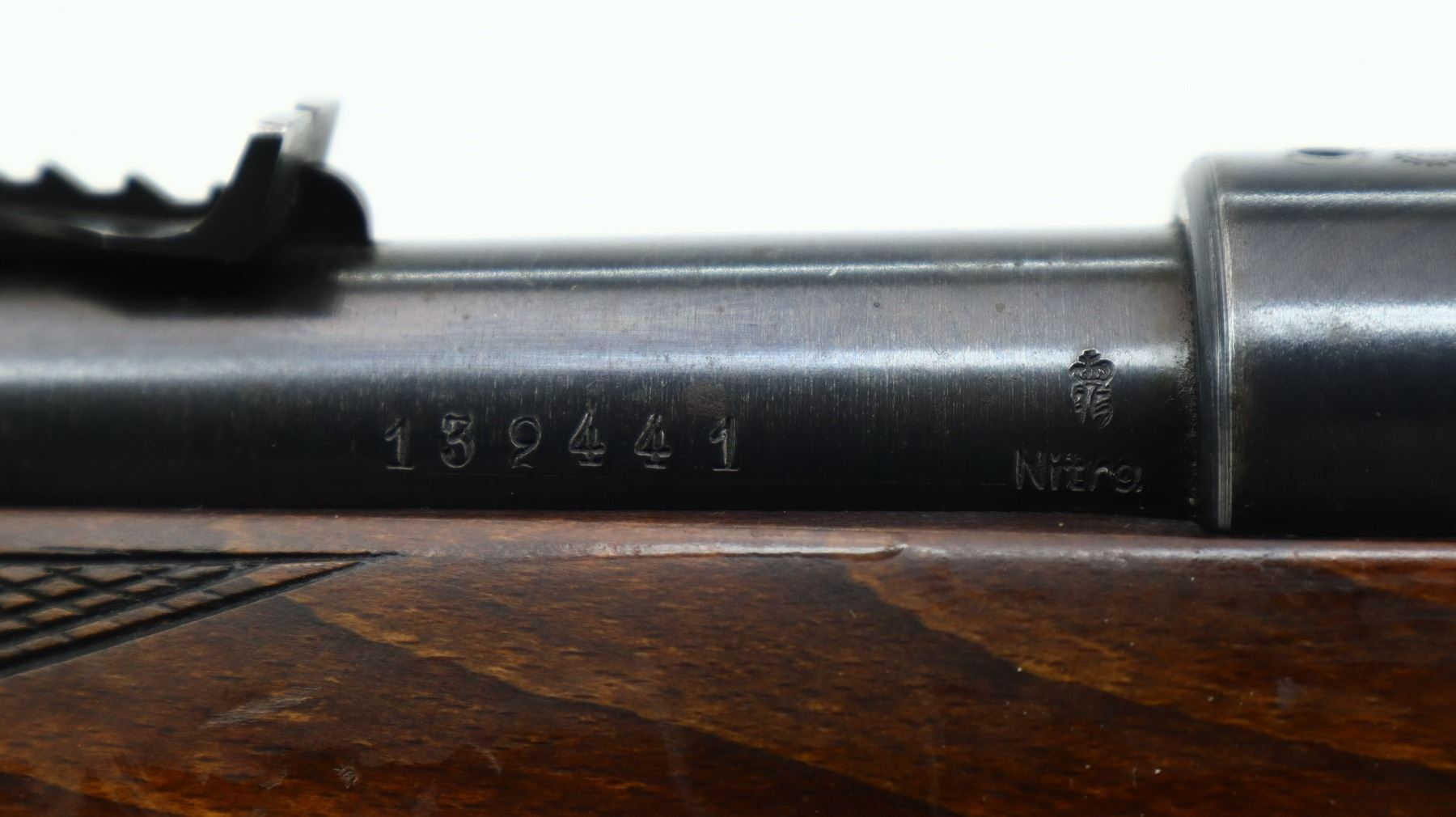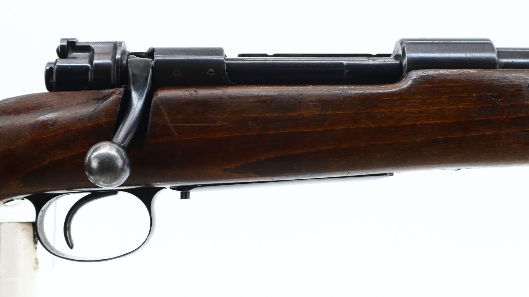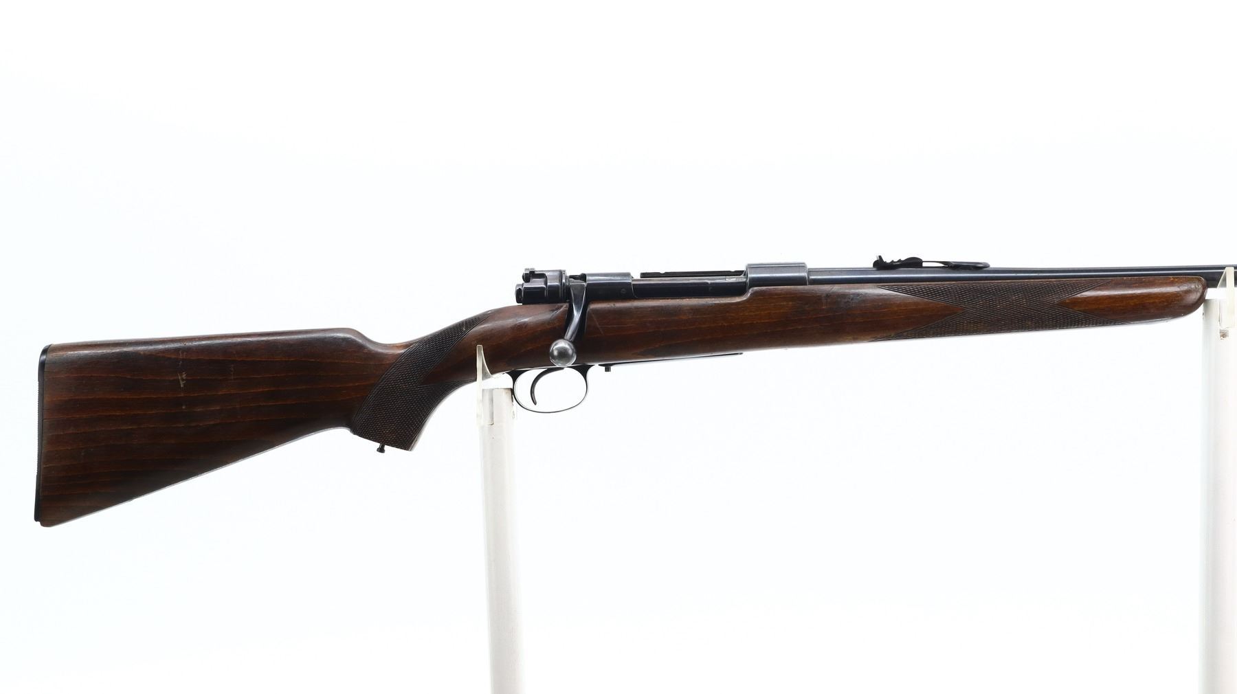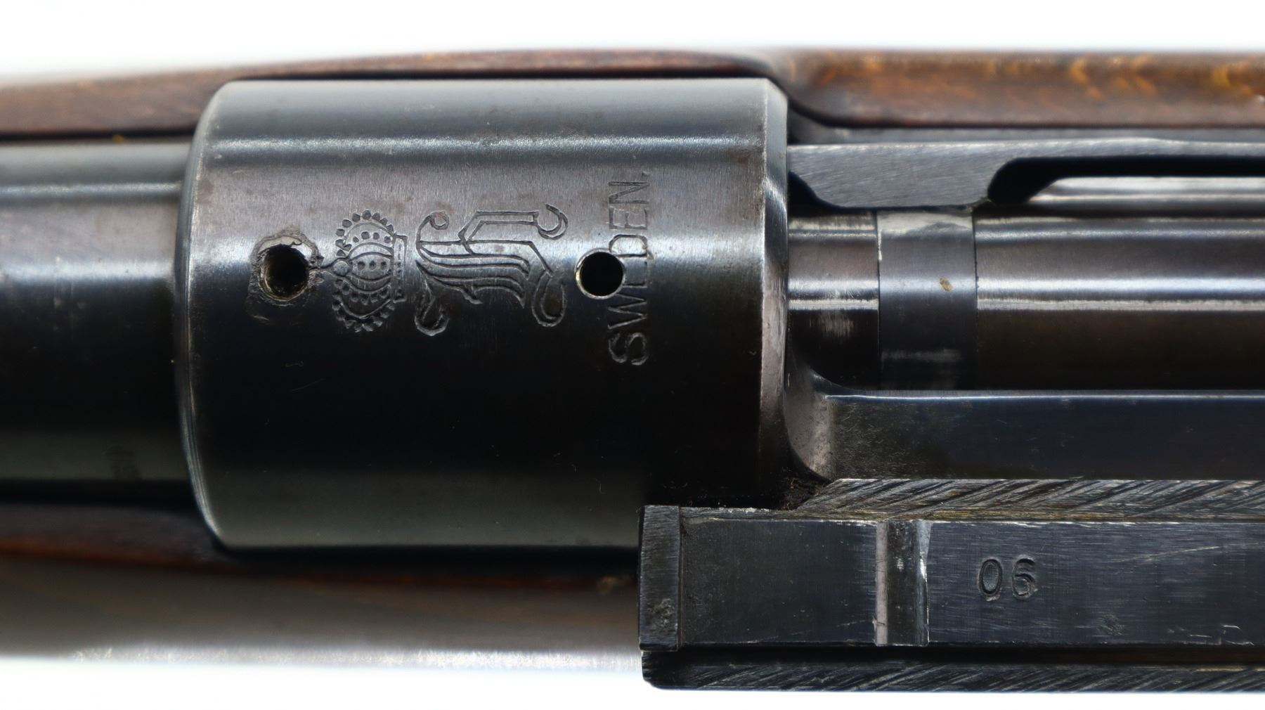 6/10, HUSQVARNA, MODEL: 98 SPORTER, CALIBER:30-06 SPRG, BORE IS GOOD. BLADE FRONT SIGHT WITH RAMP, ADJUSTABLE U NOTCHED REAR SIGHT, BLUED FINISH, RECEIVER DRILLED AND TAPPED ON TOP WITH UNKNOWN SCOPE BASE ON LEFT SIDE. ONE PIECE WOOD STOCK, CHECKERED FOREARM AND PISTOL GRIP, GROOVED BLACK POLYMER BUTT PLATE, STOCK AND BUTT PLATE CHIPPED AT TOE, MISSING GRIP CAP AND SWIVELS. METAL FINISH SHOWS SOME SCRATCHES, HANDLING MARKS AND WEAR. STOCK SHOWS SOME MARKS, SCRATCHES AND WEAR. , ACTION: BOLT ACTION RIFLE, BARREL LENGTH: 23.5", SERIAL # 132441, CONDITION: 6/10, CLASS: CANADIAN NON RESTRICTED