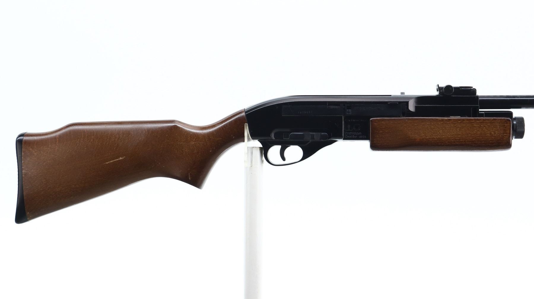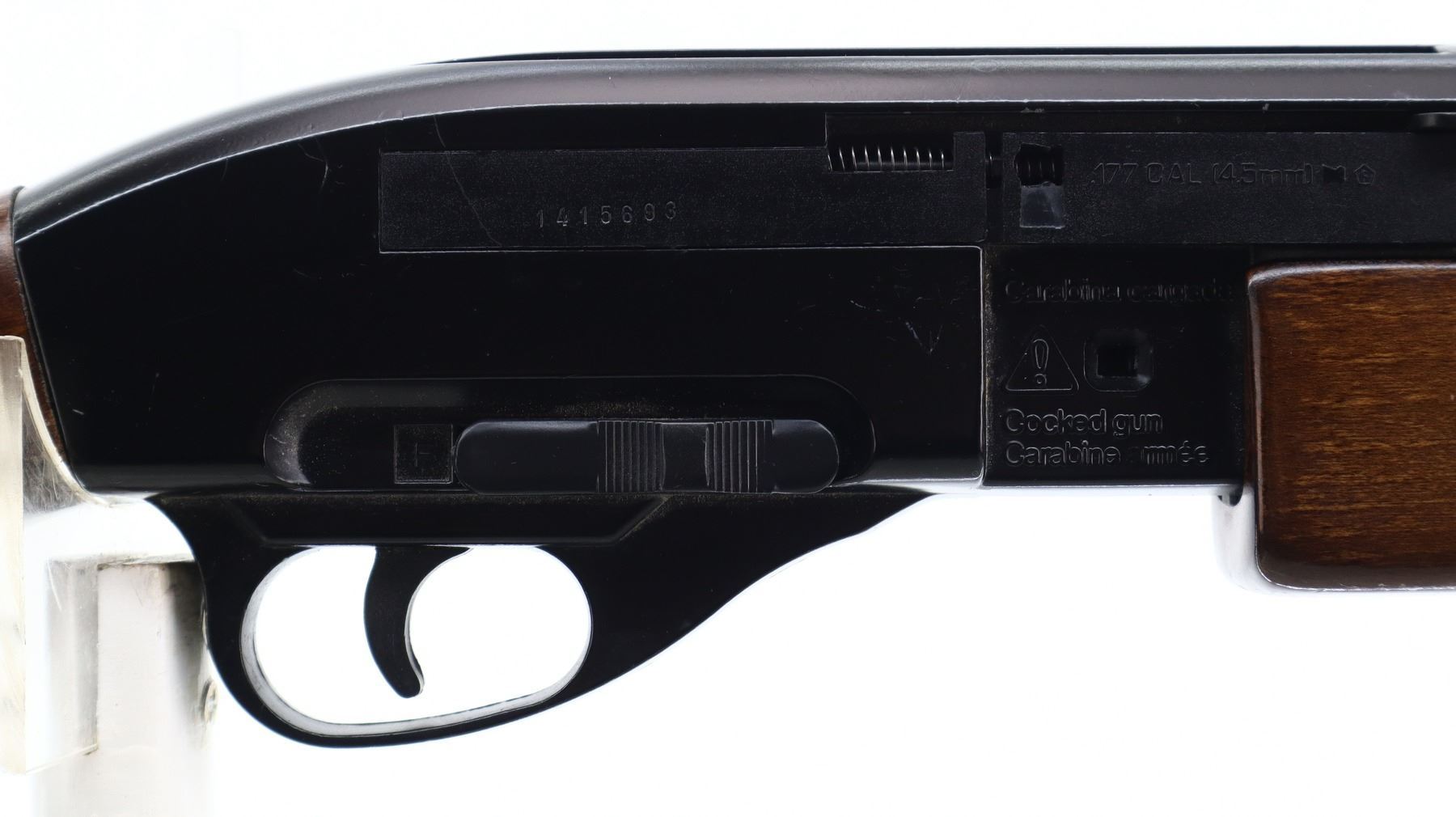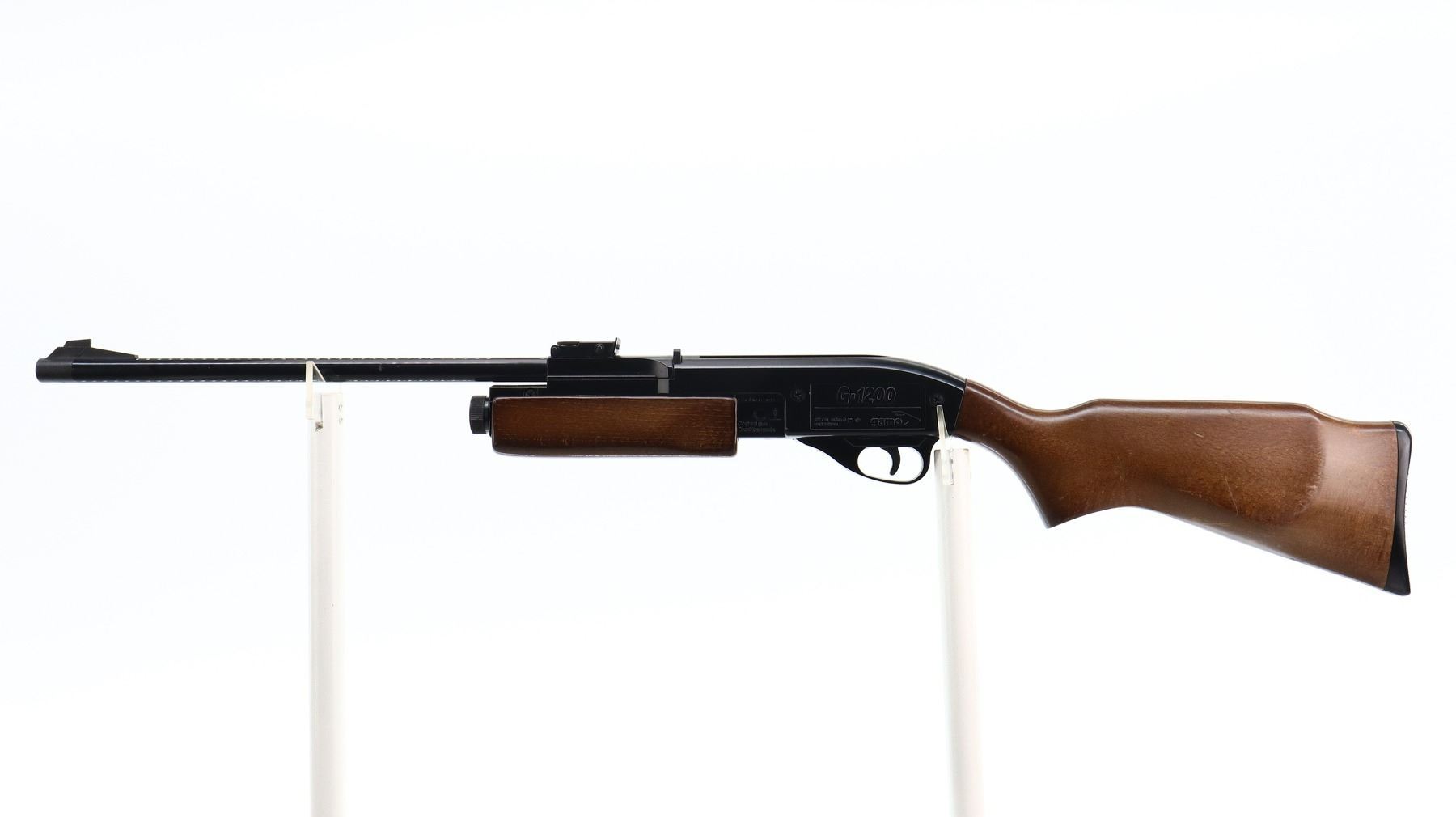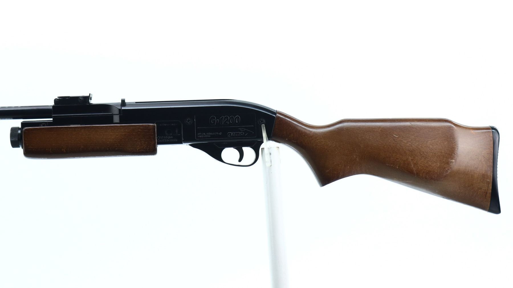 7/10, GAMO, MODEL: G1200, CALIBER:.177 PELLET, BORE IS GOOD. BLADE FRONT SIGHT WITH RAMP, ADJUSTABLE U NOTCHED REAR SIGHT, RECEIVER GROOVED FOR SCOPE MOUNT. TWO PIECE SMOOTH WOOD STOCKS, PISTOL GRIP, CHEEK REST, GROOVED BLACK POLYMER BUTT PLATE, METAL FINISH SHOWS SOME SCRATCHES, HANDLING MARKS AND WEAR. STOCKS SHOW SOME MARKS, SCRATCHES AND WEAR. , ACTION: AIR RIFLE, BARREL LENGTH: 18", SERIAL # 1415693, CONDITION: 7/10, CLASS: CANADIAN NON RESTRICTED