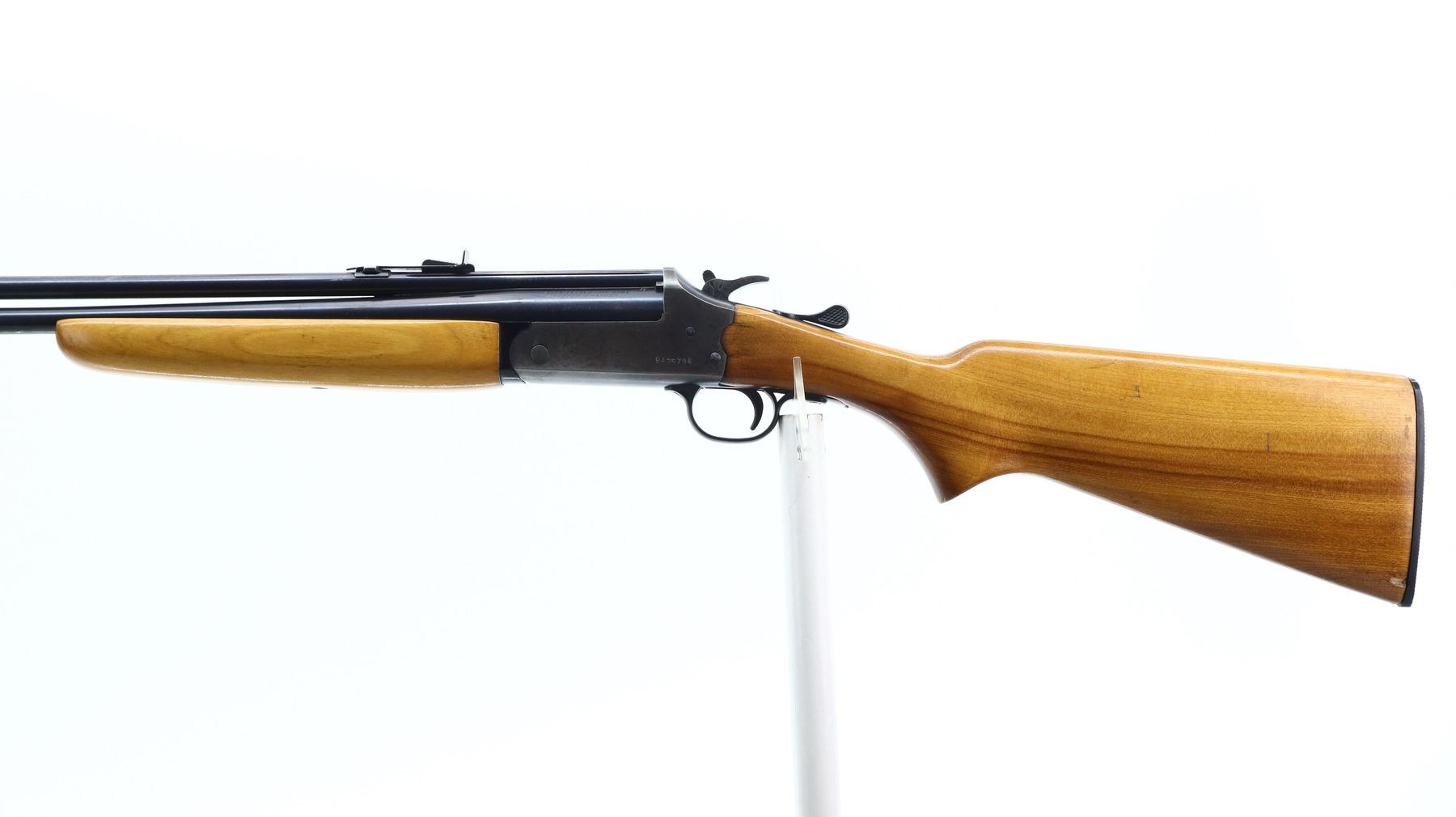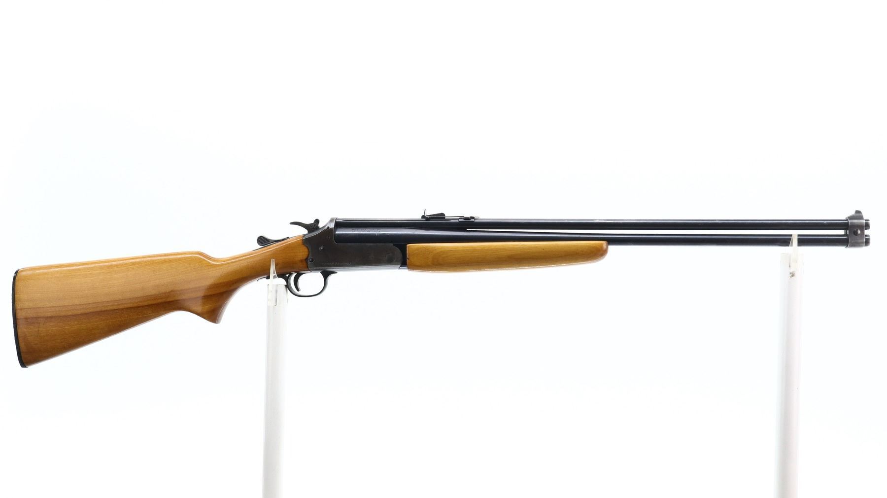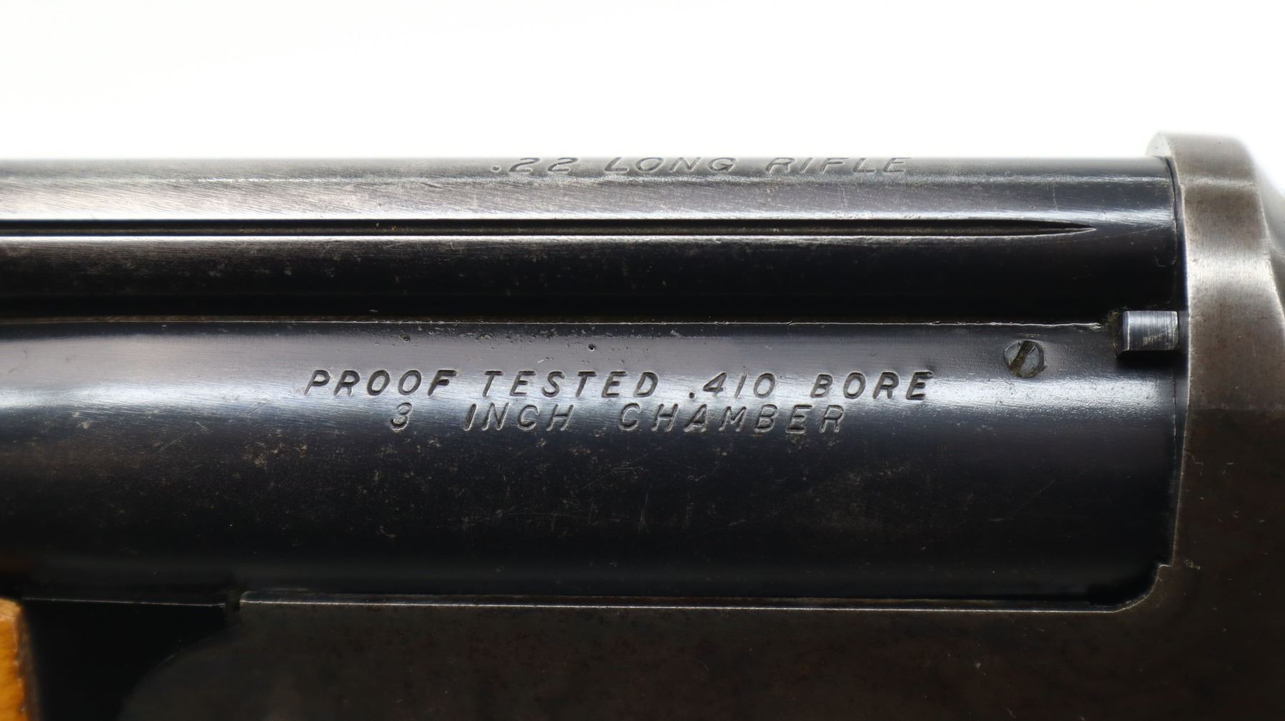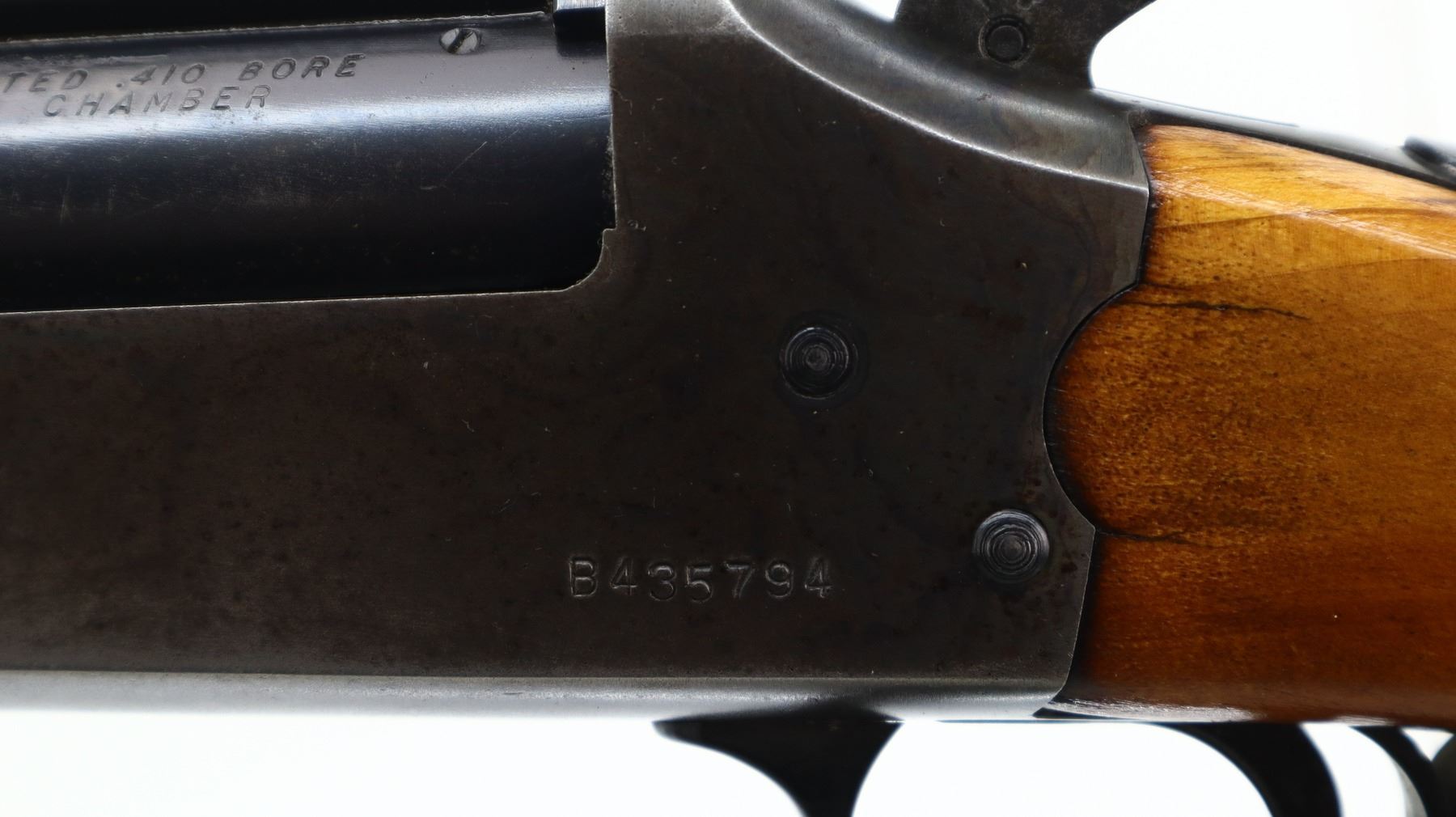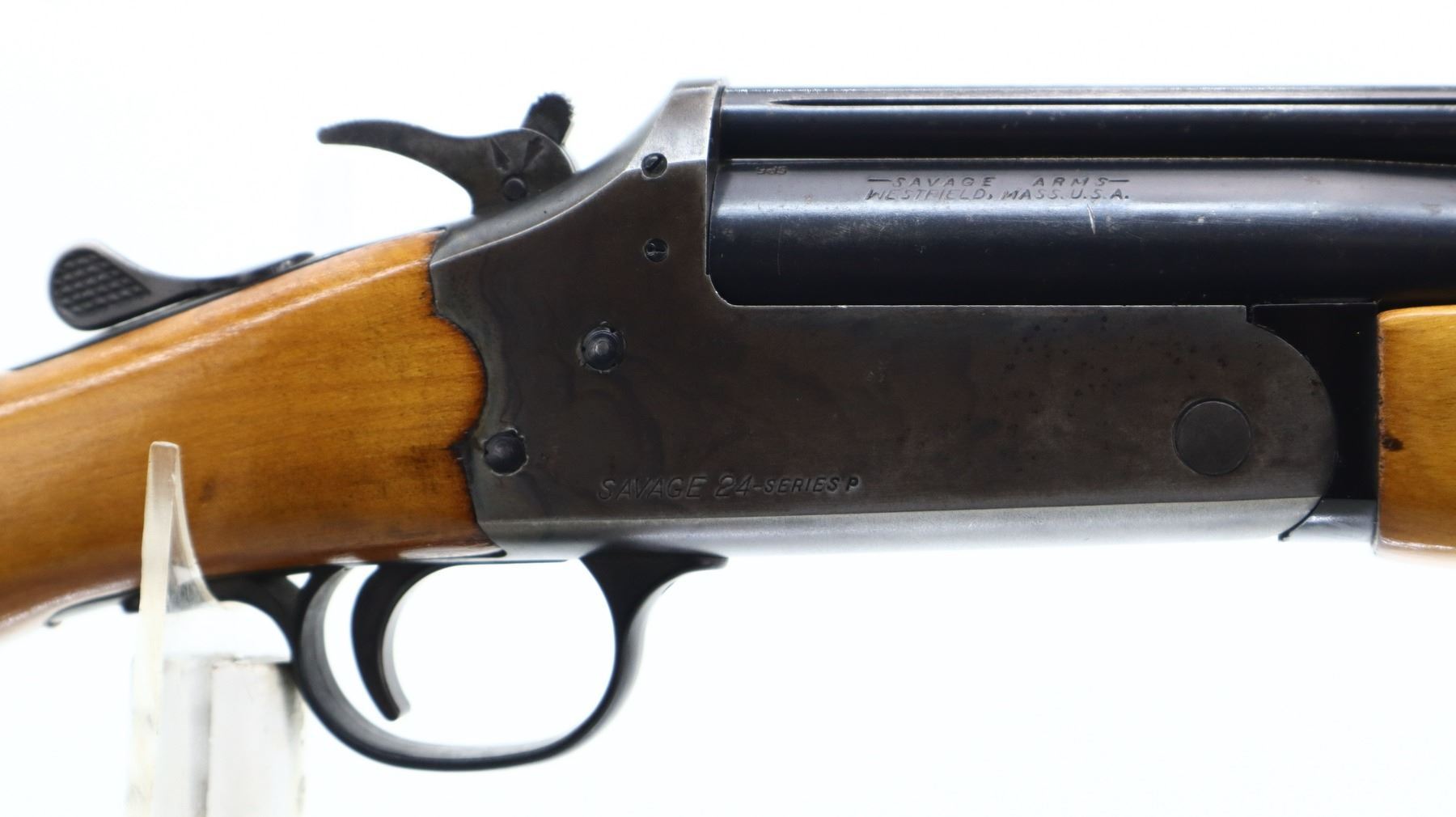 6/10, SAVAGE, MODEL: 24P, CALIBER:22 LR / 410 G X 3", BORES ARE GOOD, SHINY. FIXED MOD CHOKE. BLADE FRONT SIGHT, ADJUSTABLE U NOTCHED REAR SIGHT, BARREL GROOVED FOR SCOPE MOUNT, BARREL SELECTOR ON HAMMER, HAS EXTRACTOR. TWO PIECE SMOOTH WOOD STOCKS, PISTOL GRIP (CRACKED BEHIND RECEIVER), CHECKERED BLACK POLYMER BUTT PLATE, STOCK CRACKED AND REPAIRED AT TOE. METAL FINISH SHOWS SCRATCHES, HANDLING MARKS AND WEAR. STOCKS SHOW MARKS, SCRATCHES AND WEAR. , ACTION: HINGED COMBINATION GUN, BARREL LENGTH: 24", SERIAL # B435794, CONDITION: 6/10, CLASS: CANADIAN NON RESTRICTED