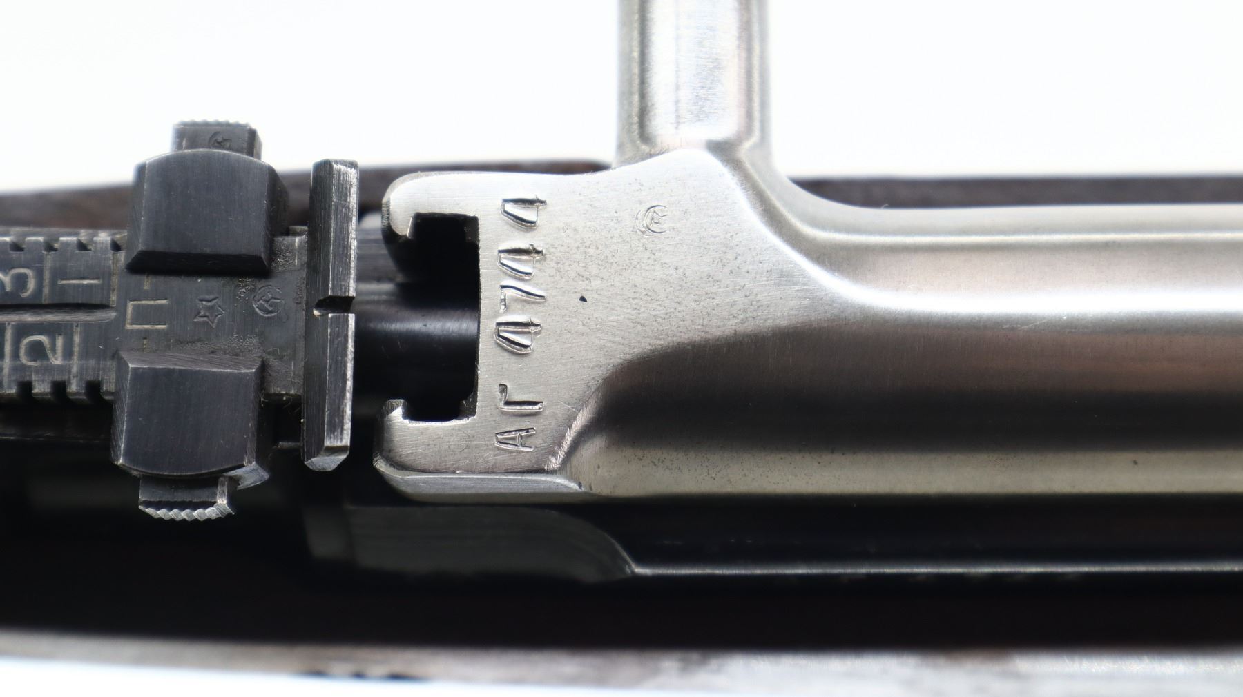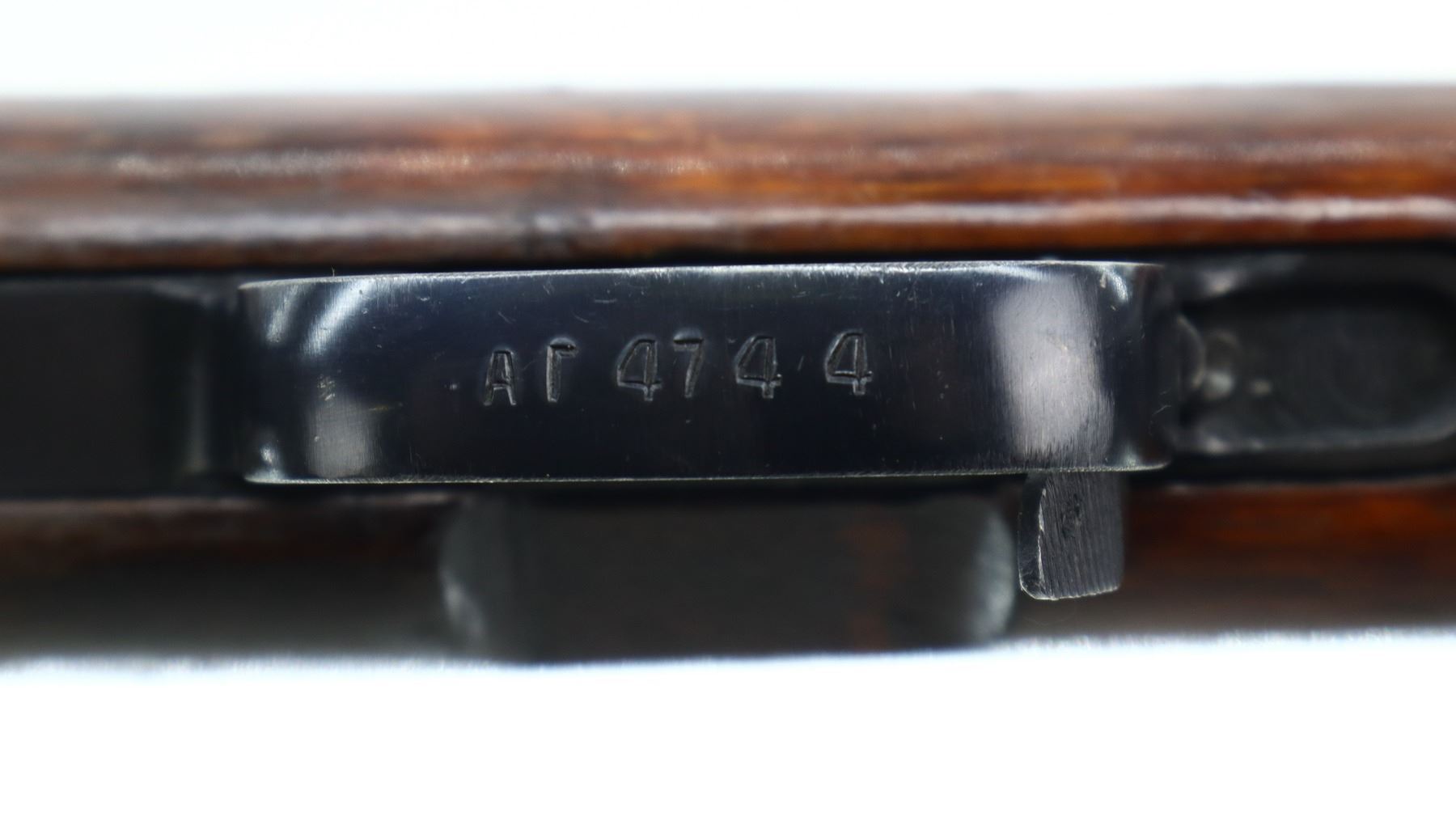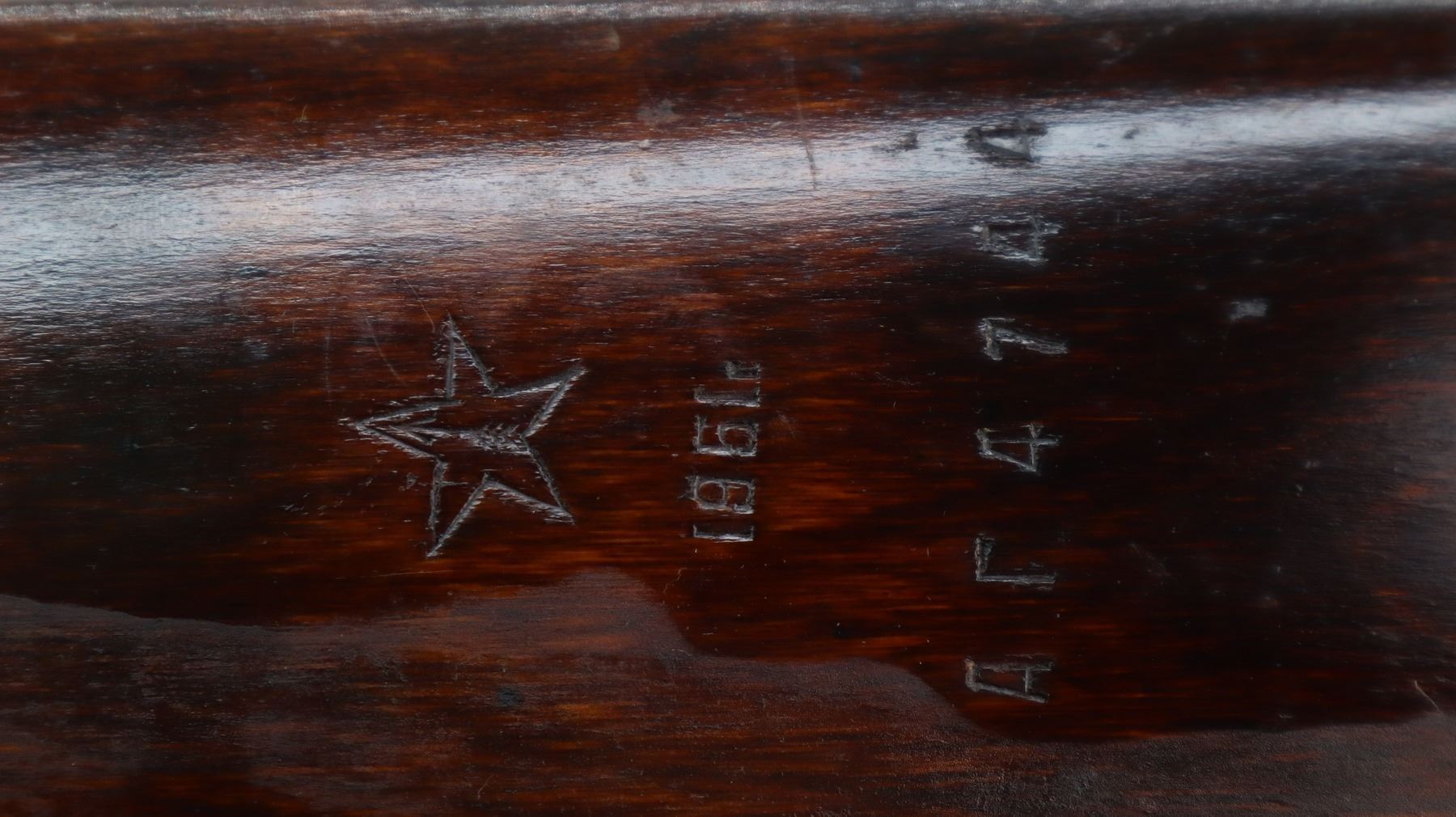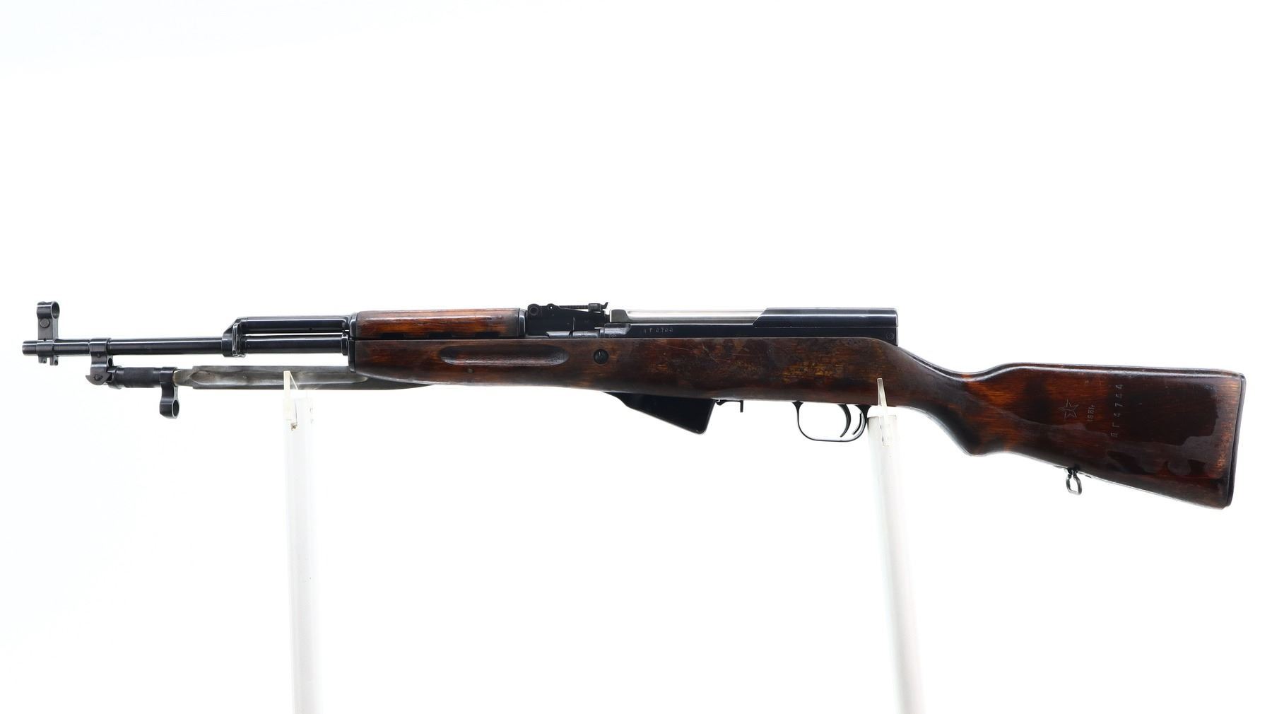 6/10, RUSSIAN SIMONOV, MODEL: SKS, CALIBER:7.62 X 39, BORE IS FAIR, WORN, LIGHT PITTING. MANUFACTURED BY TULA 1951, VISIBLE NUMBERS MATCH EXCEPT MAGAZINE. POST FRONT SIGHT WITH HOOD AND RAMP, ADJUSTABLE U NOTCHED REAR SIGHT, BLUED FINISH, SILVER BOLT AND CARRIER. TWO PIECE FULL MILITARY WOOD STOCKS, FINGER GROOVED FOREND, PISTOL GRIP, SMOOTH STEEL BUTT PLATE WITH TRAP AND CLEANING KIT. MISSING CLEANING ROD, HAS A ATTACHED FOLDING BLADE BAYONET. METAL FINISH SHOWS SOME SCRATCHES, HANDLING MARKS AND WEAR. STOCKS SHOW SOME MARKS, SCRATCHES AND FINISH WEAR. , ACTION: SEMI AUTOMATIC RIFLE, BARREL LENGTH: 20.5", SERIAL # AR4744, CONDITION: 6/10, CLASS: CANADIAN NON RESTRICTED
